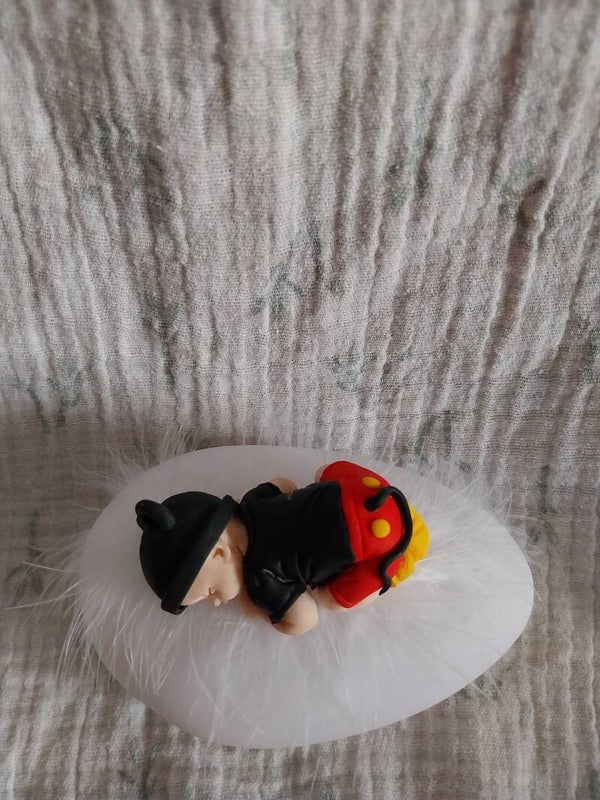 Veilleuse led galet avec bébé fimo garçon en vêtements déguisé en souris.
