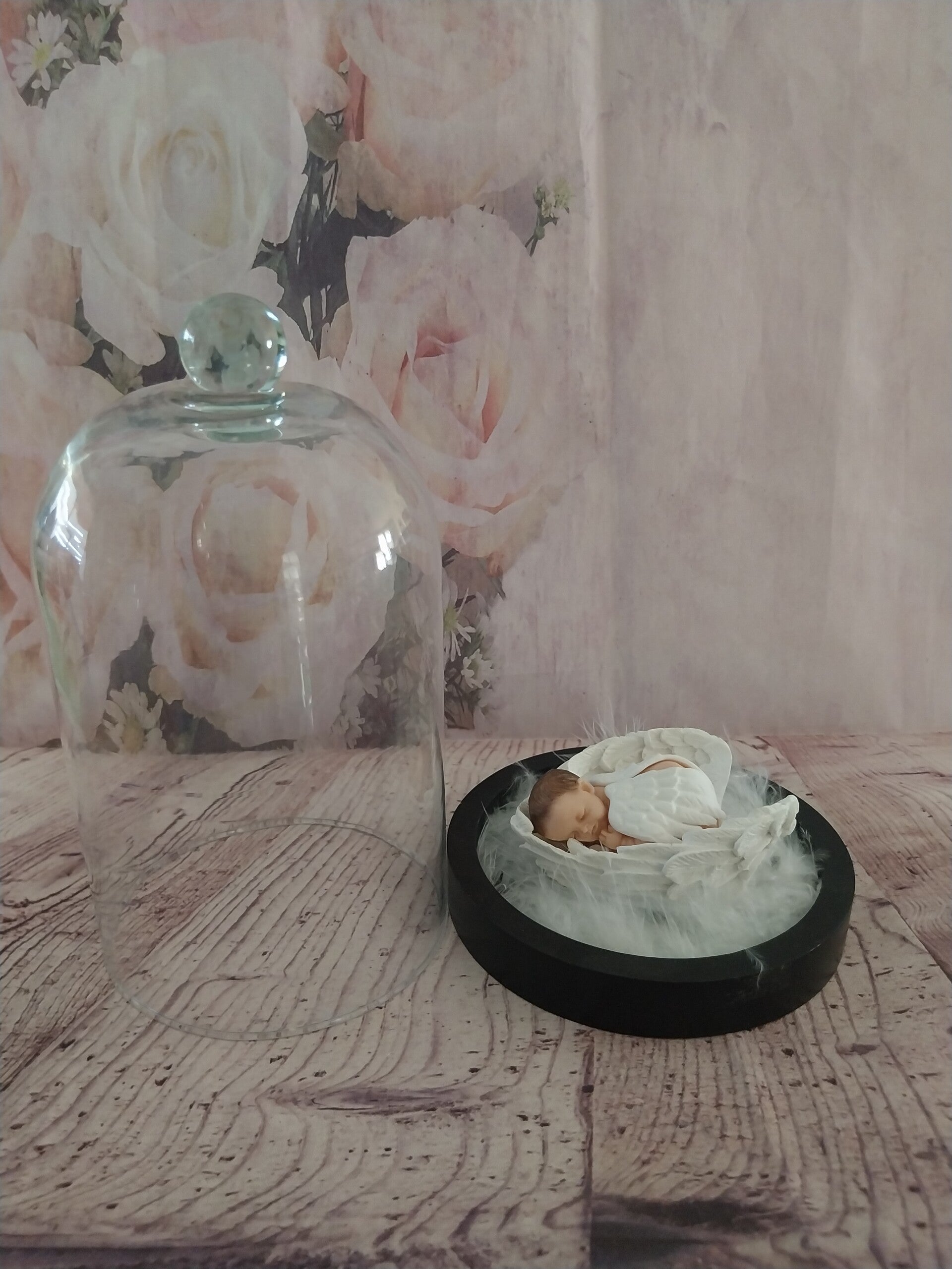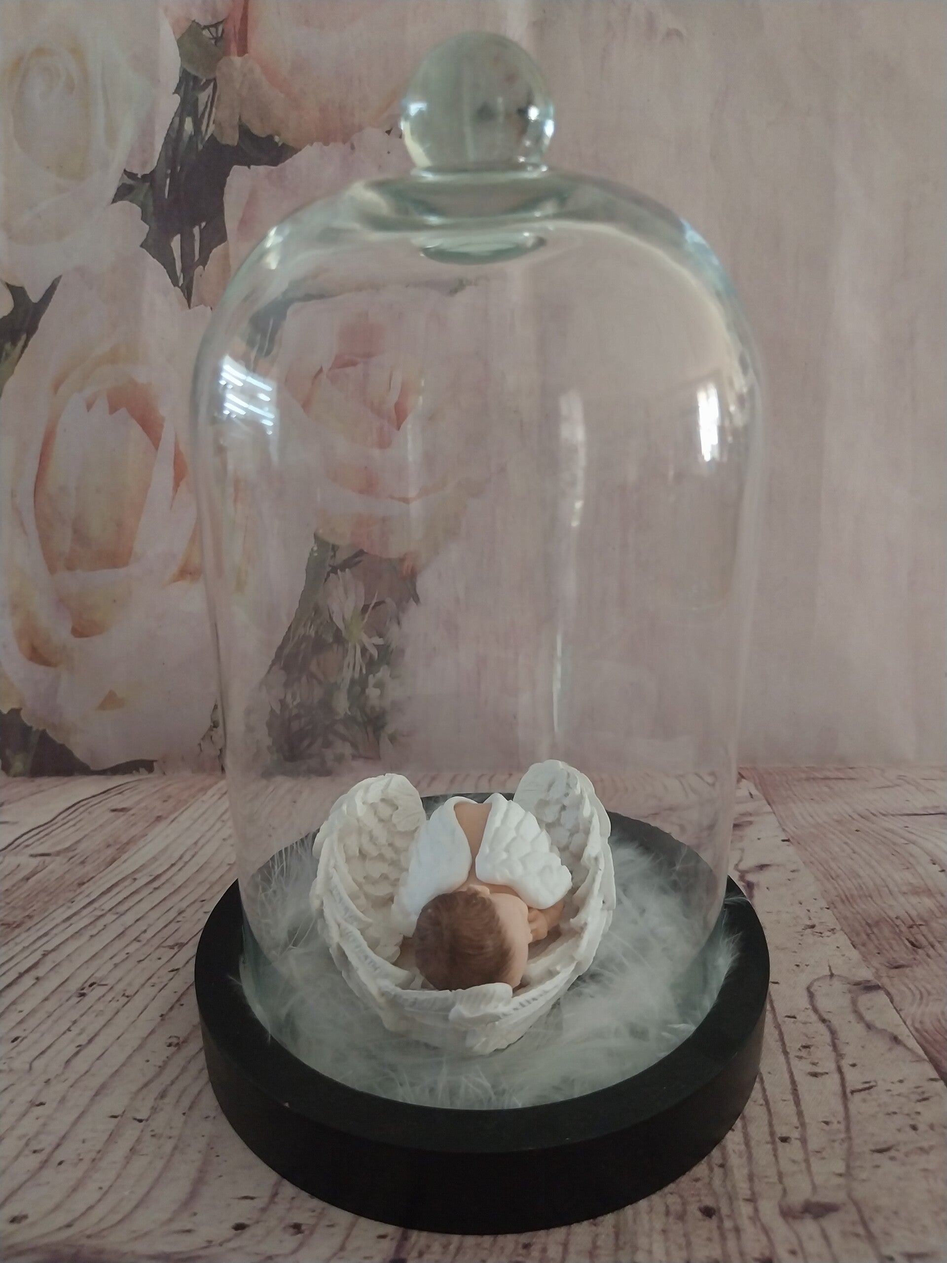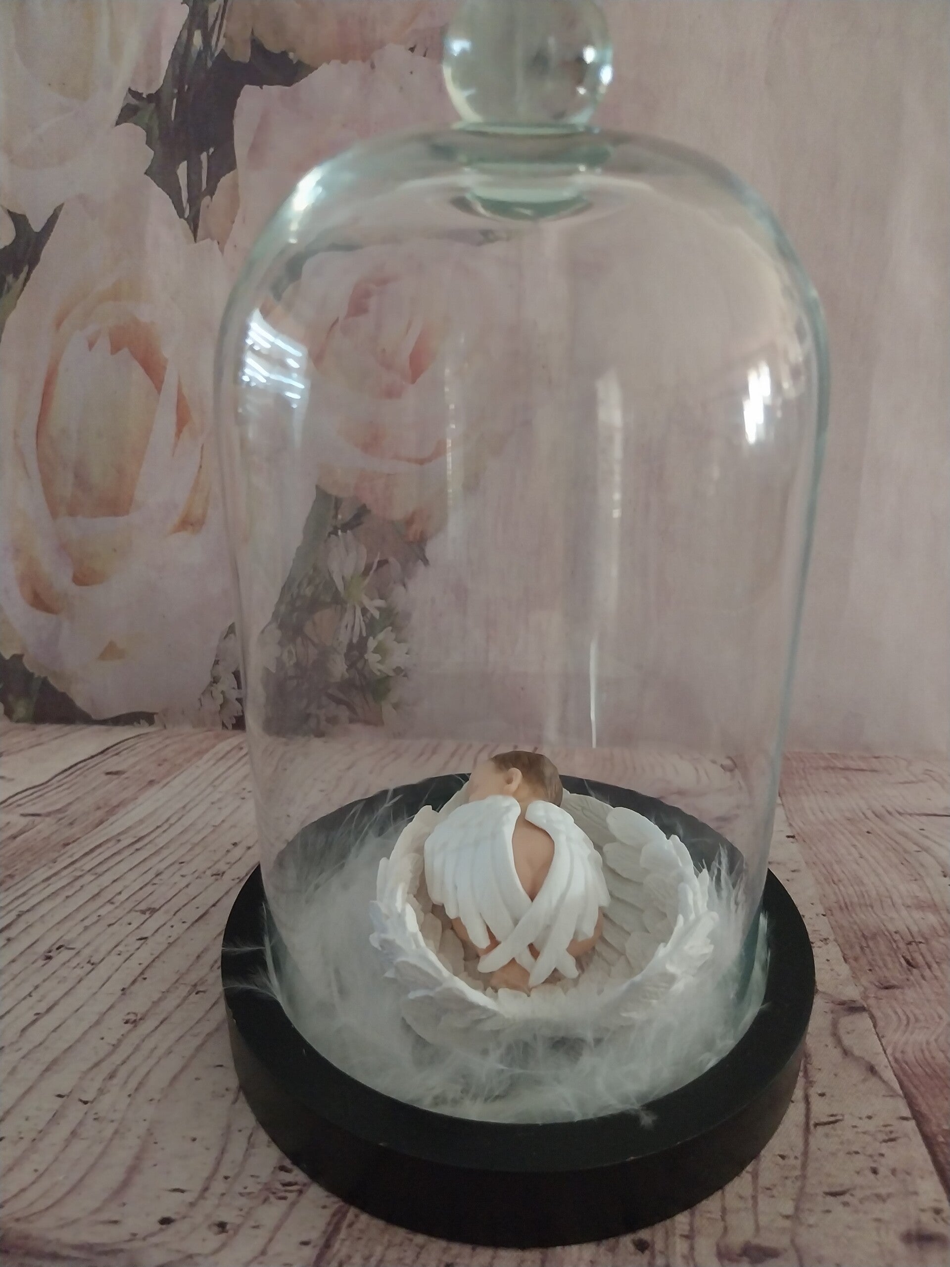Bébé fimo ange dans des grands ailes à l'intérieur d'une cloche en verre sur socle noir en bois