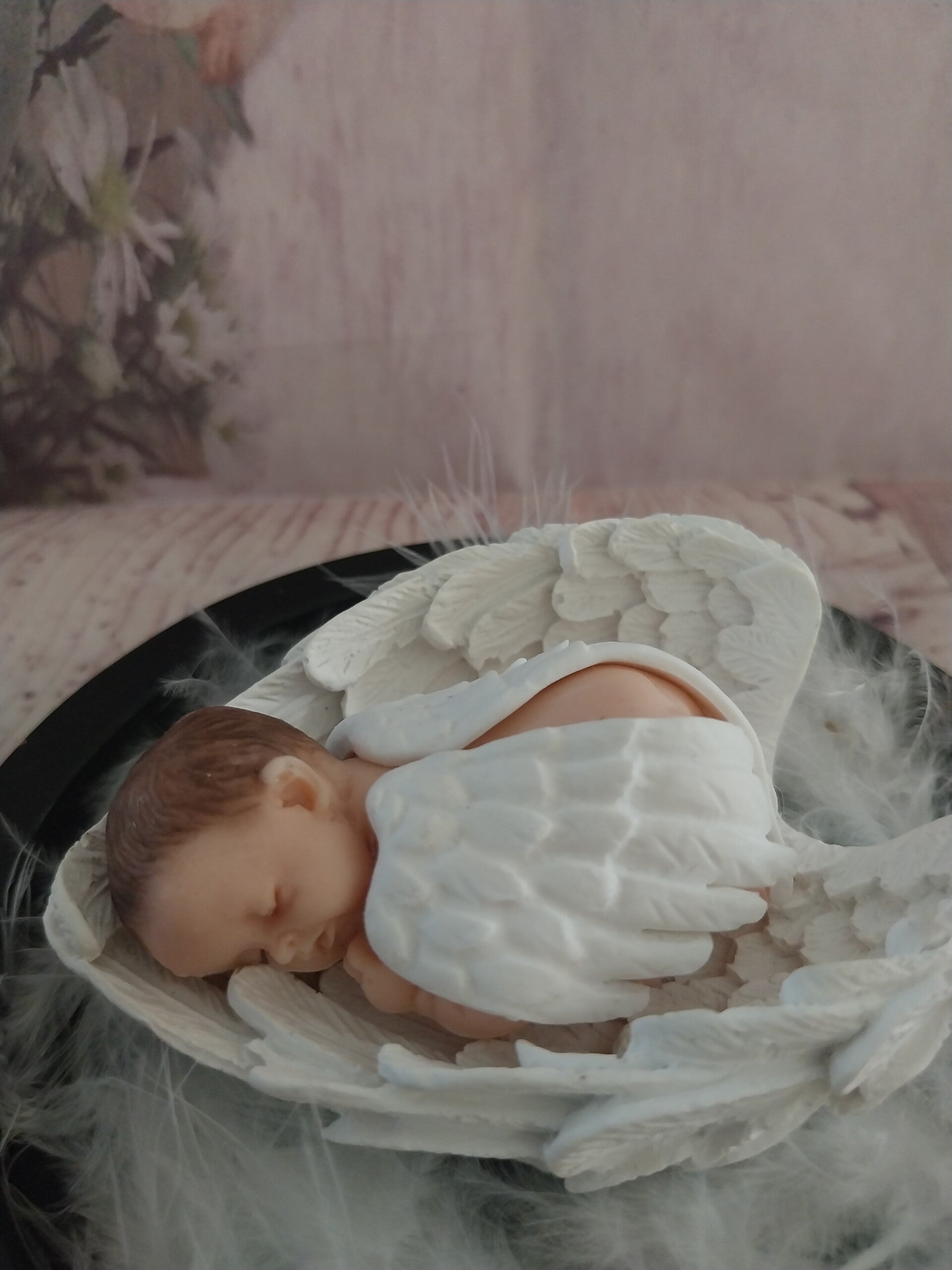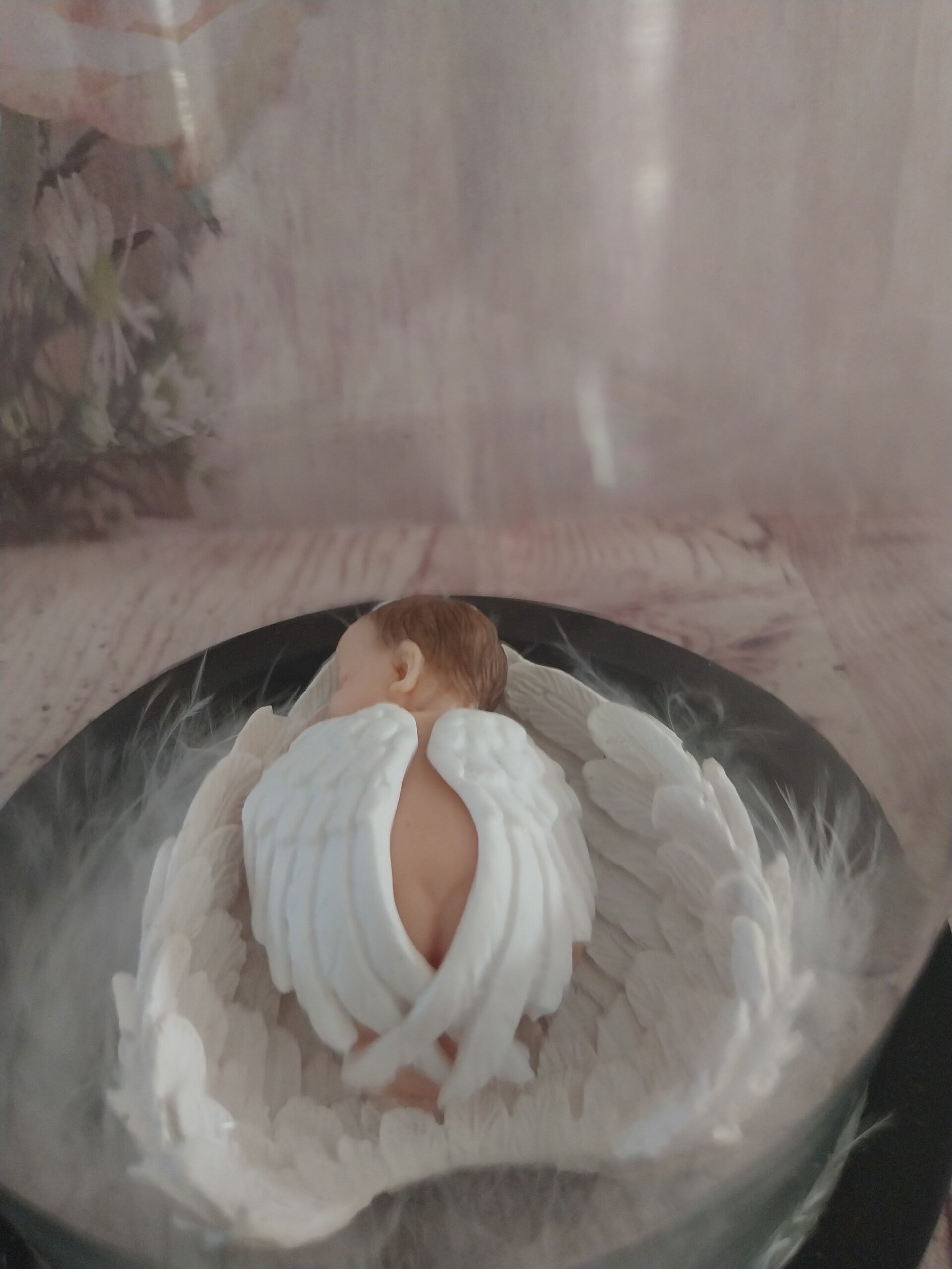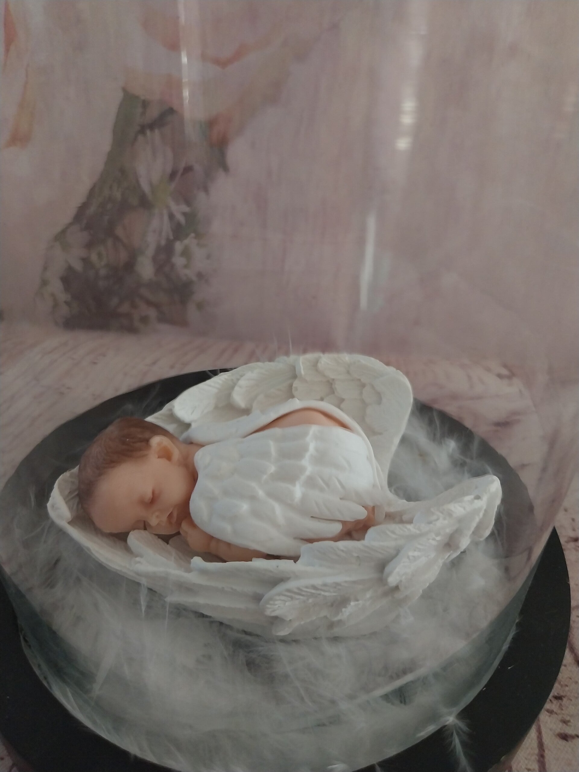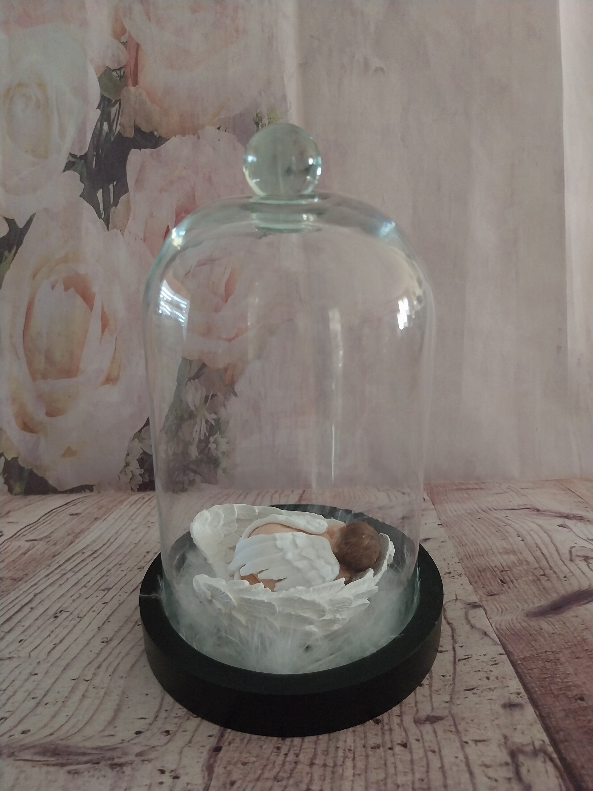 Bébé fimo ange dans des grands ailes à l'intérieur d'une cloche en verre sur socle noir en bois