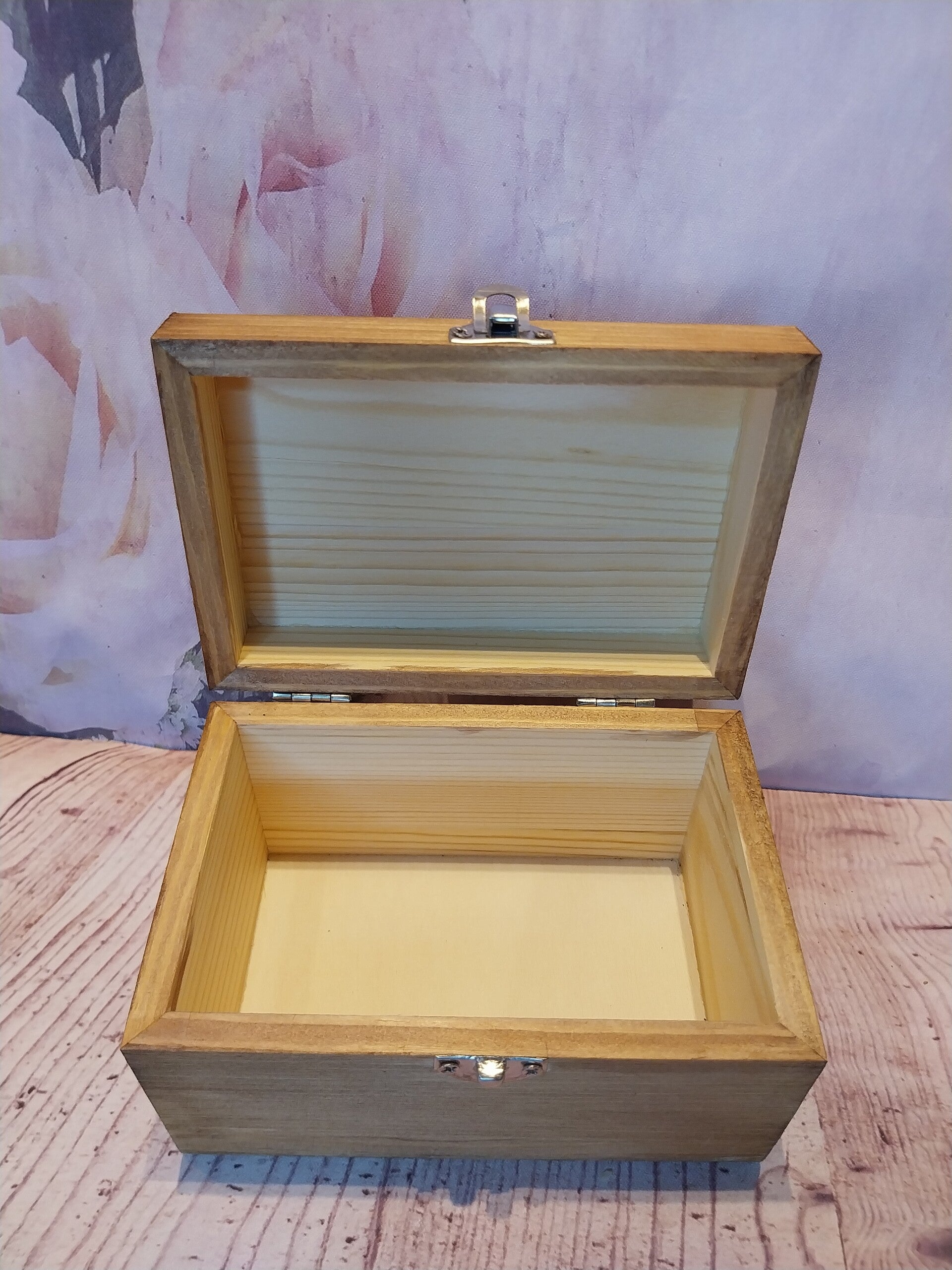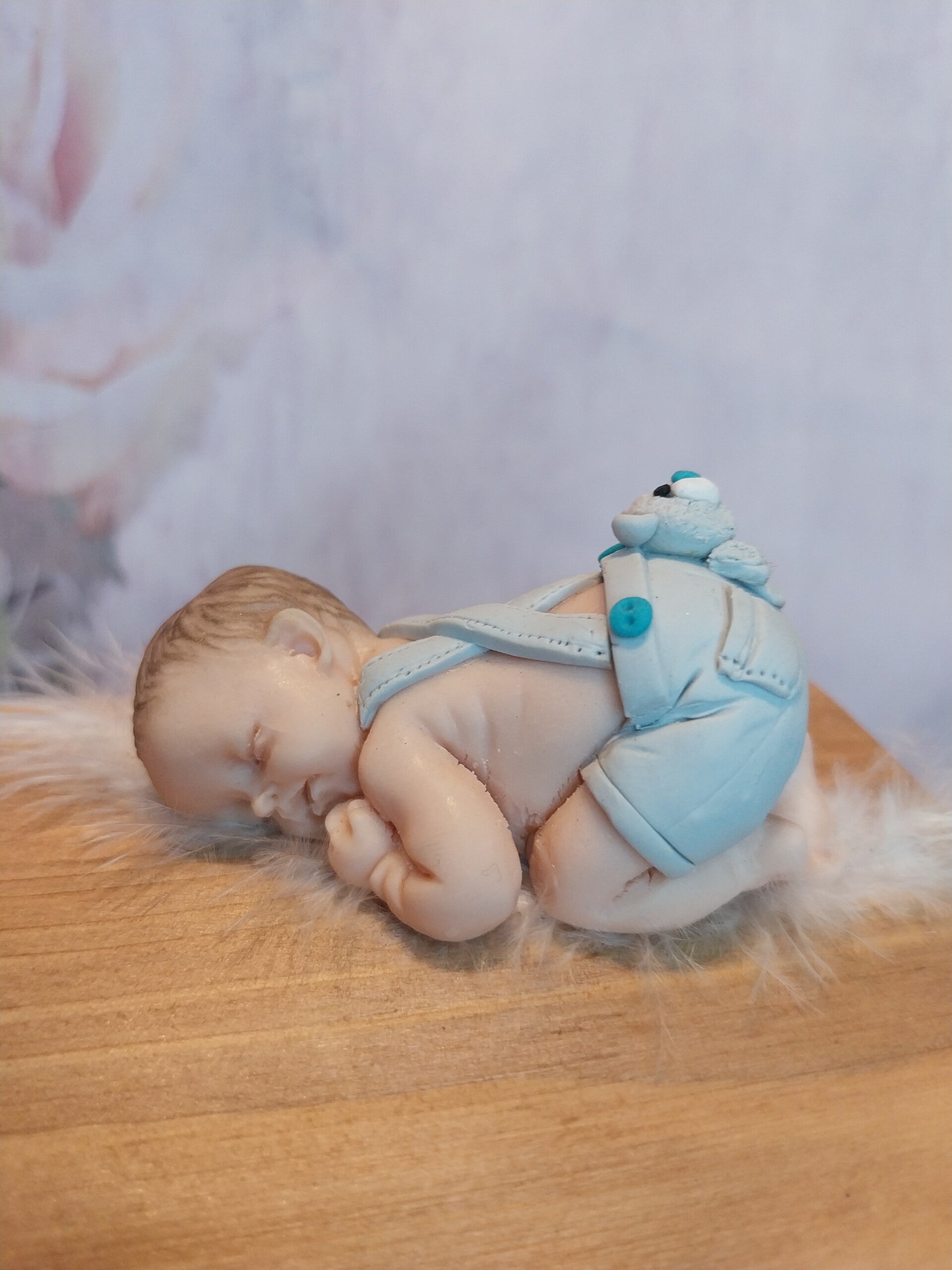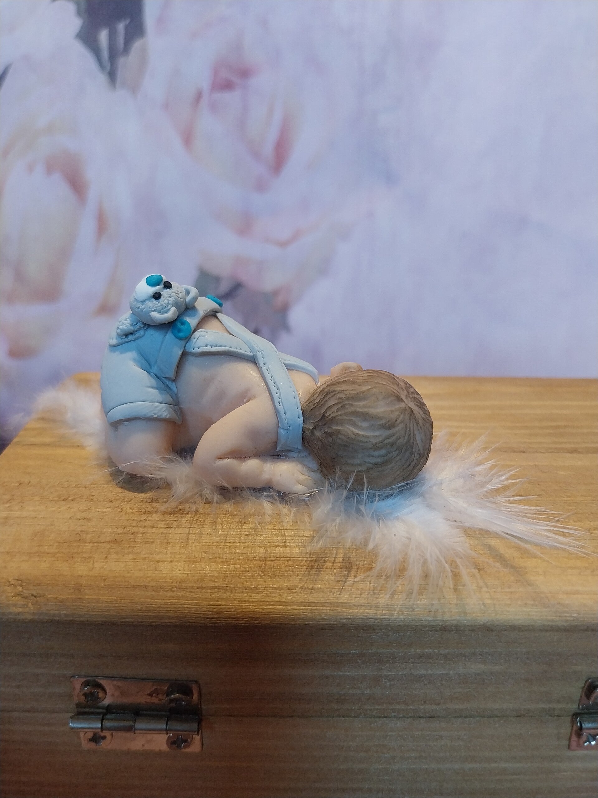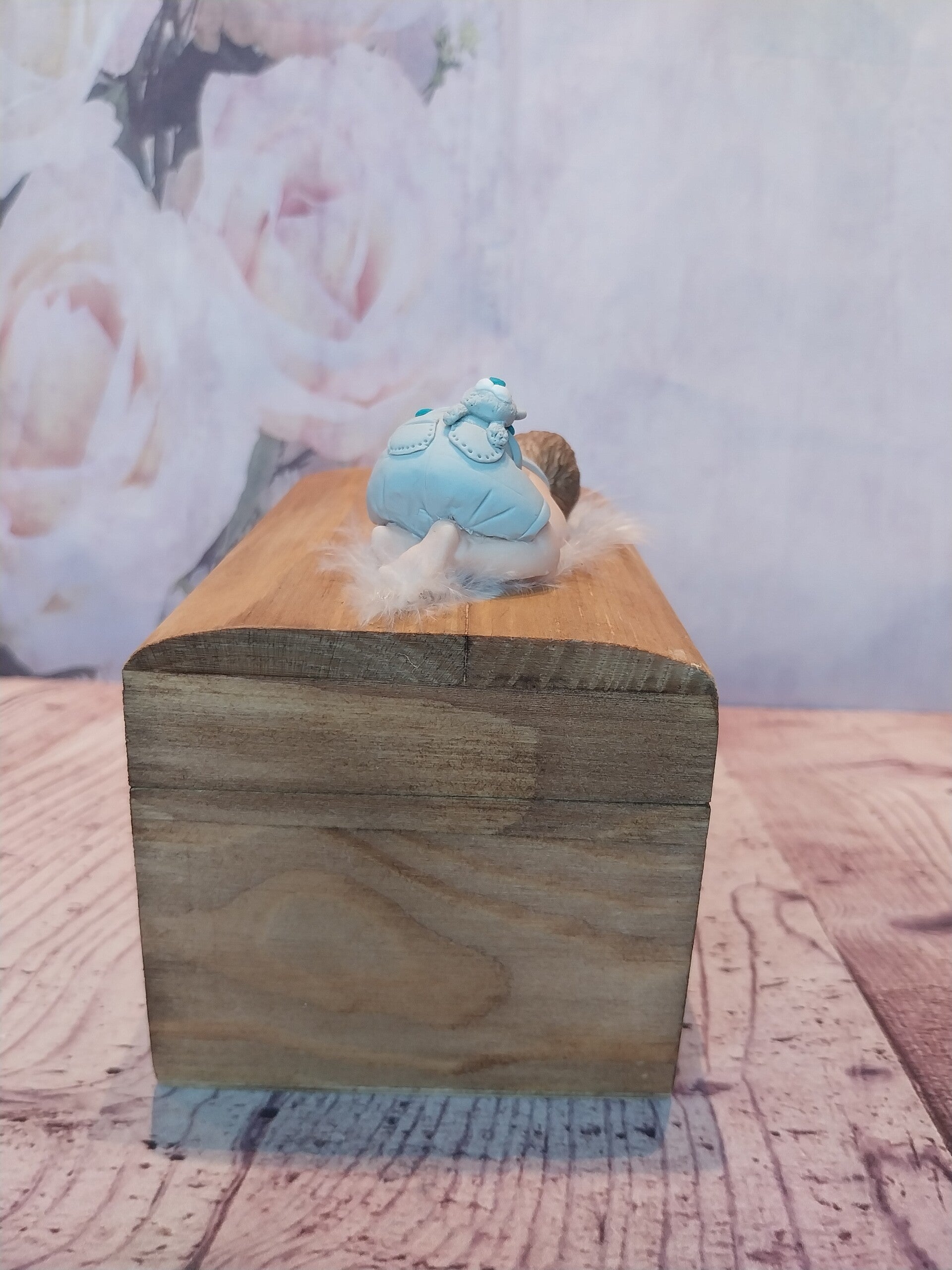 Boîte en bois avec bébé fimo garçon en salopette gris avec son nounours dans sa poche arrière