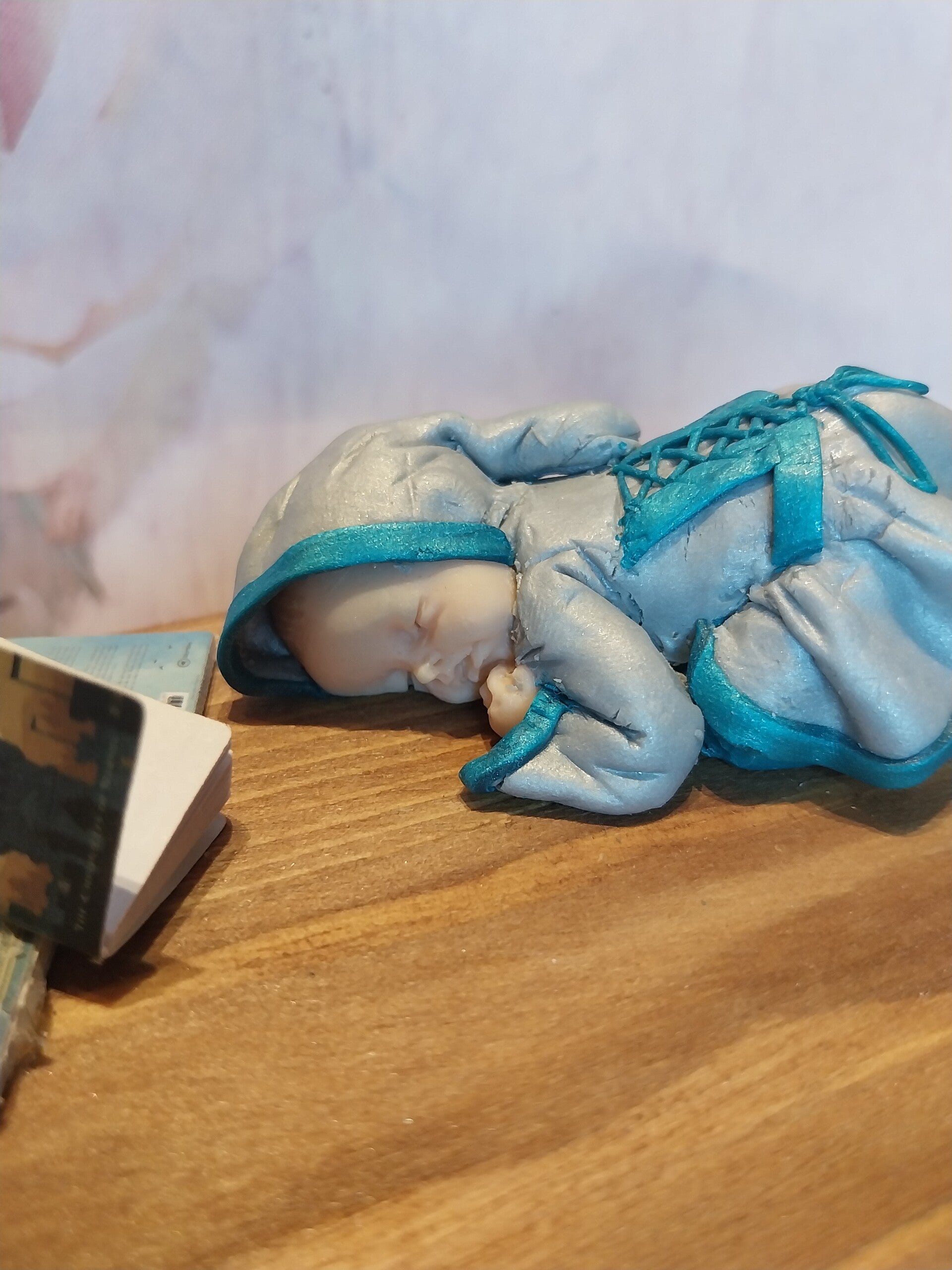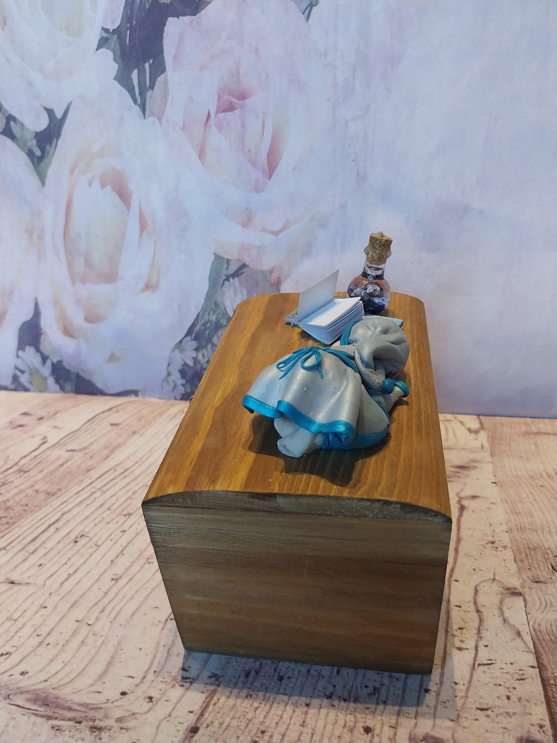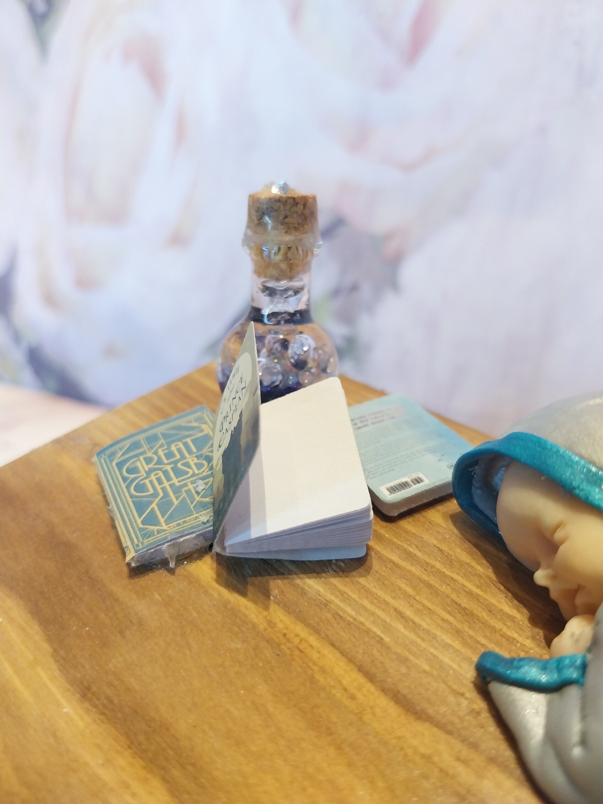 Bébé fimo fille en robe gris et turquoise avec des miniature livres et 1 potion magique (la fiole est remplie de résine et fermé avec de la résine)