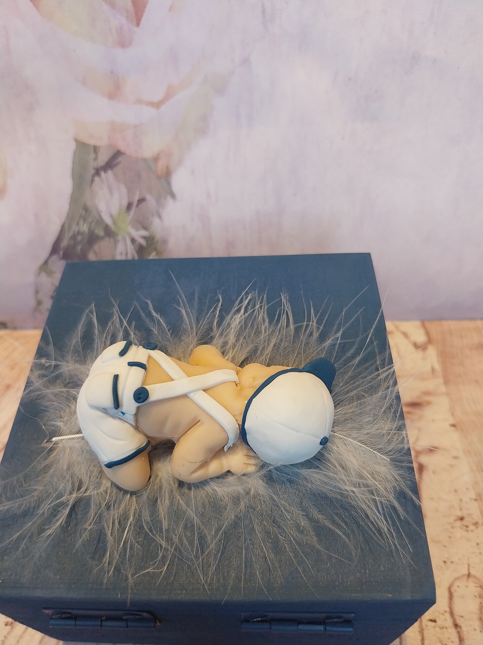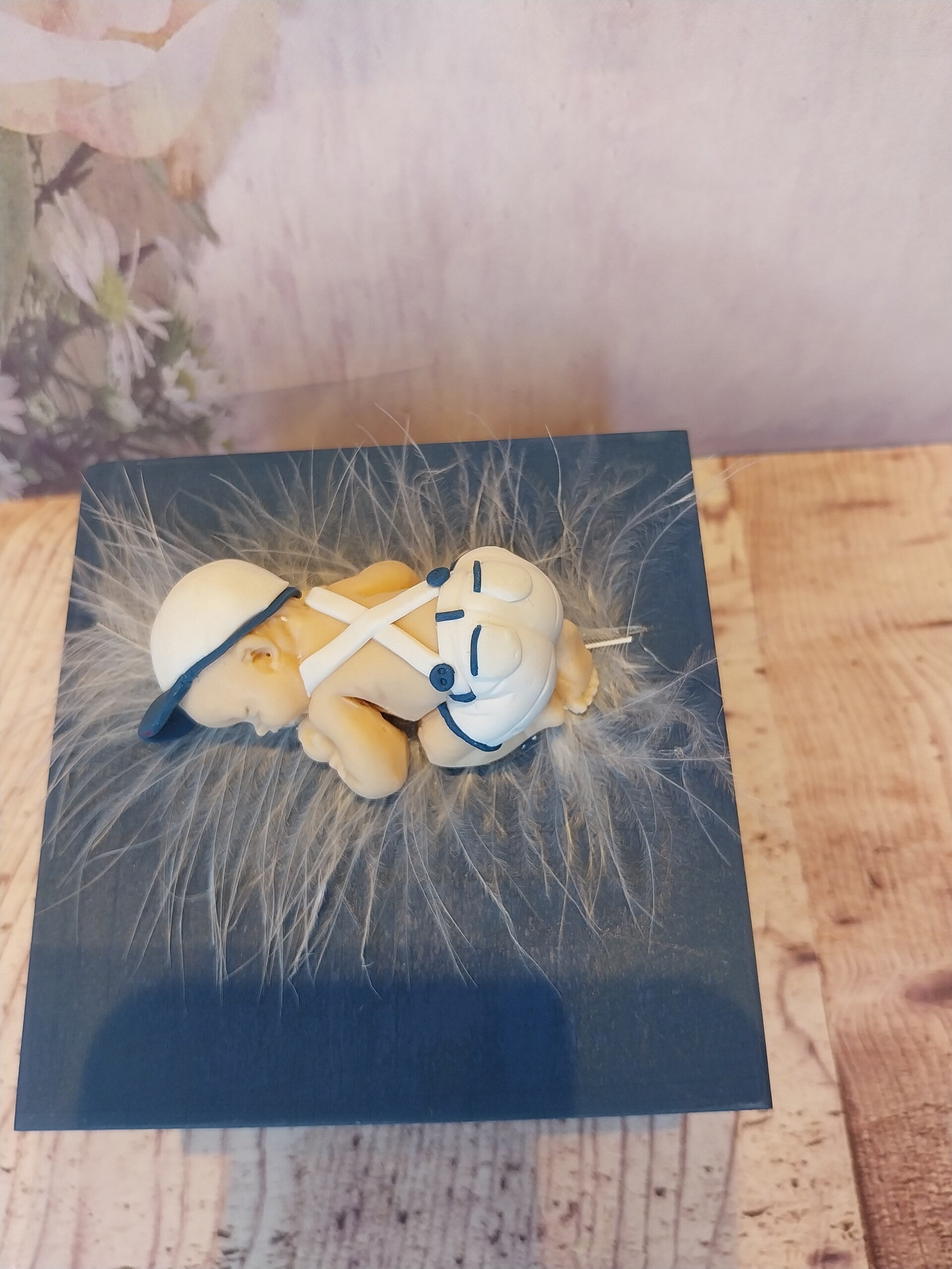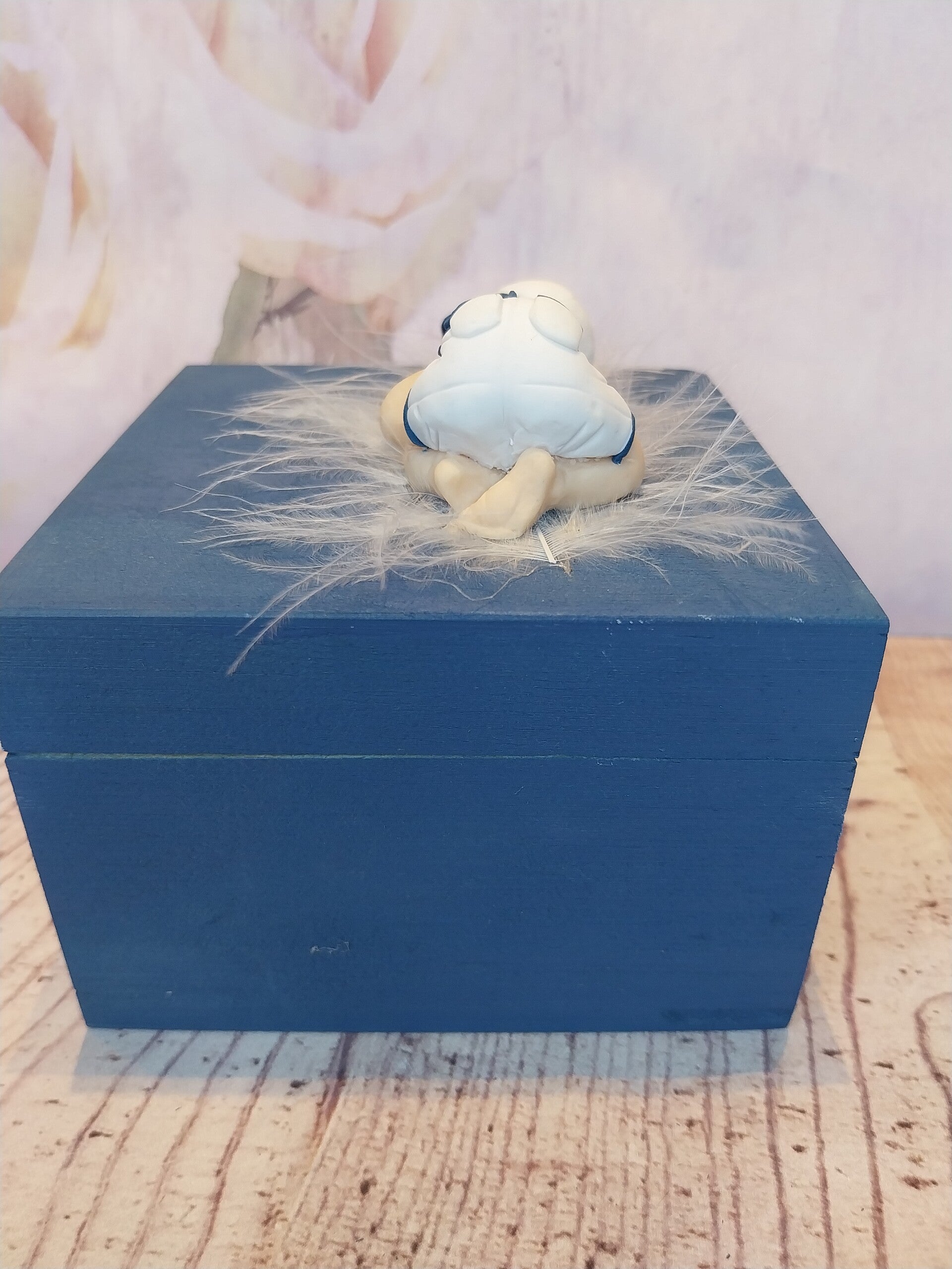 Bébé fimo garçon ange salopette et casquette blanc et bleu foncé sur une boîte en bois