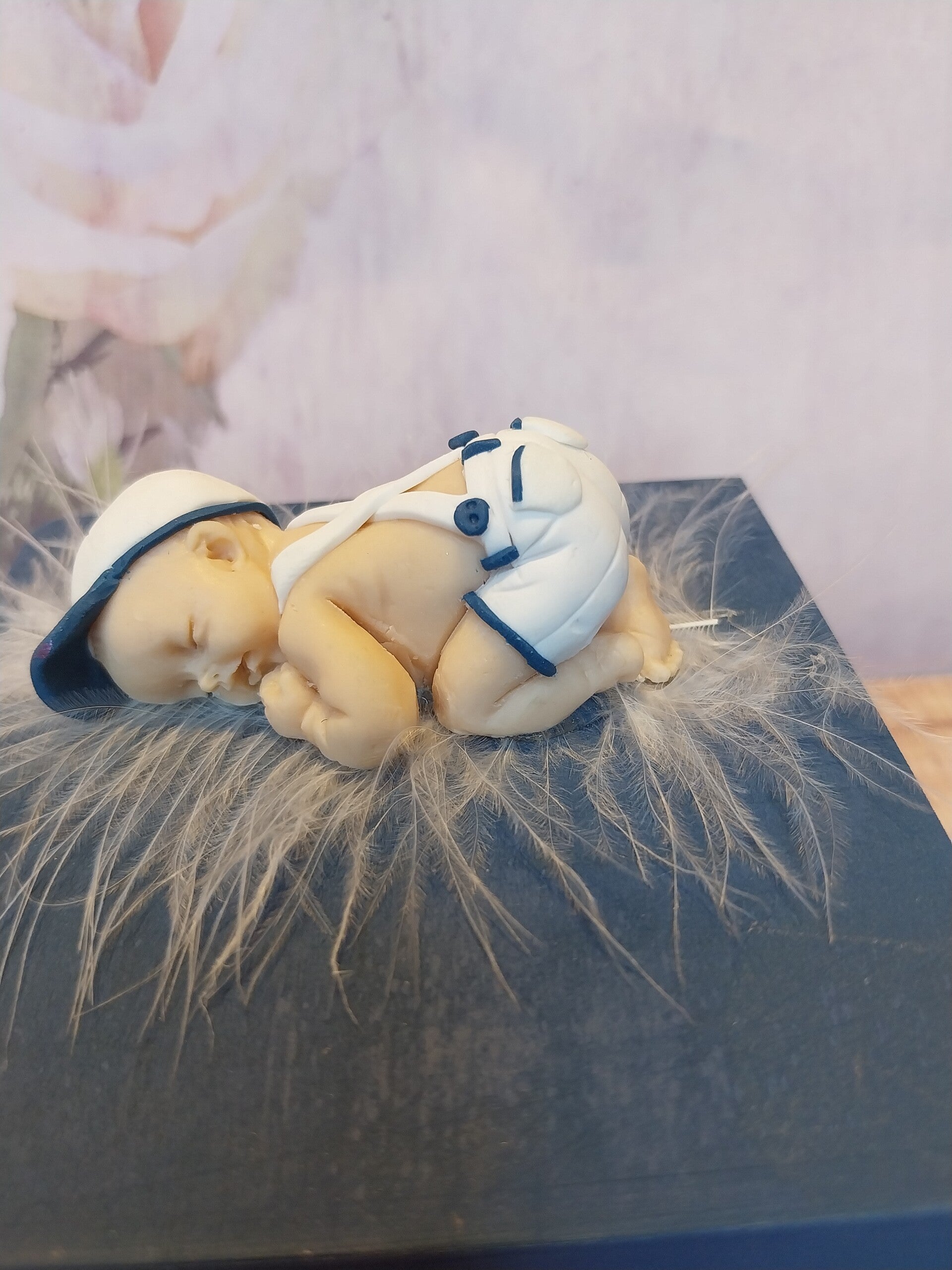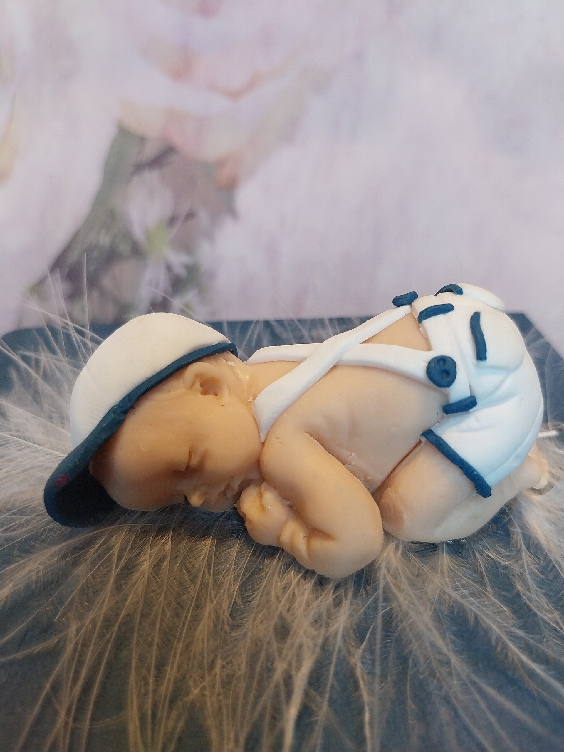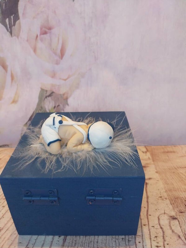 Bébé fimo garçon ange salopette et casquette blanc et bleu foncé sur une boîte en bois