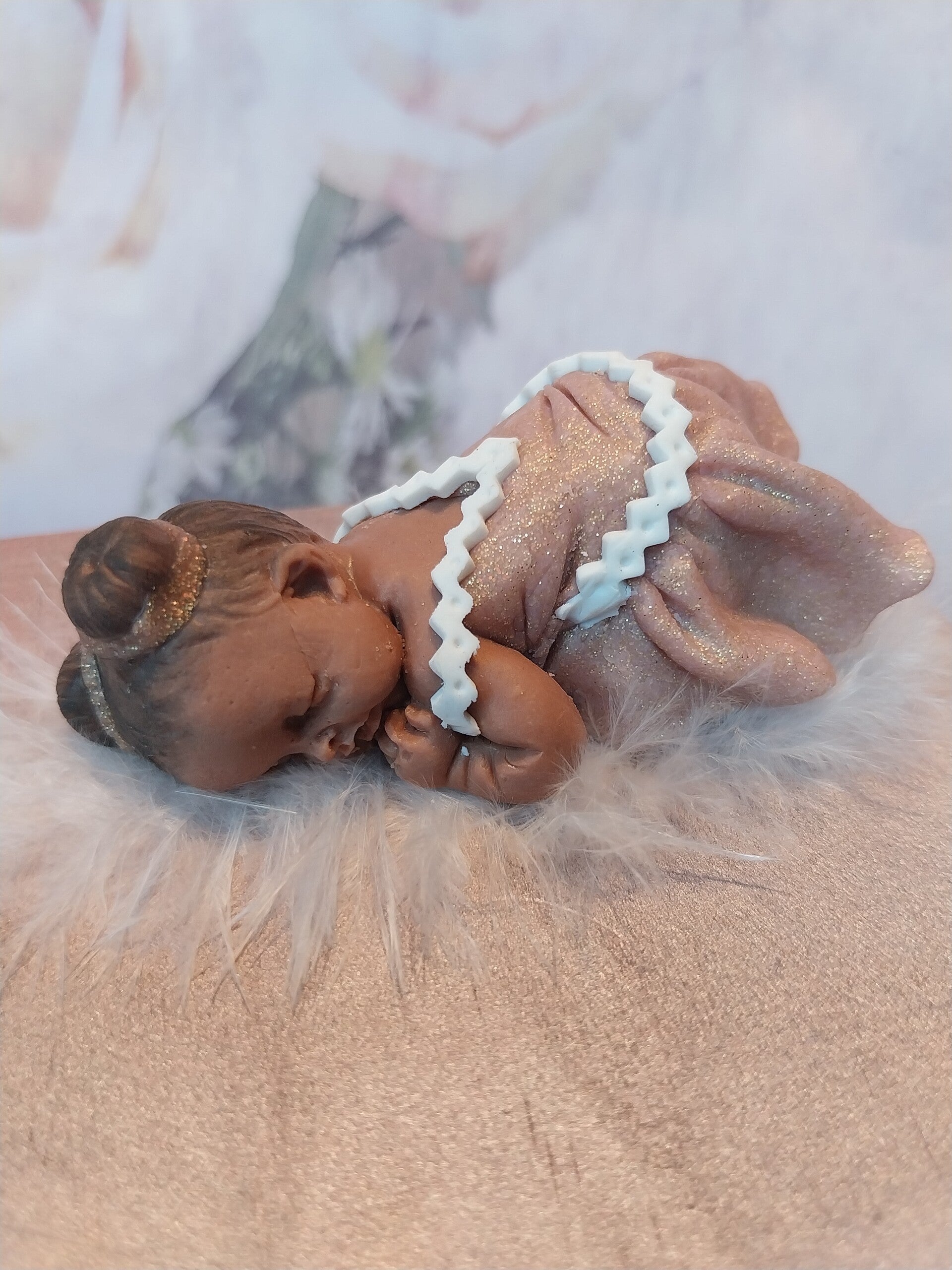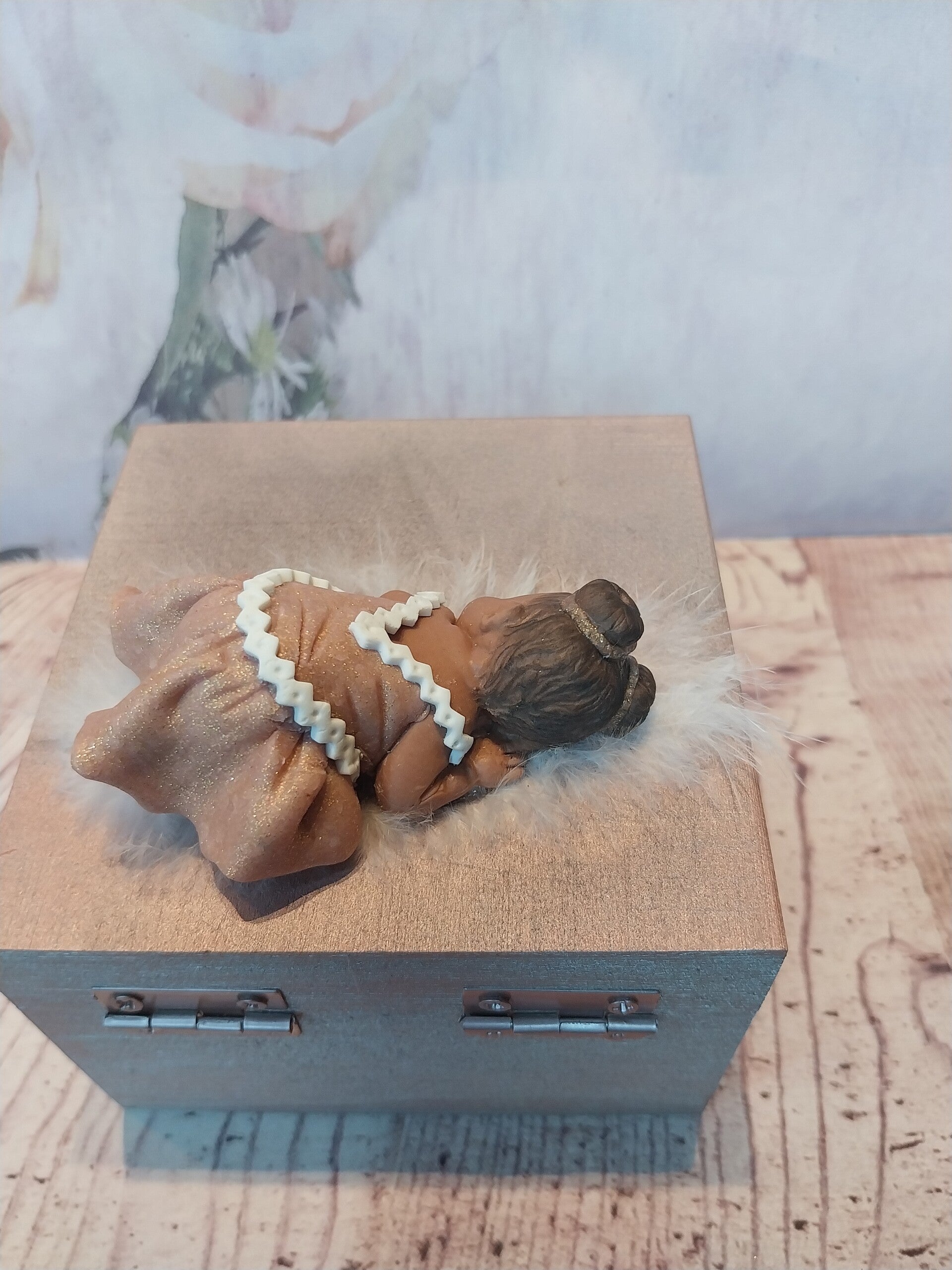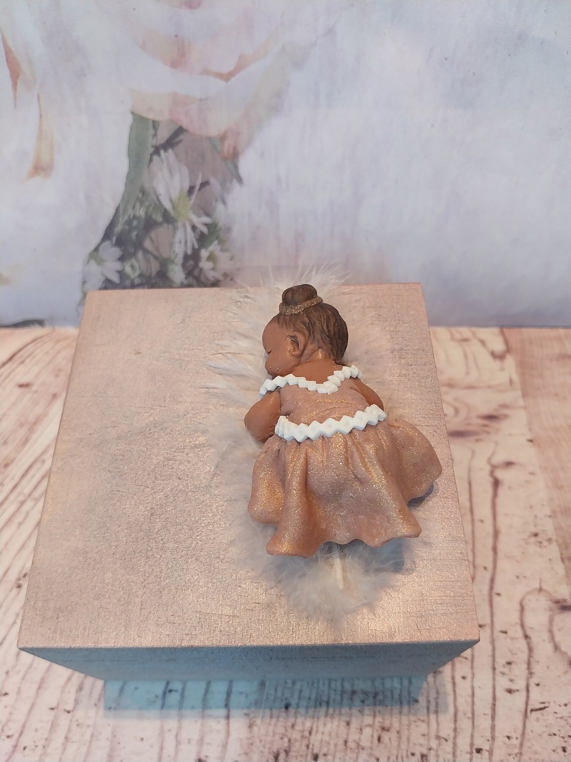 Bébé fimo fille peau foncée avec 2 chignons en robe rose doré et blanc sur une boîte en bois rose/doré.