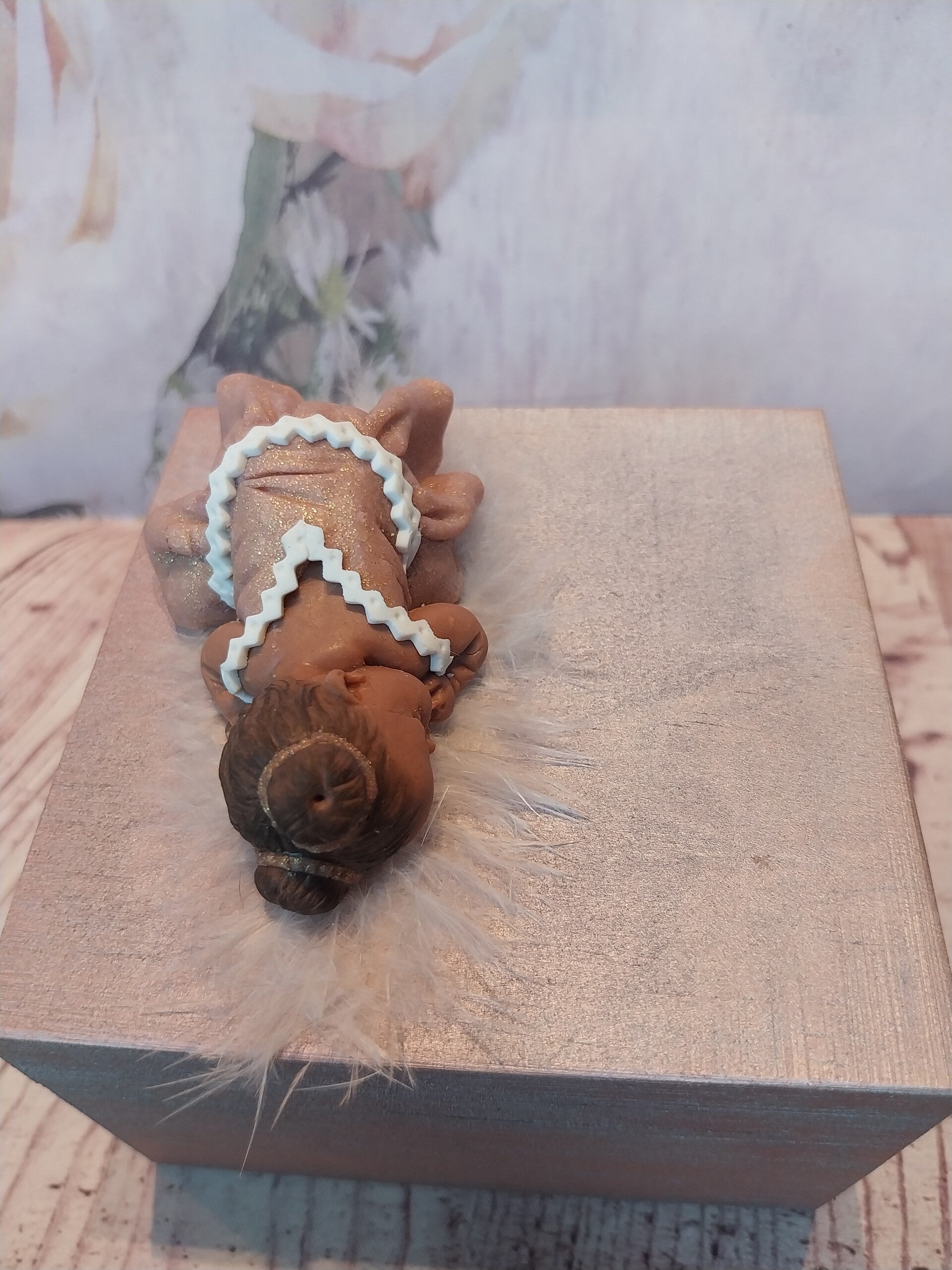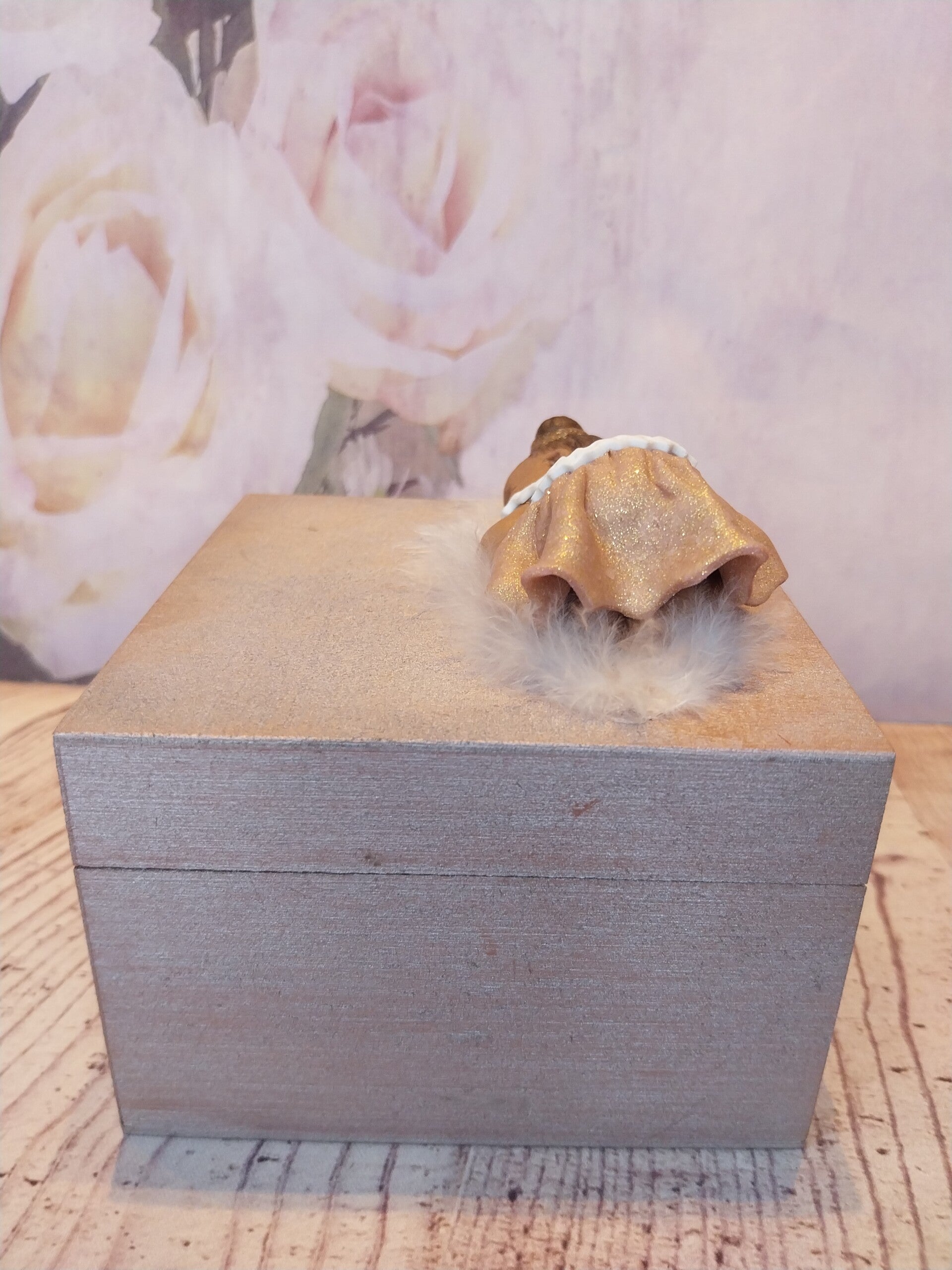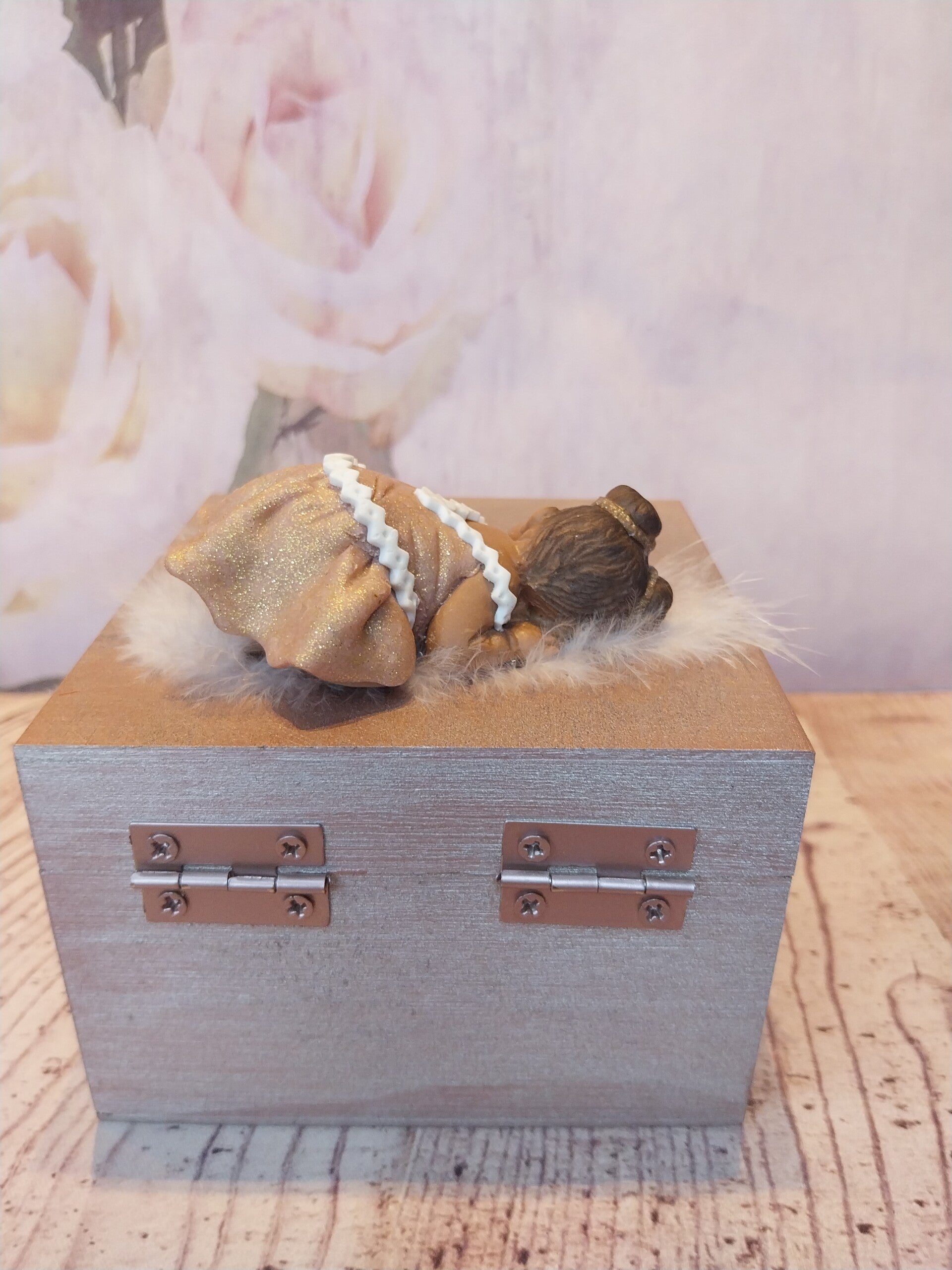 Bébé fimo fille peau foncée avec 2 chignons en robe rose doré et blanc sur une boîte en bois rose/doré.