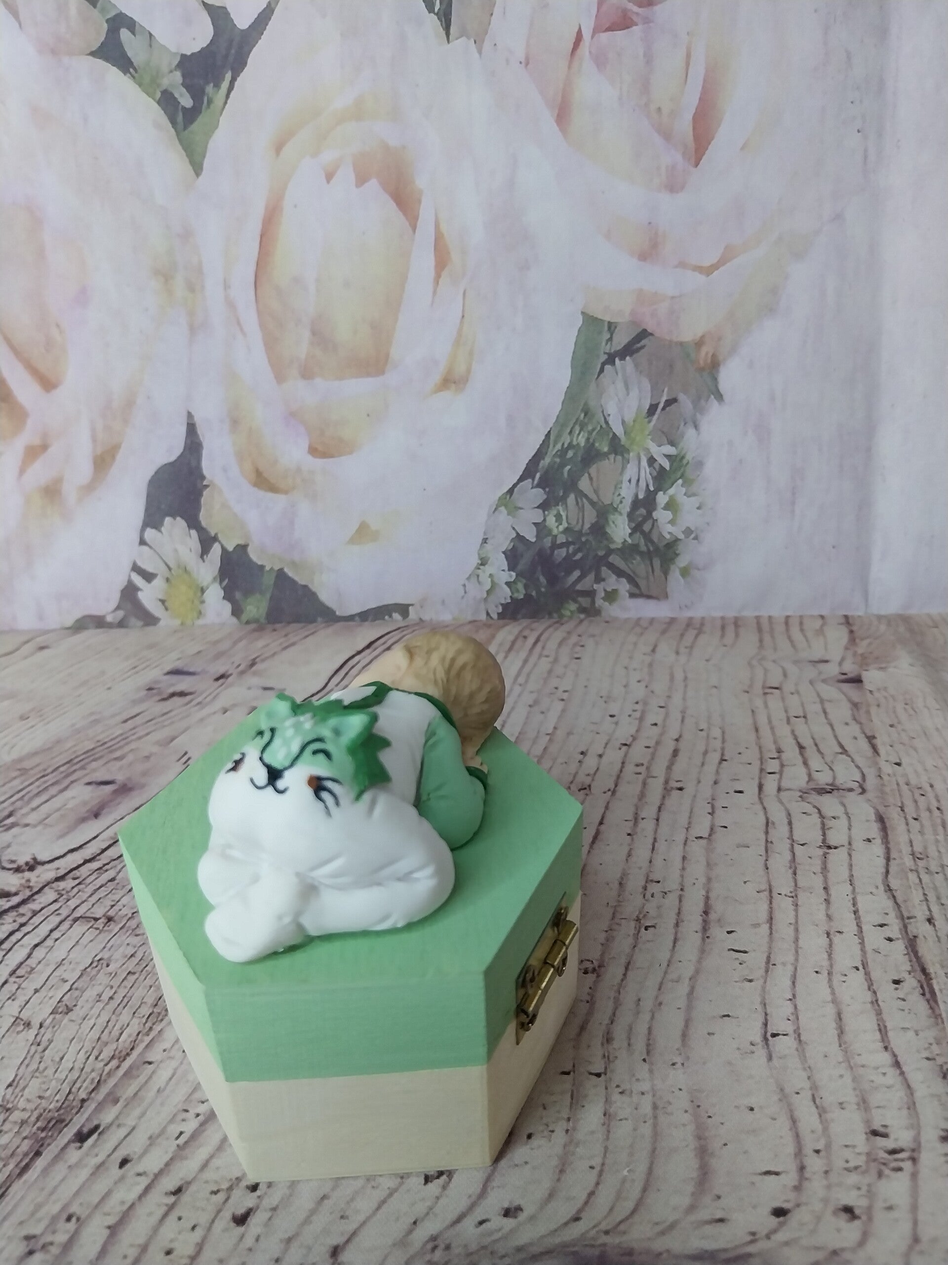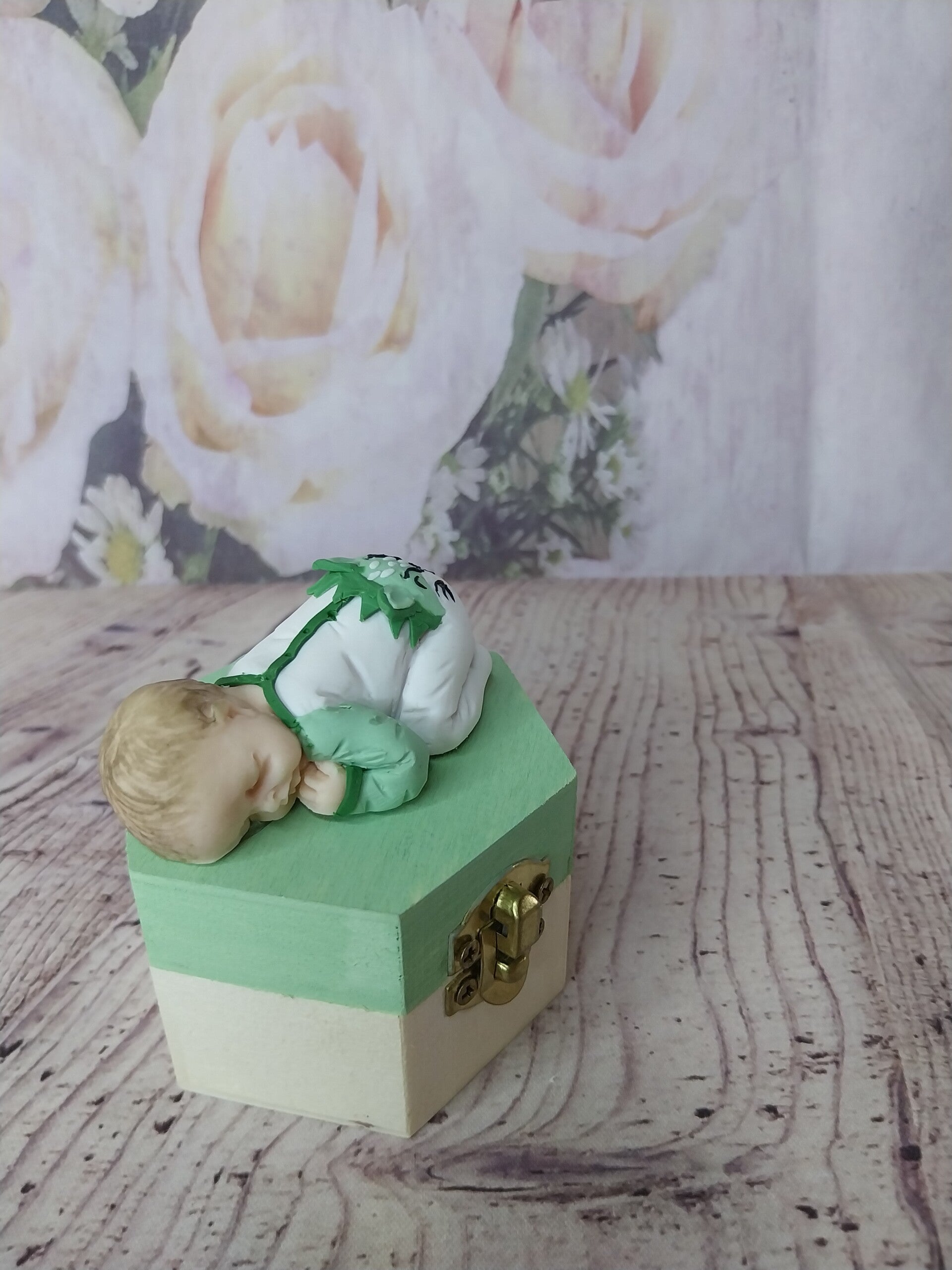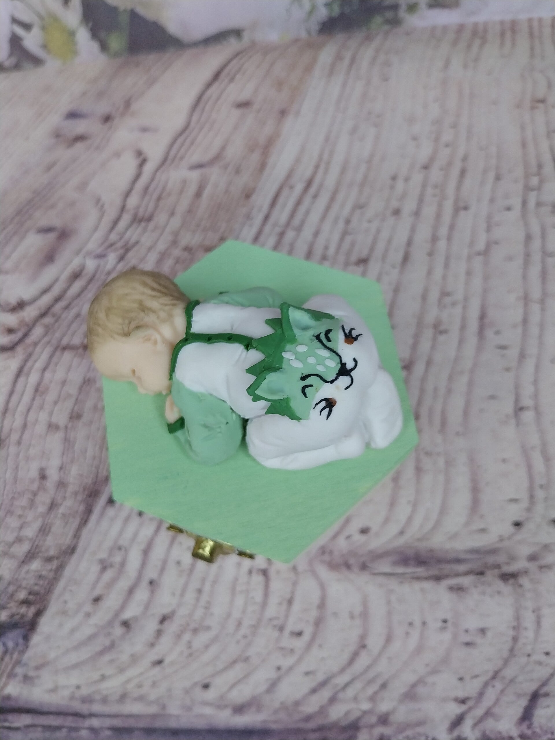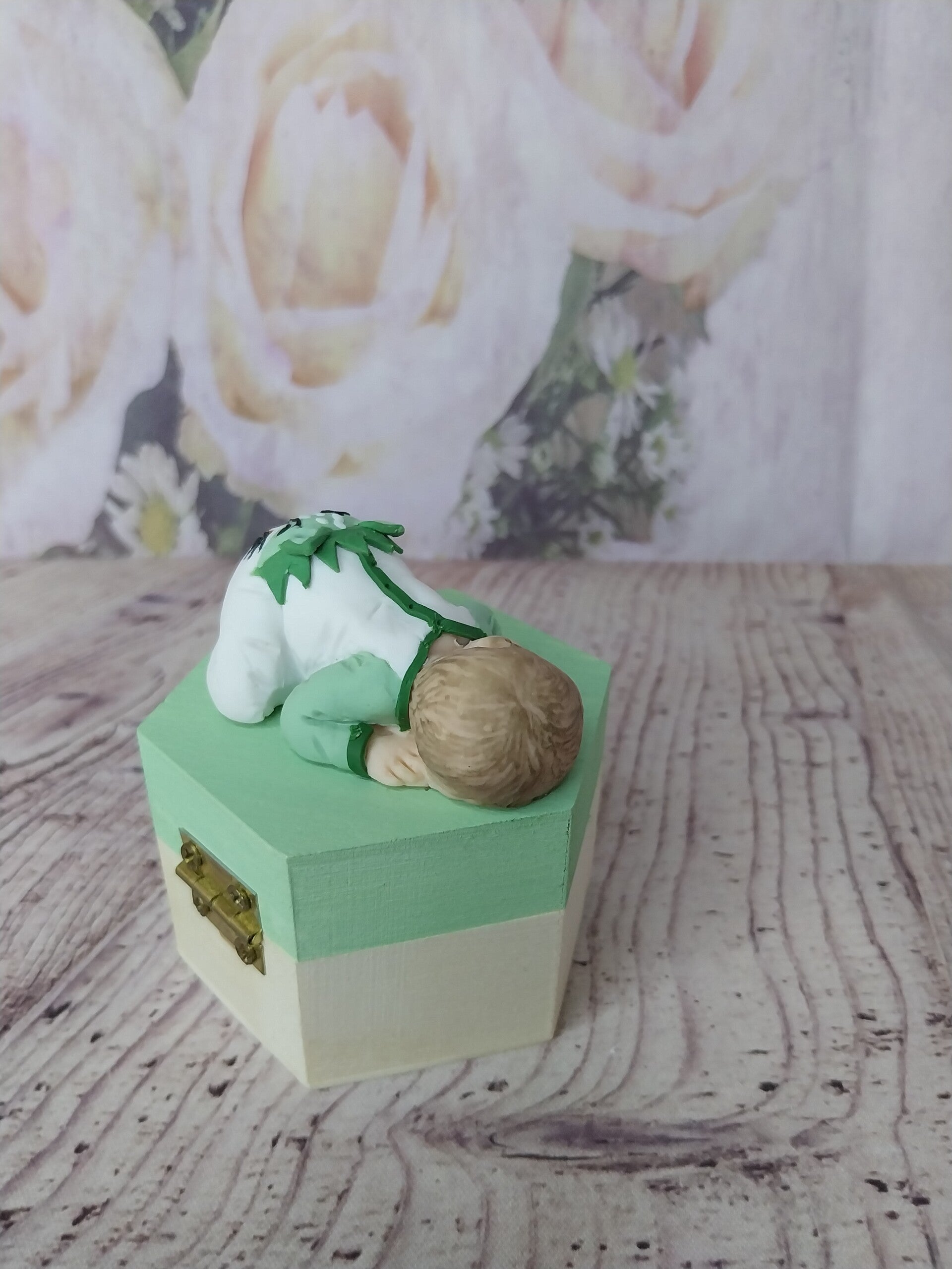 Figurine bébé fimo garçon en pyjama blanc et vert lion