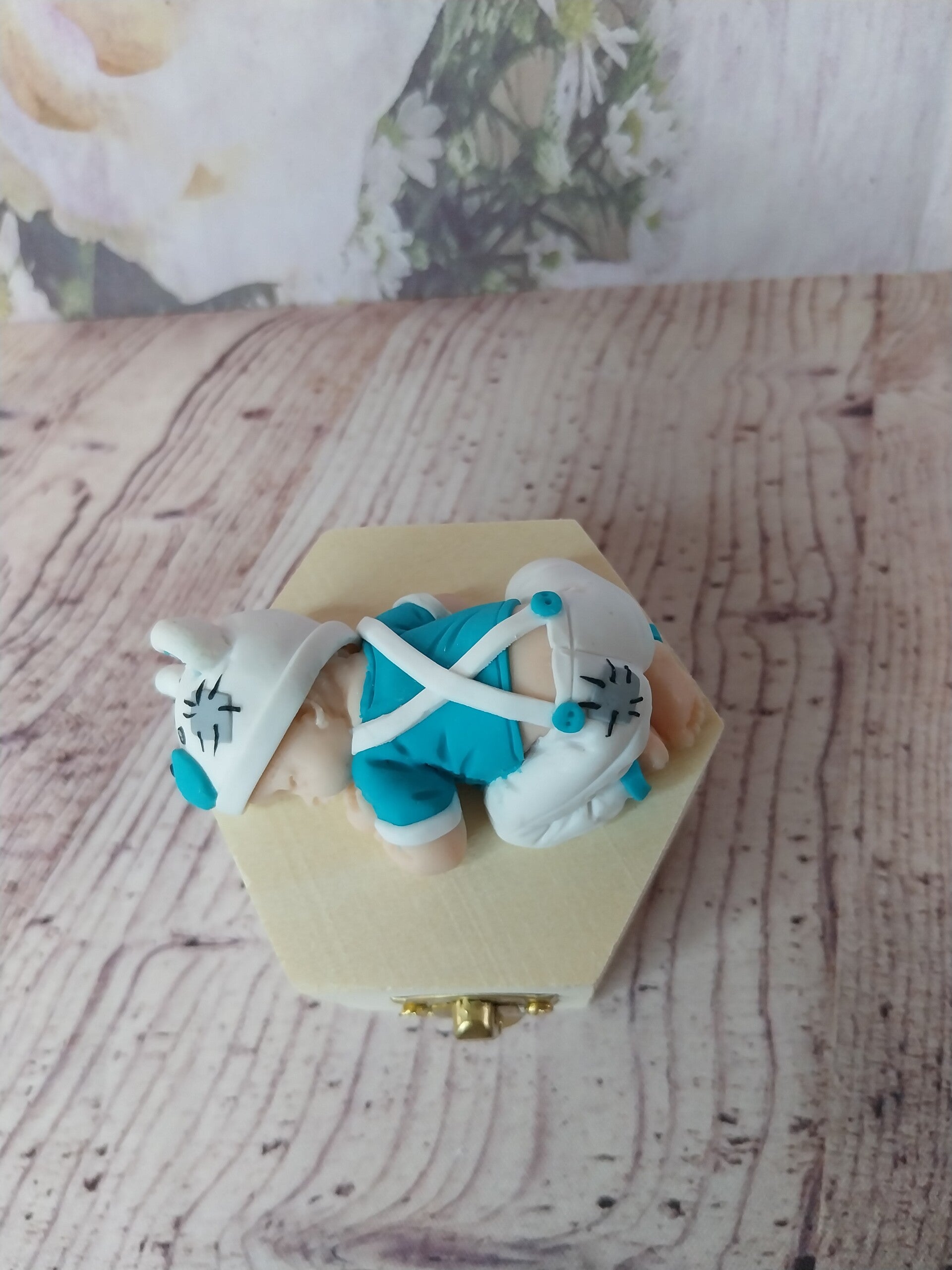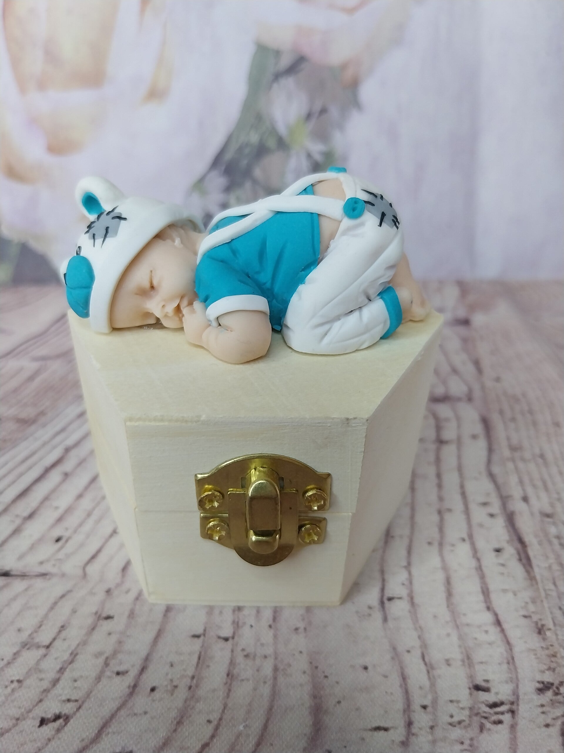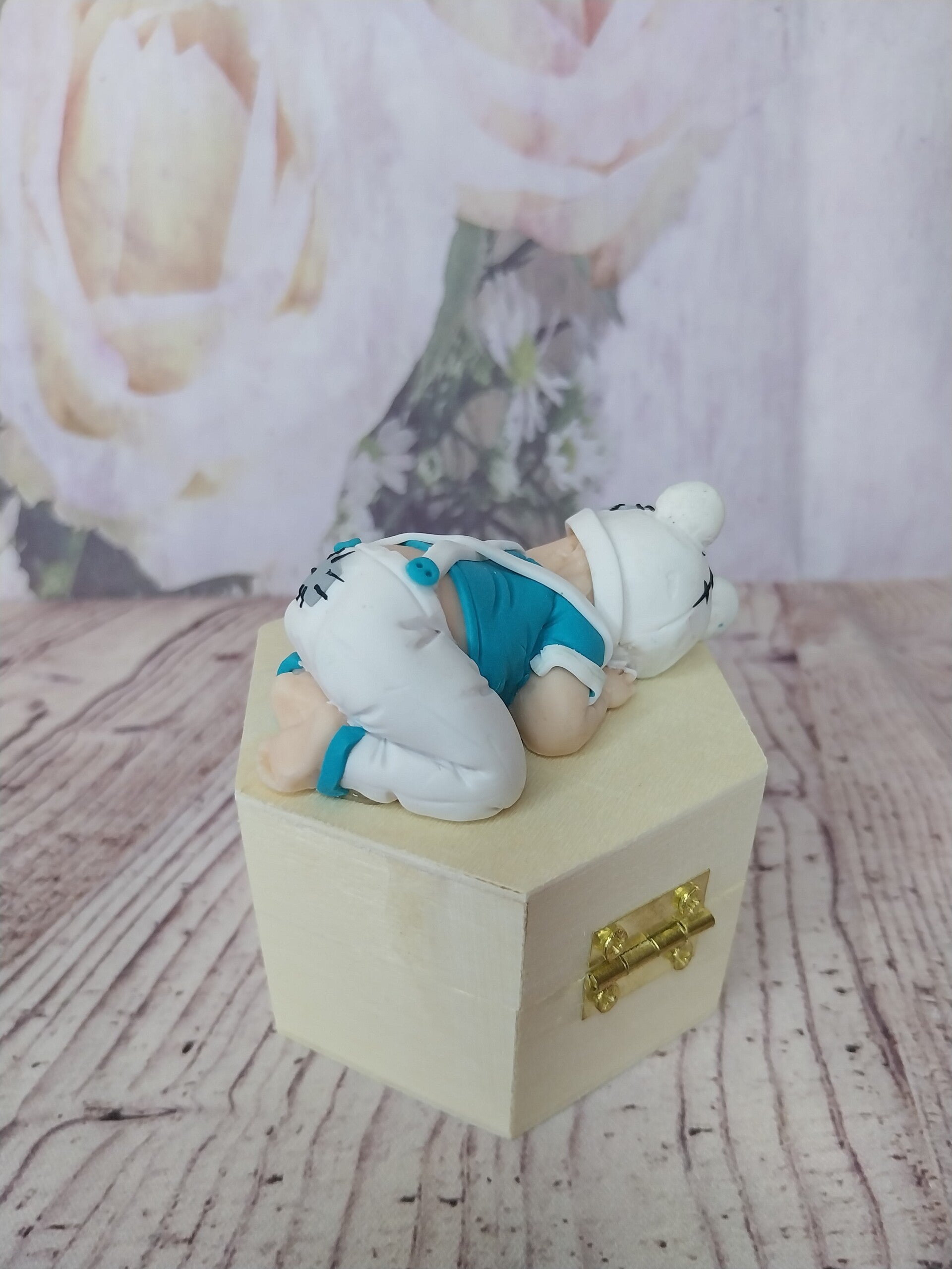 Figurine bébé fimo garçon avec pantalon à bretelles et t-shirt blanc et turquoise et bonnet ours