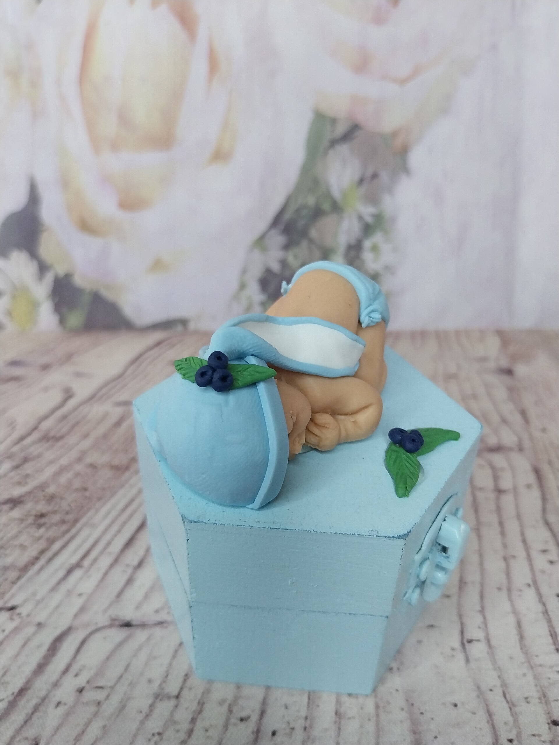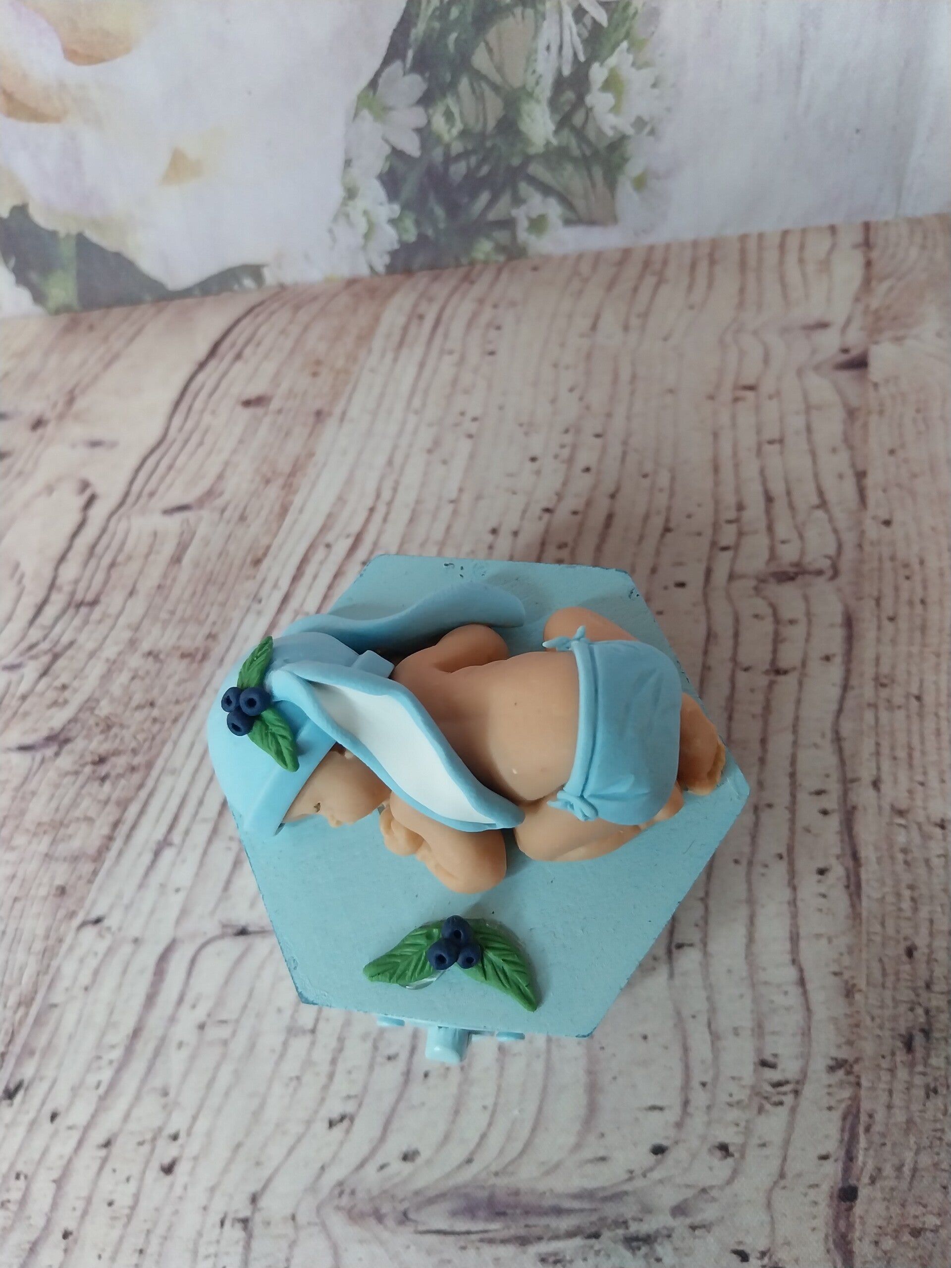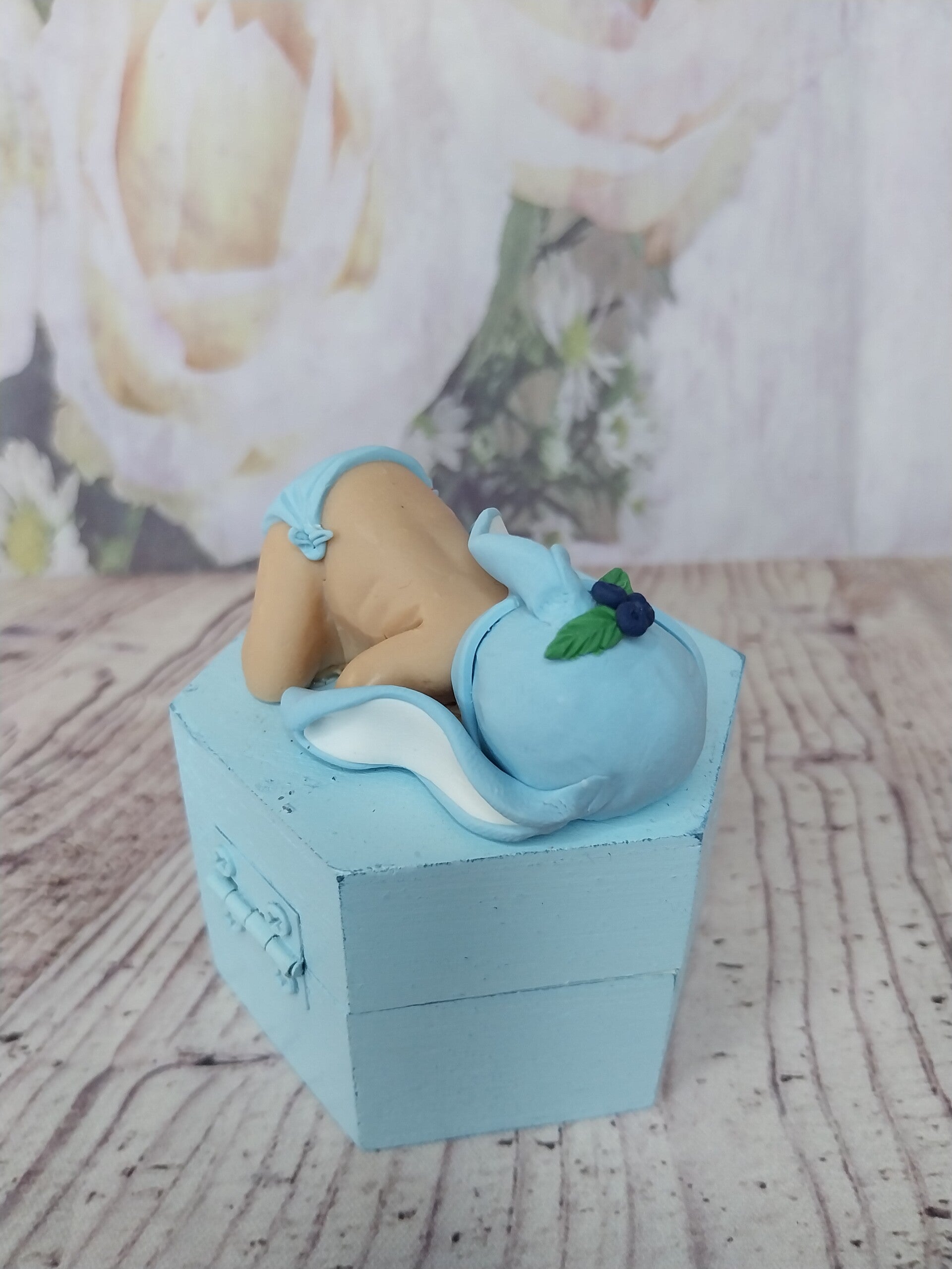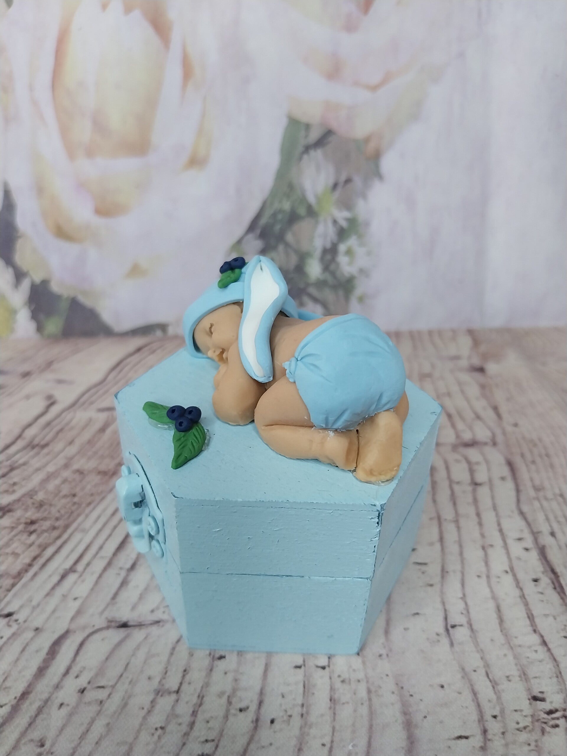 Figurine bébé fimo garçon peau métisse avec couche bleu et bonnet lapin bleu