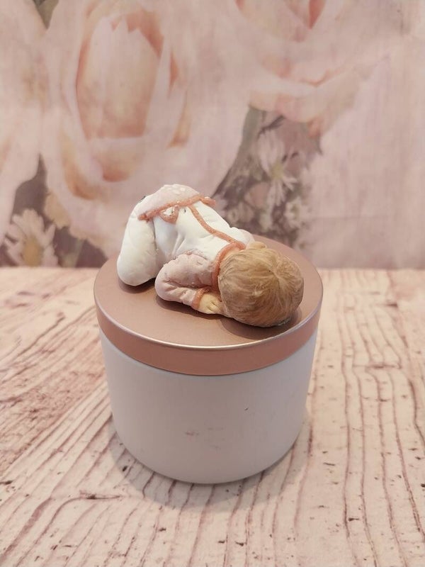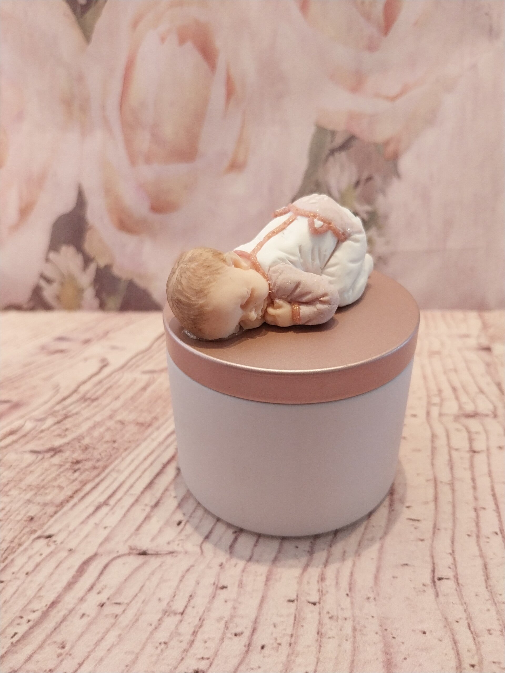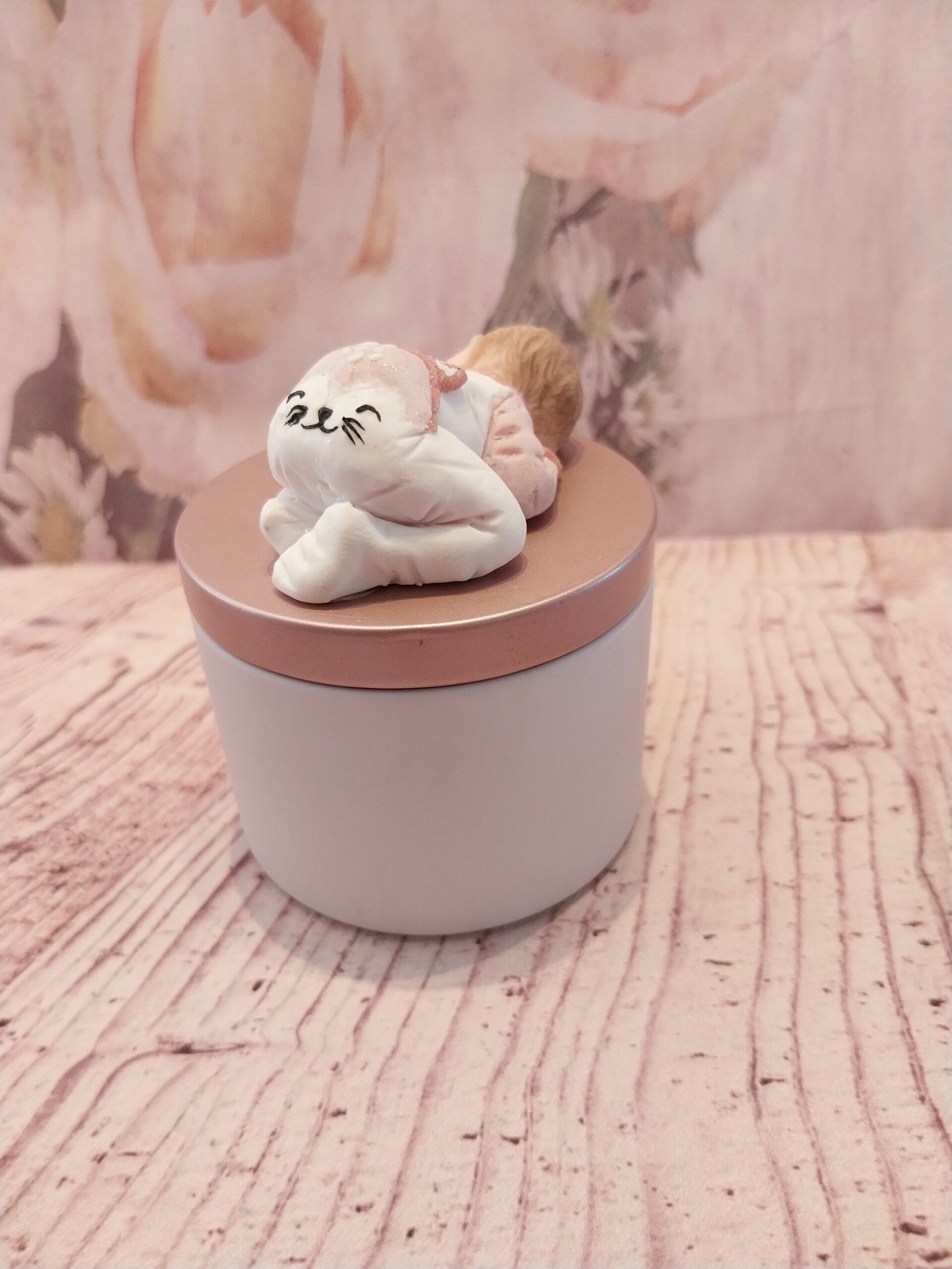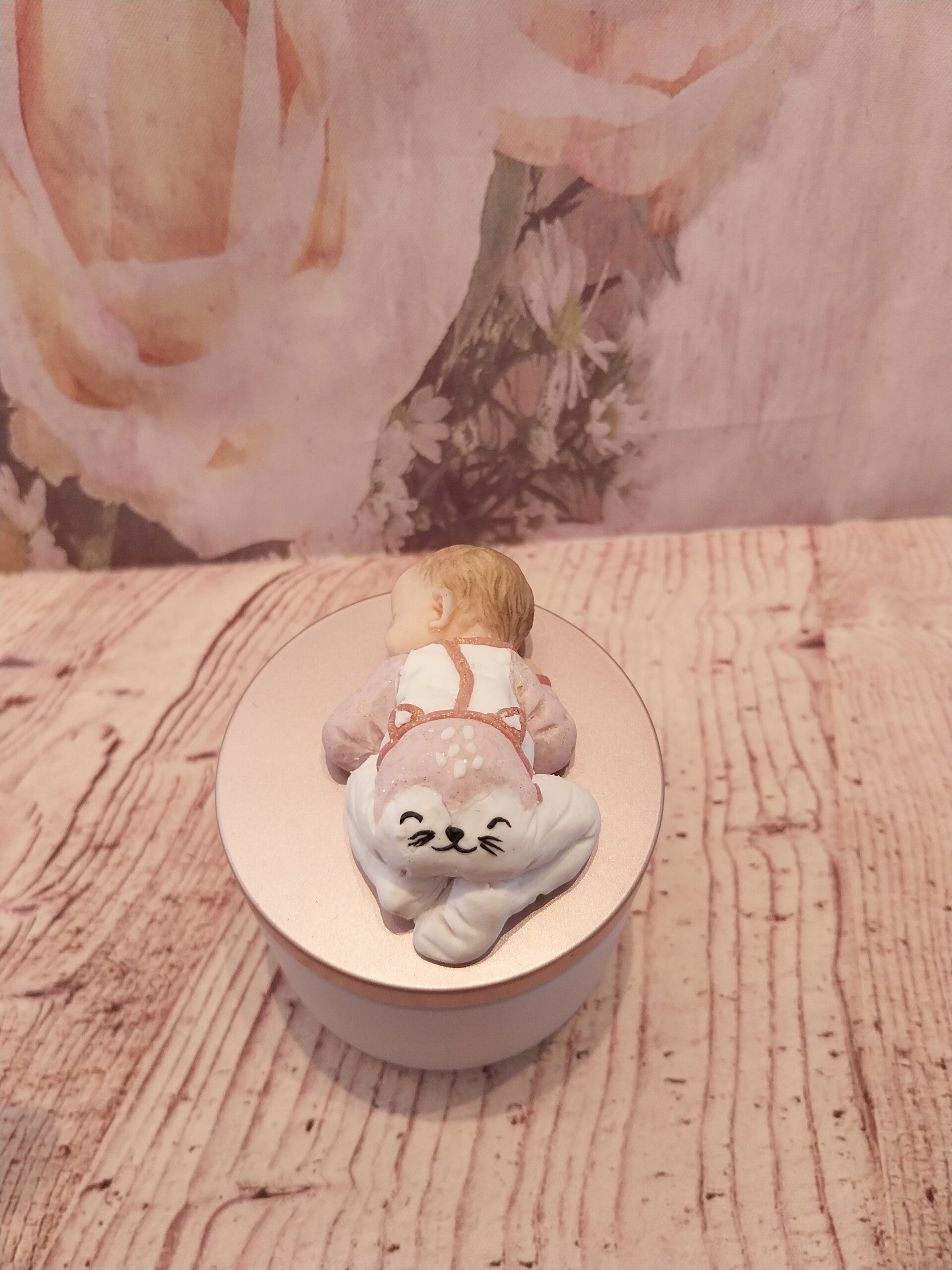 Bébé fimo fille en pyjama l'outre rose et blanc sur une petite boîte en métal
