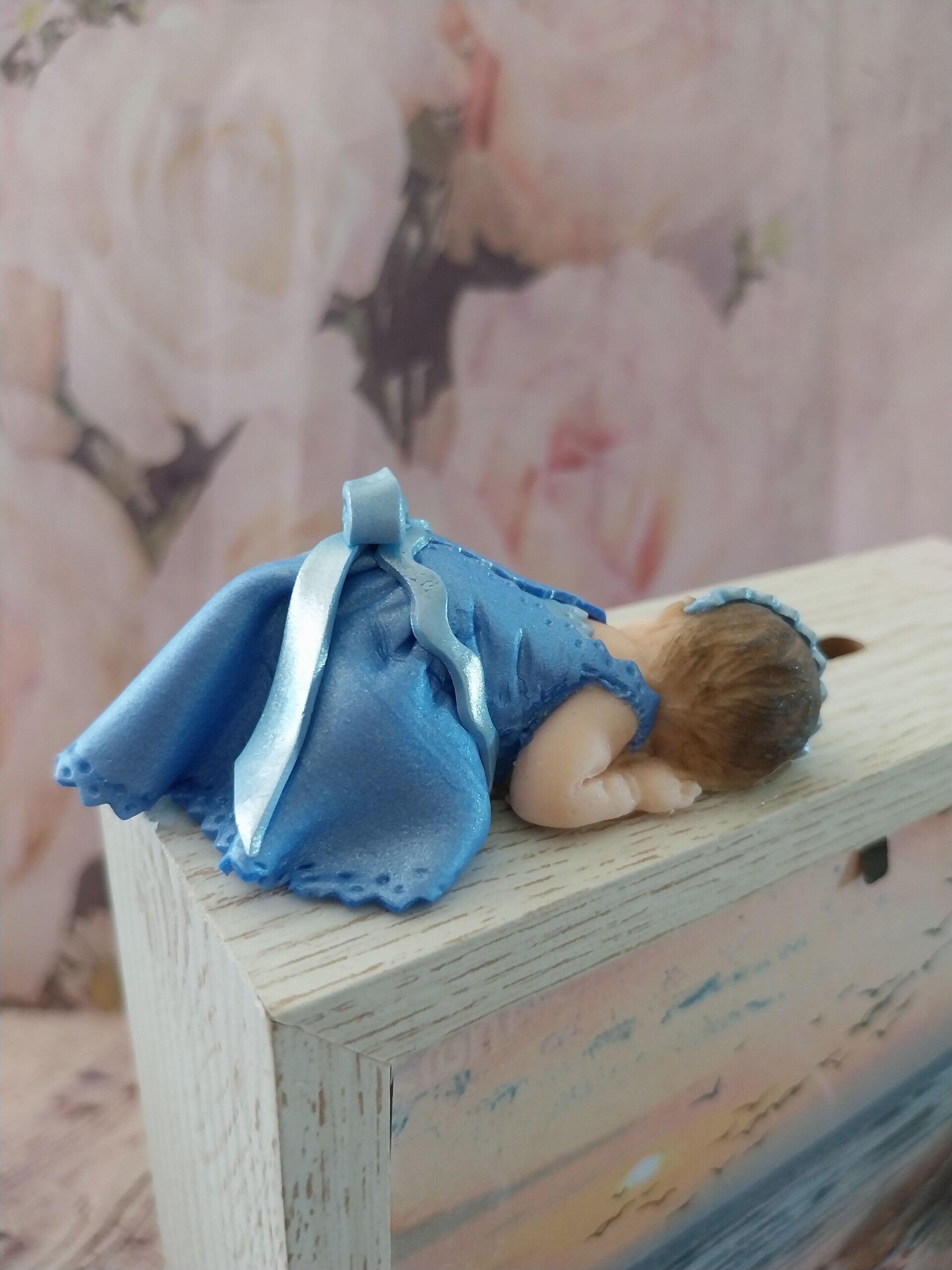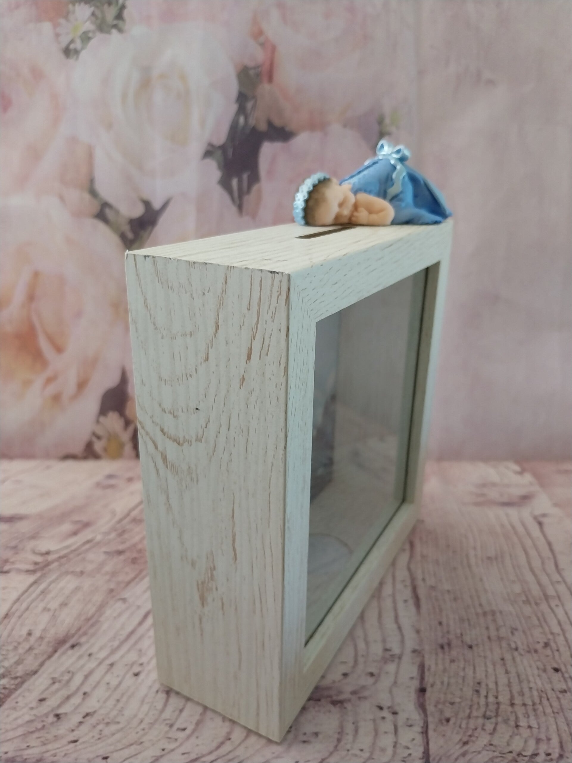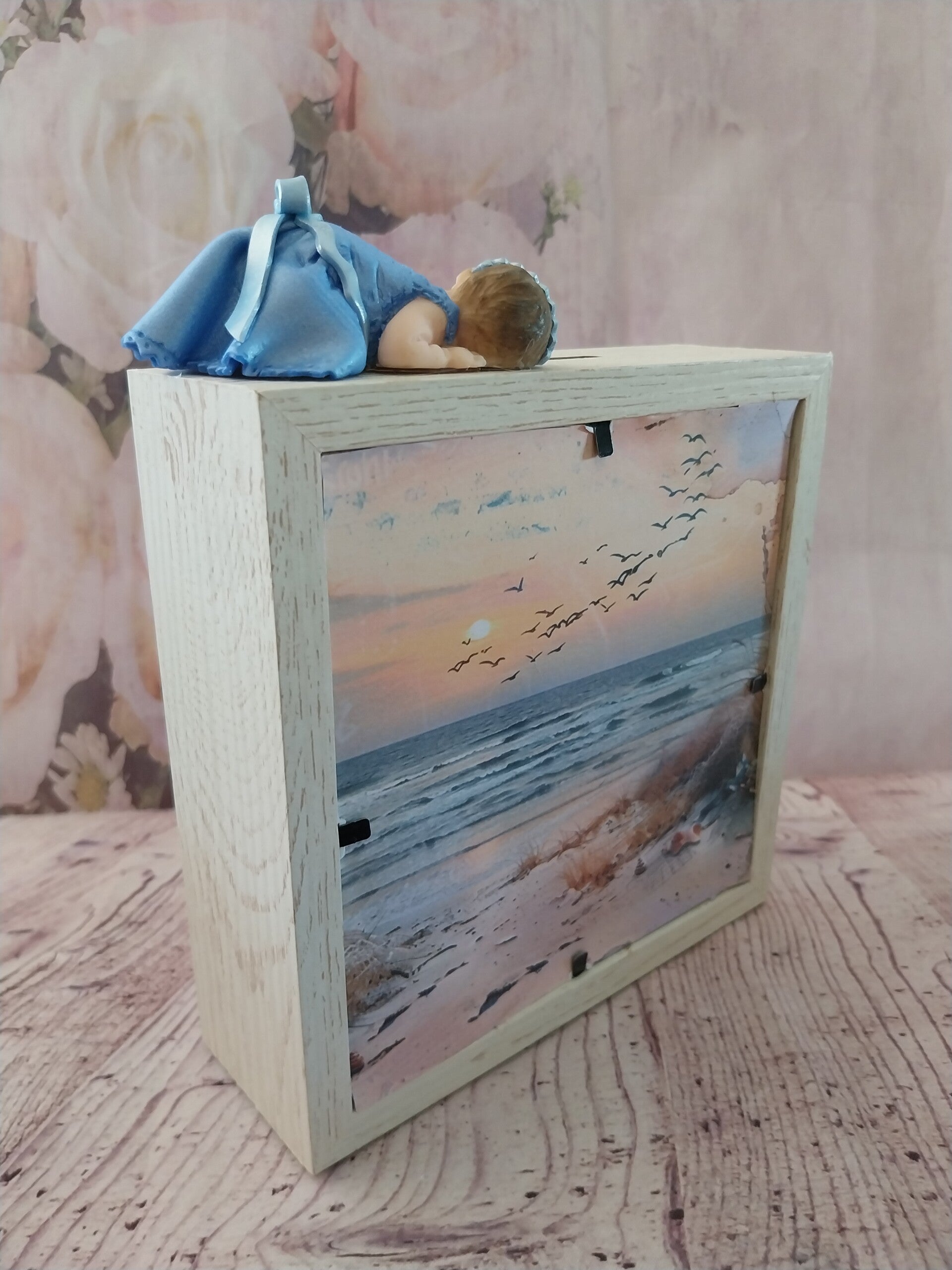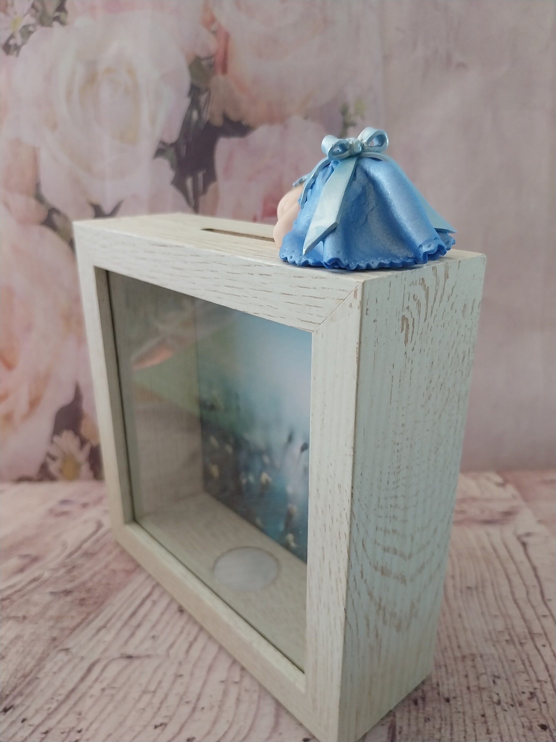 Tirelire en bois blanc beige avec bébé fimo fille en robe bleu