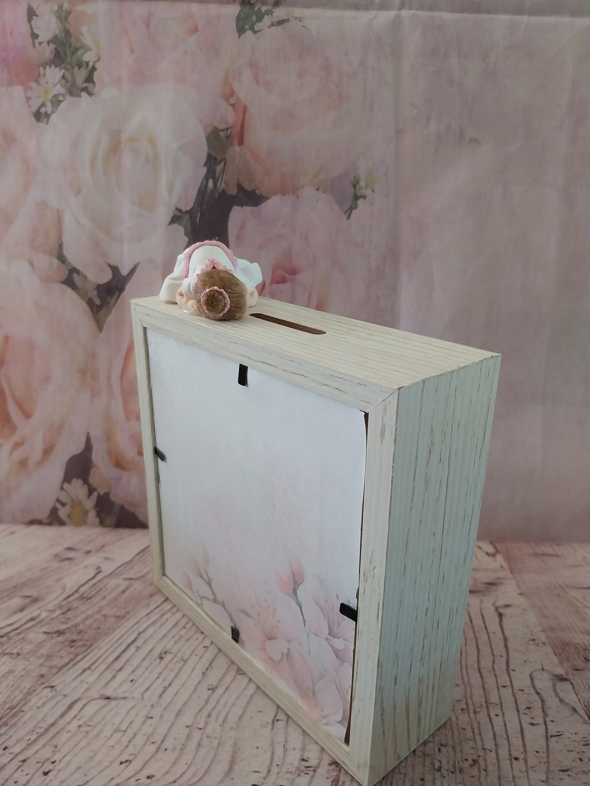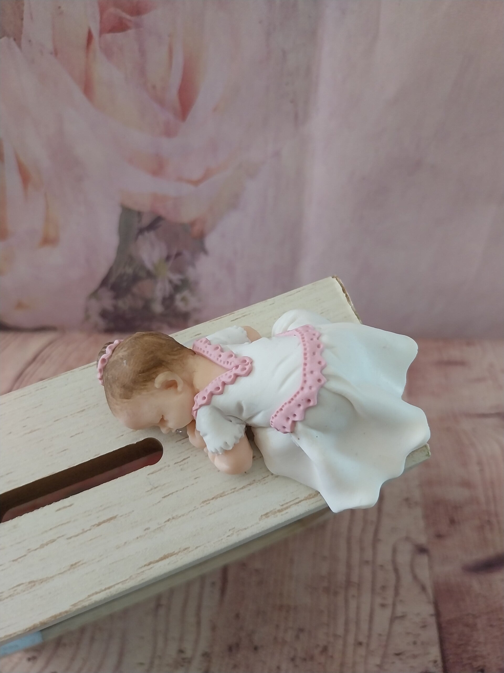 Tirelire en bois blanc beige avec bébé fimo fille avec chignon en robe blanche et rose.