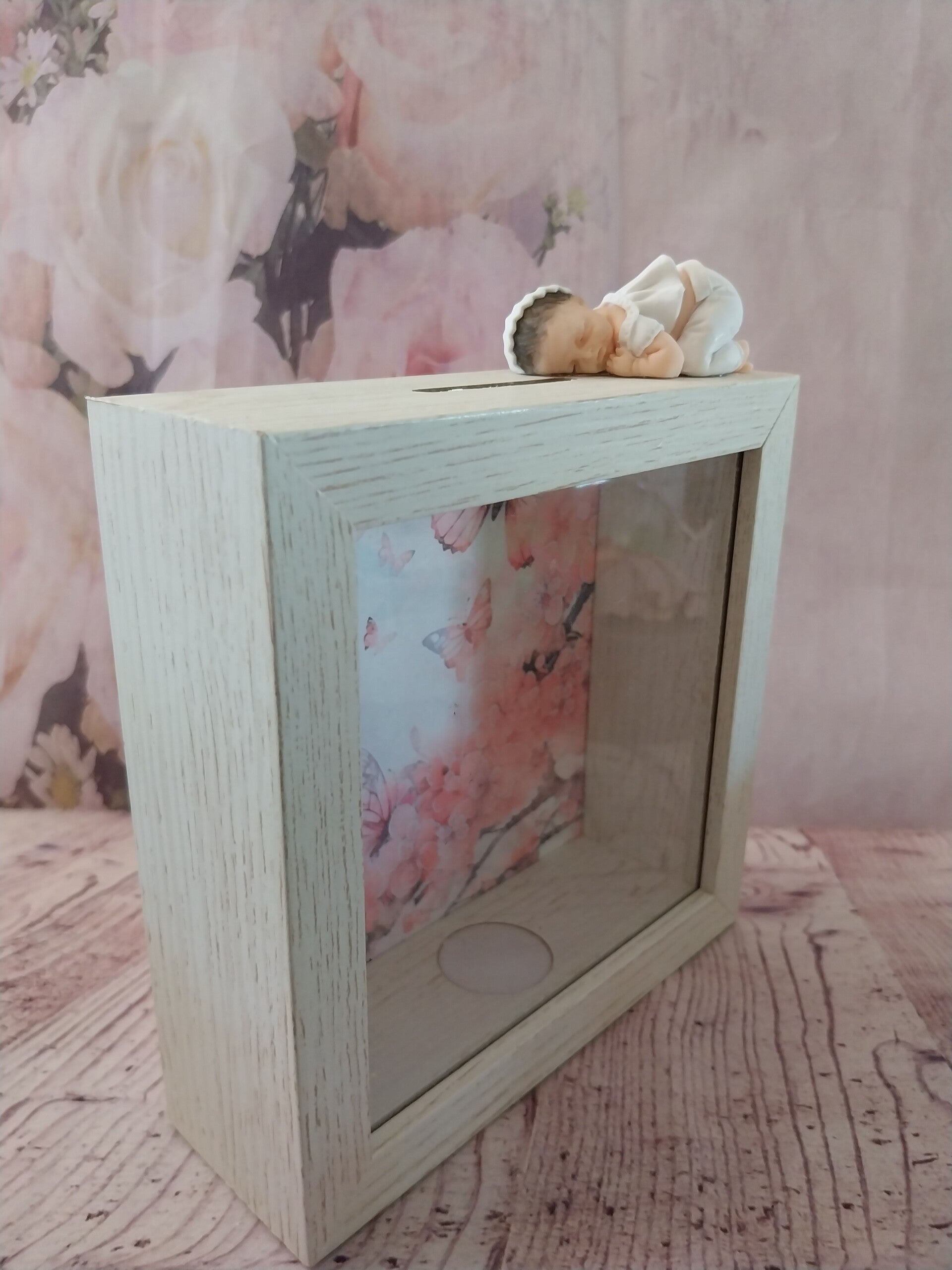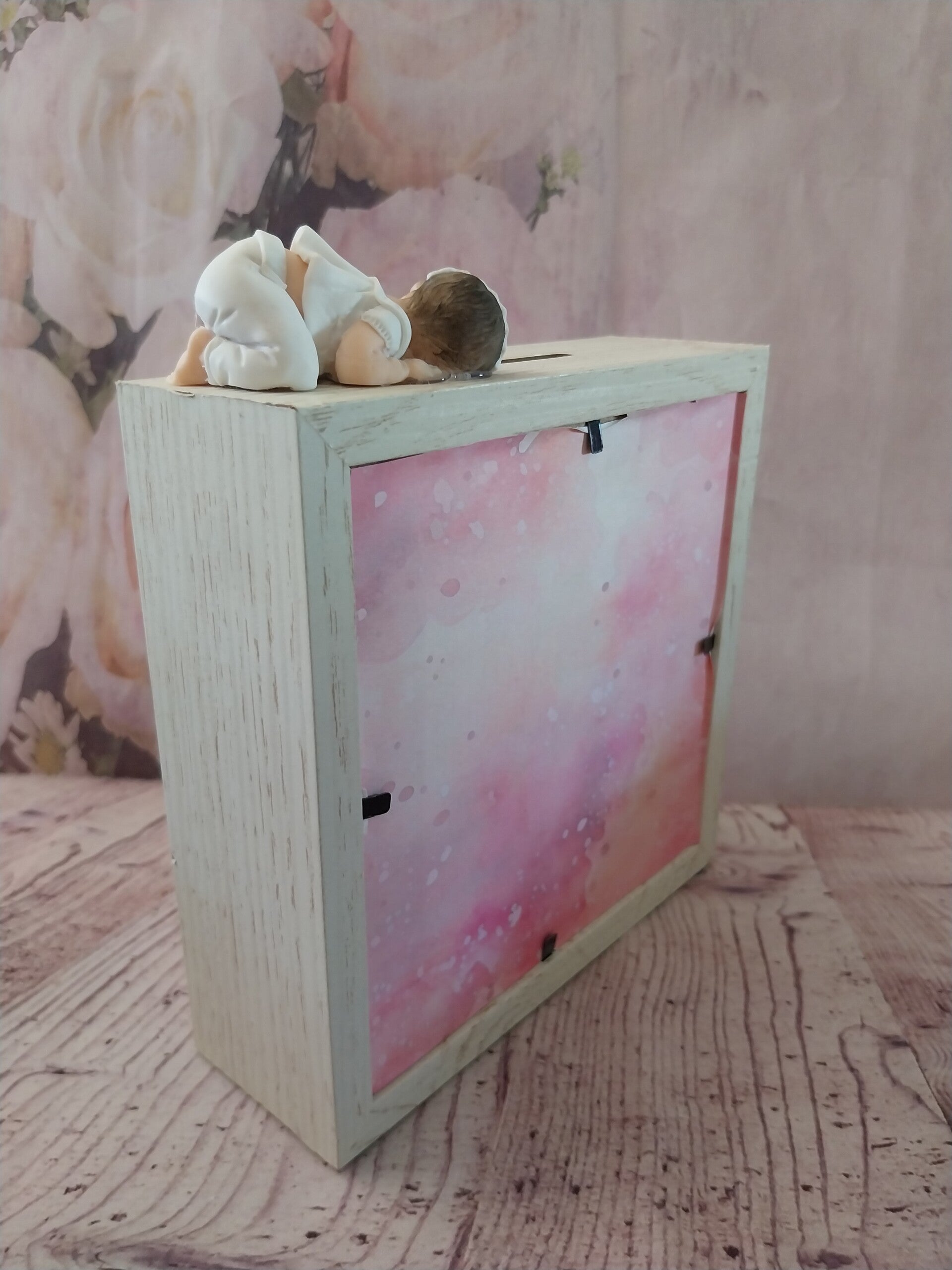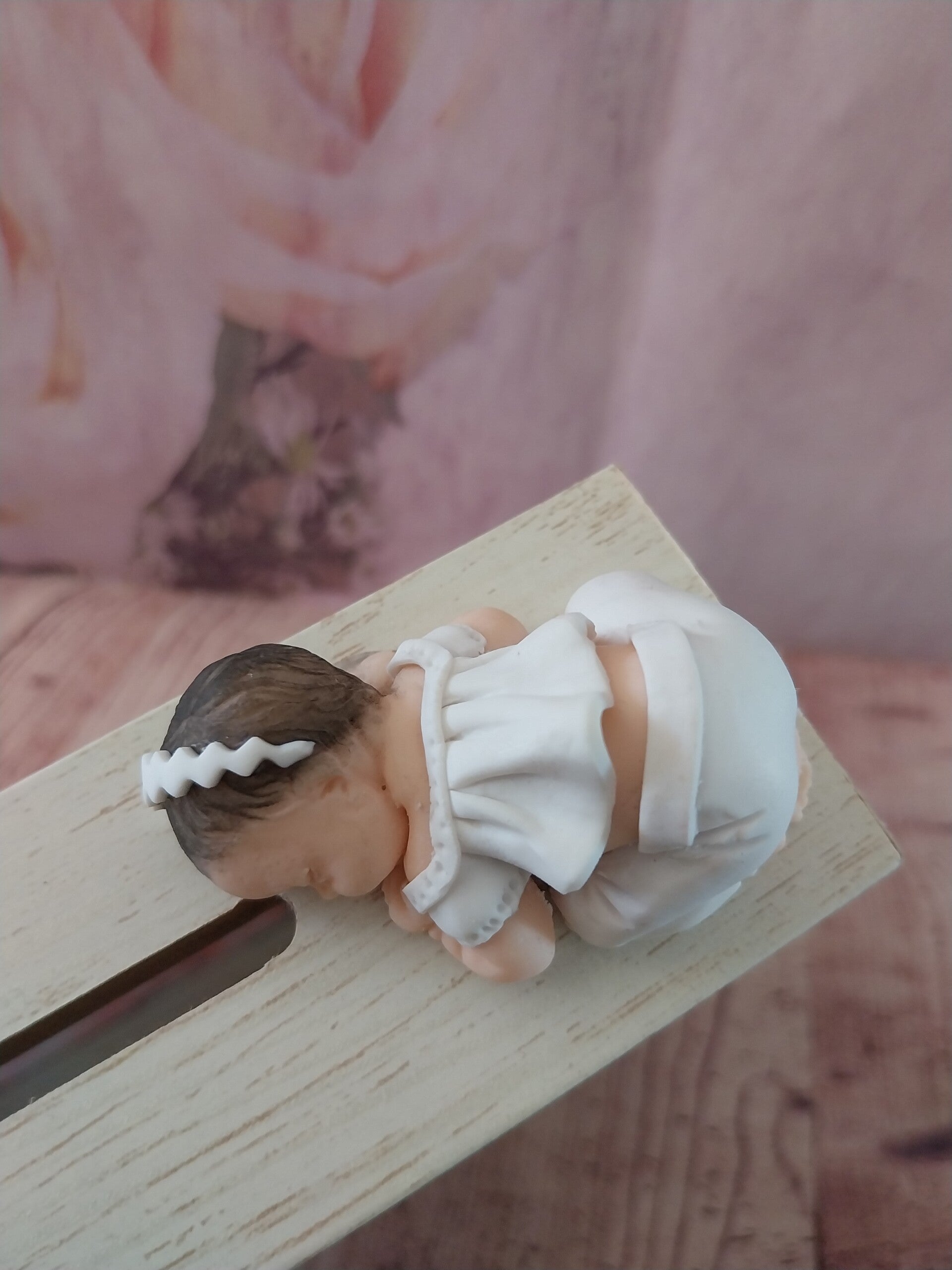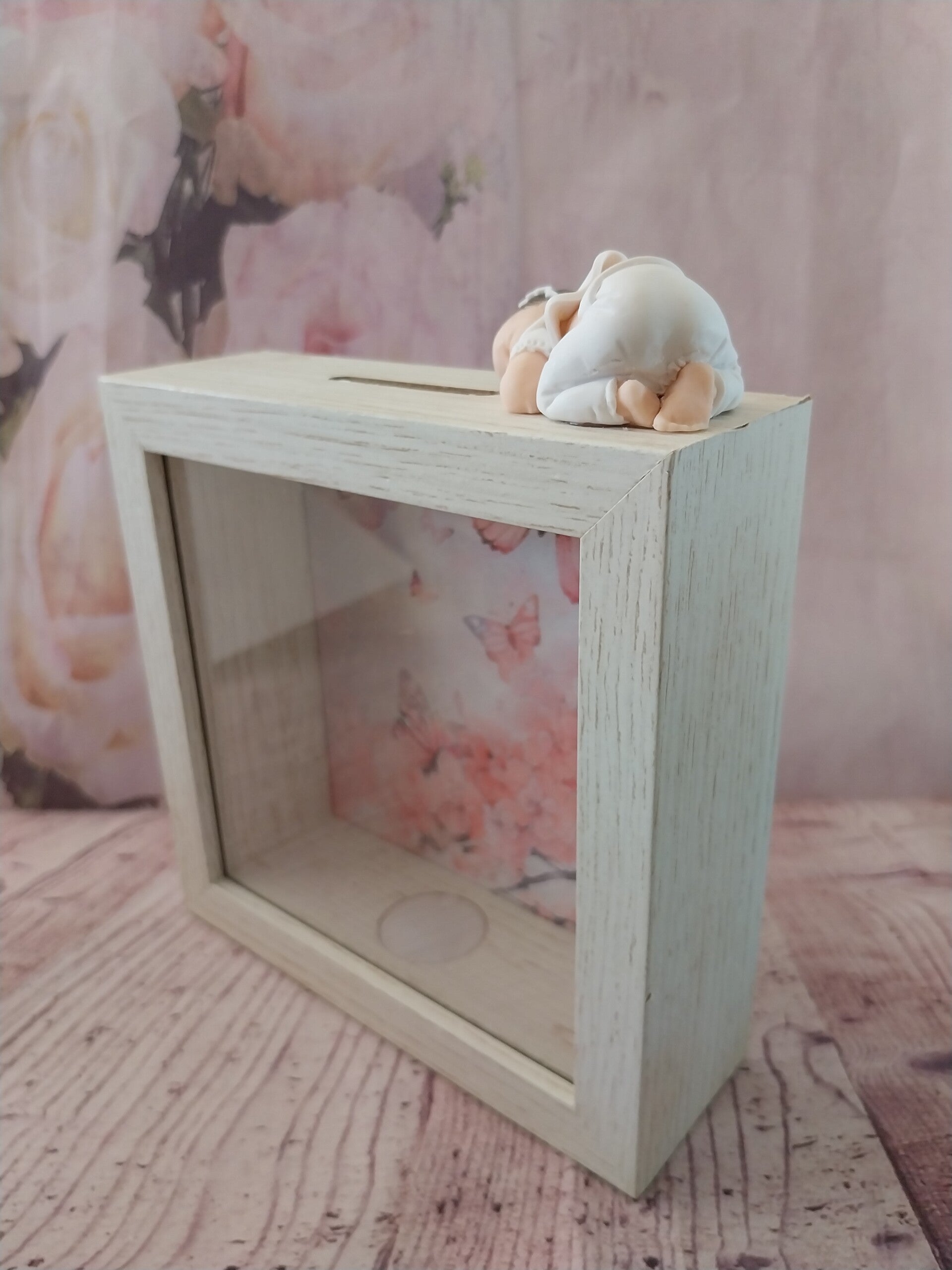 Tirelire en bois blanc beige avec bébé fimo fille avec chignon en pantalon, t-shirt et serre tête blanc.