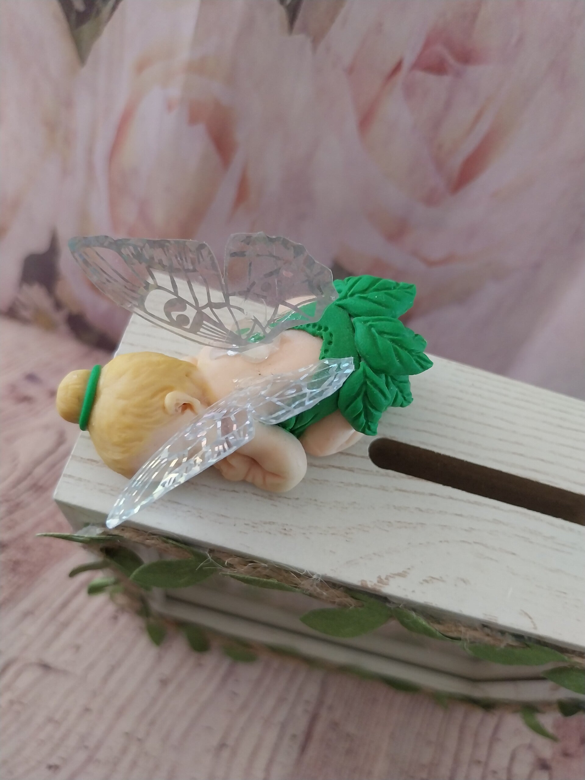 Tirelire en bois blanc beige avec bébé fimo fille fée