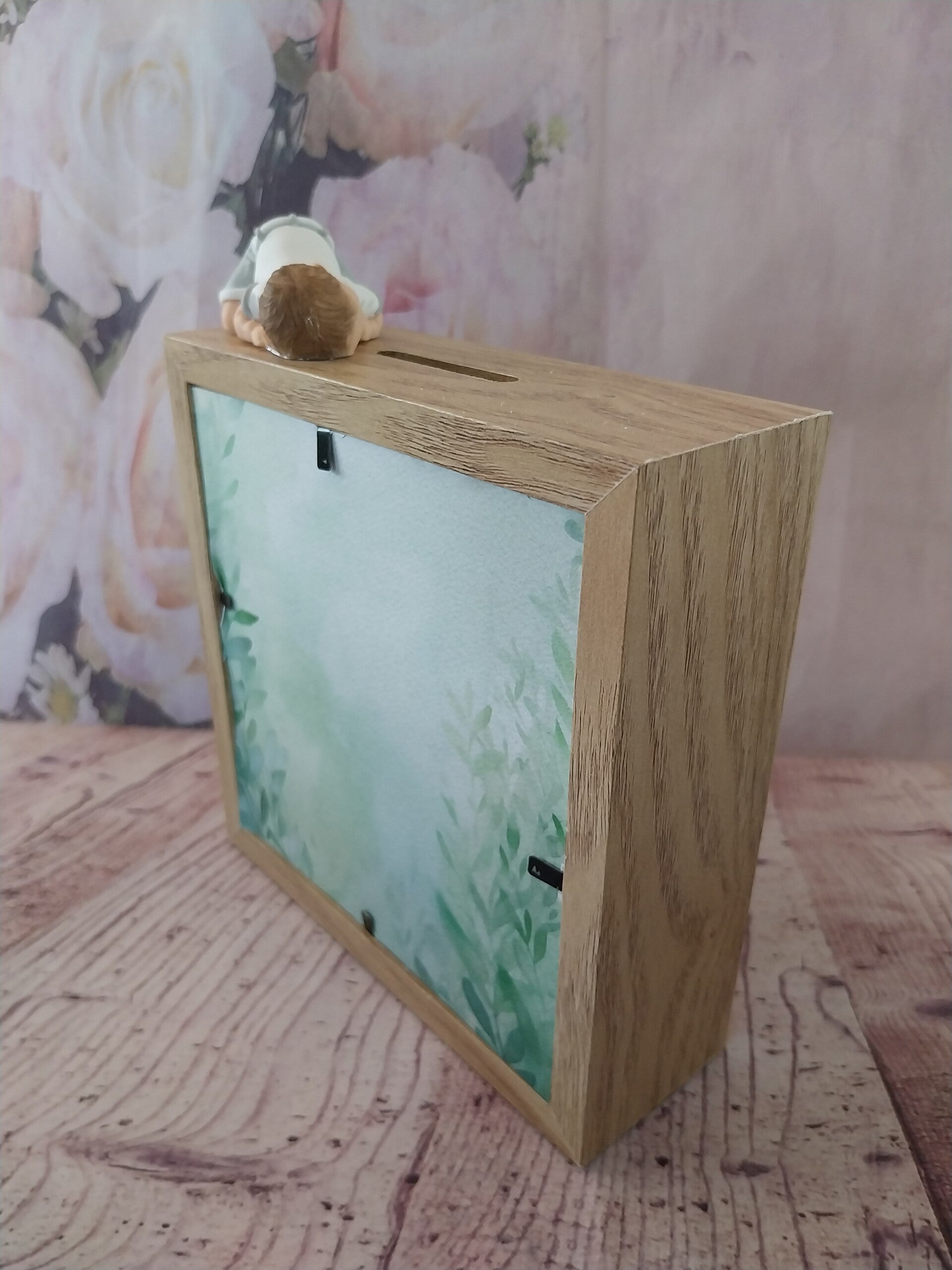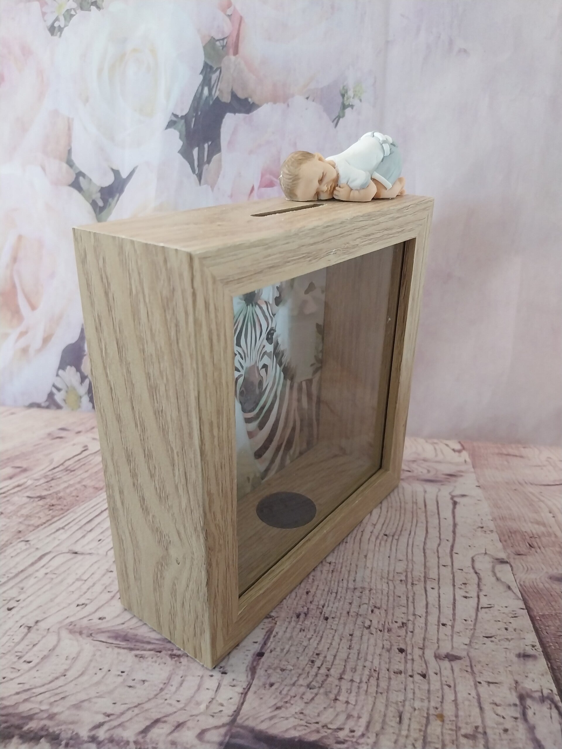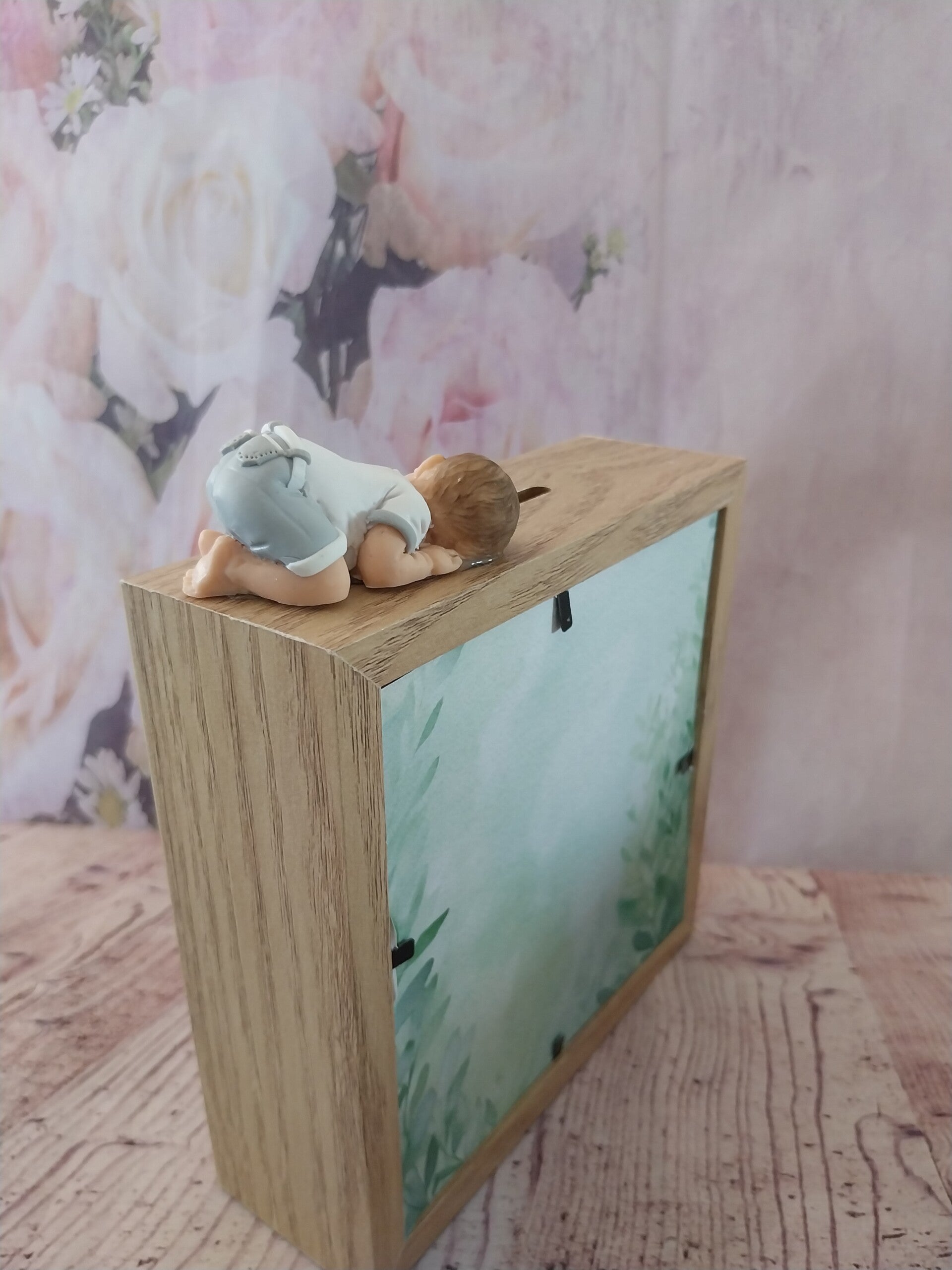 Tirelire en bois avec bébé fimo garçon en short et t-shirt gris et blanc