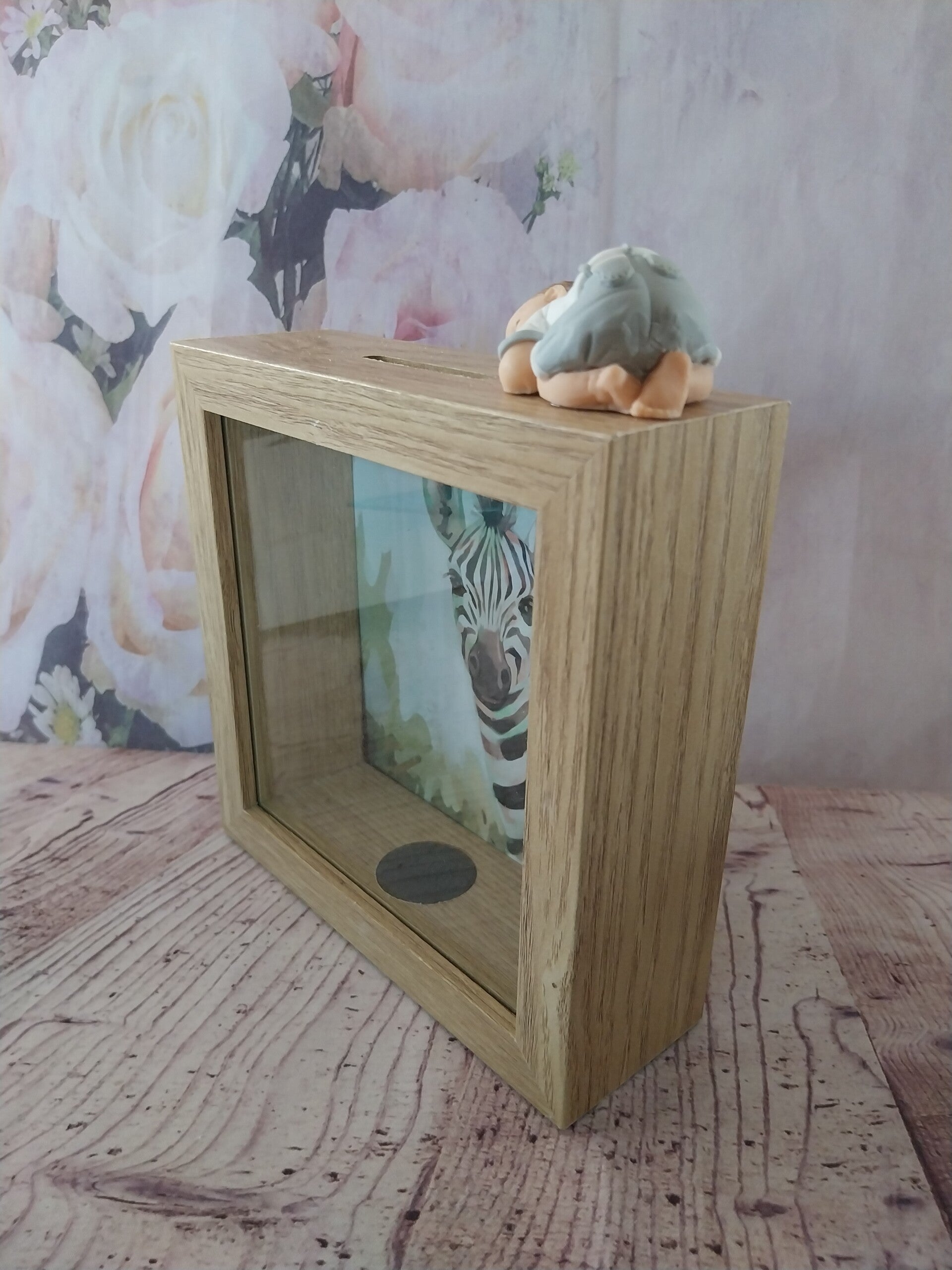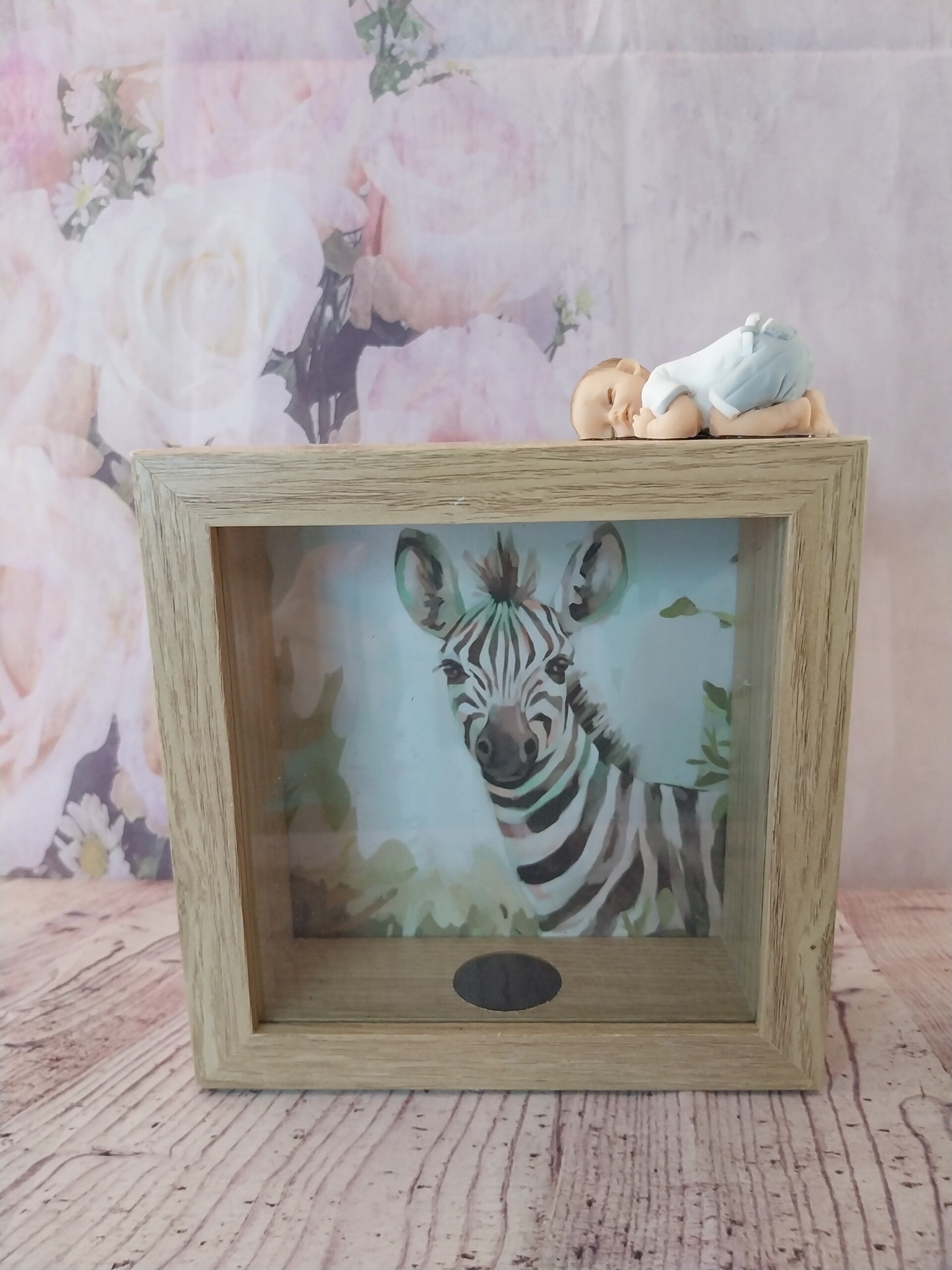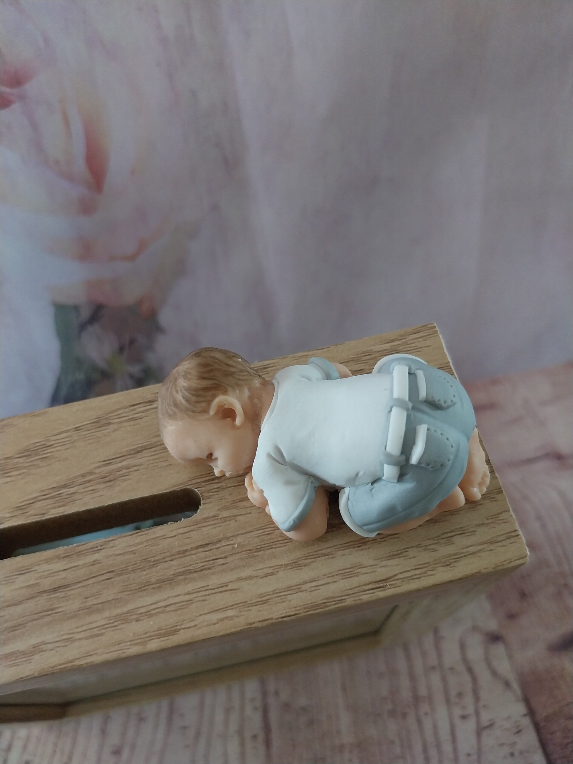 Tirelire en bois avec bébé fimo garçon en short et t-shirt gris et blanc