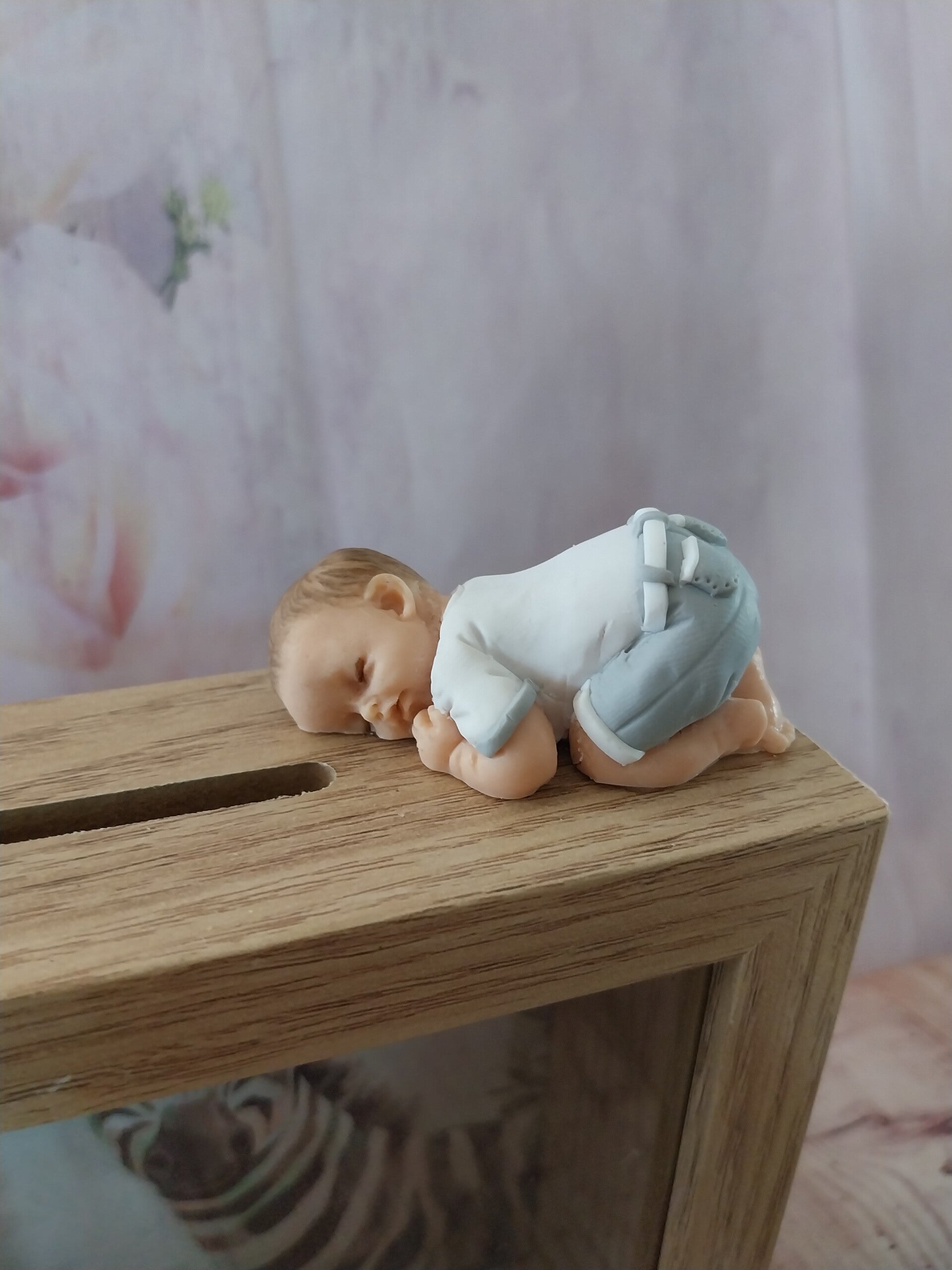 Tirelire avec bébé fimo garçon vêtements gris blanc