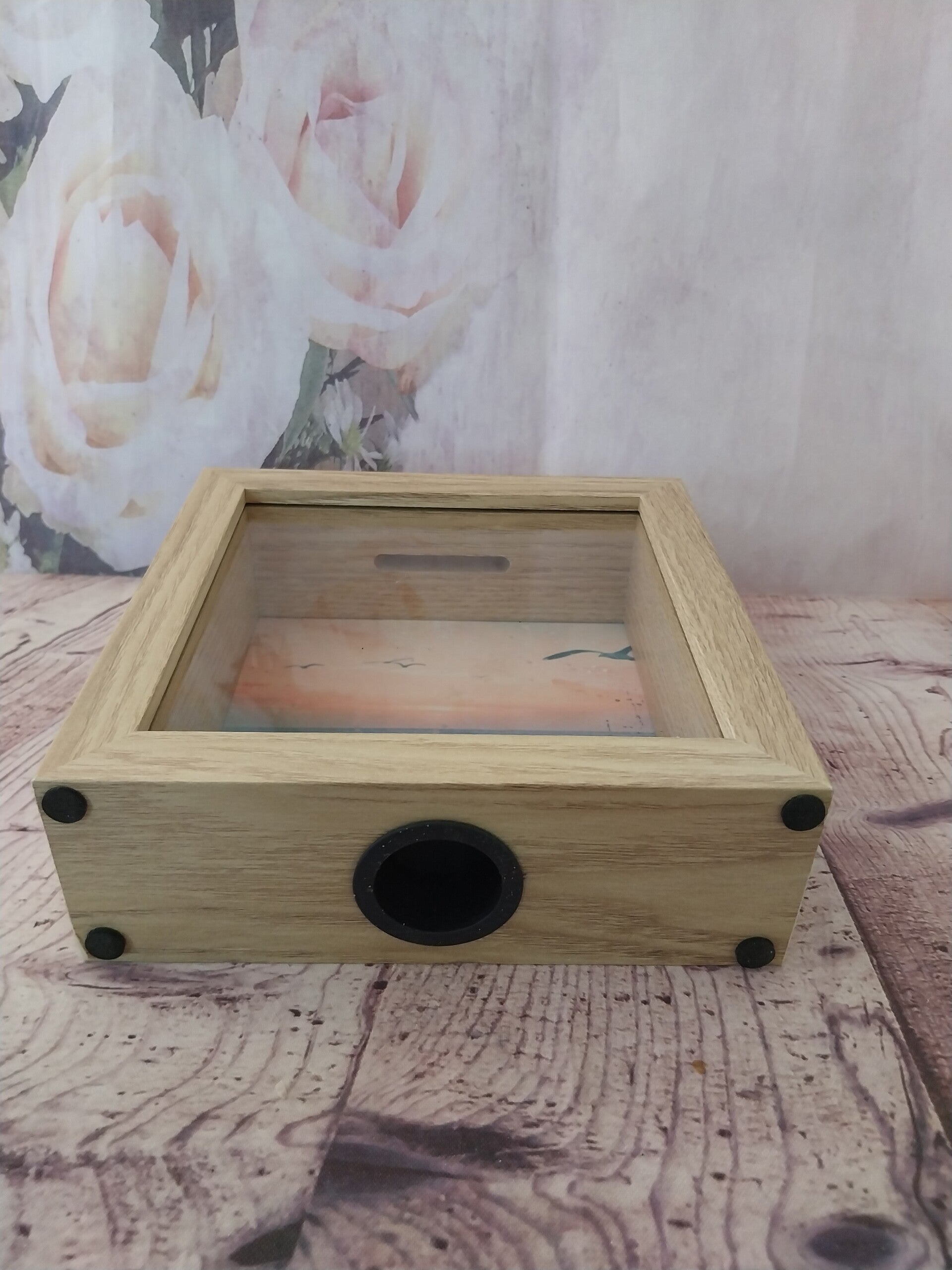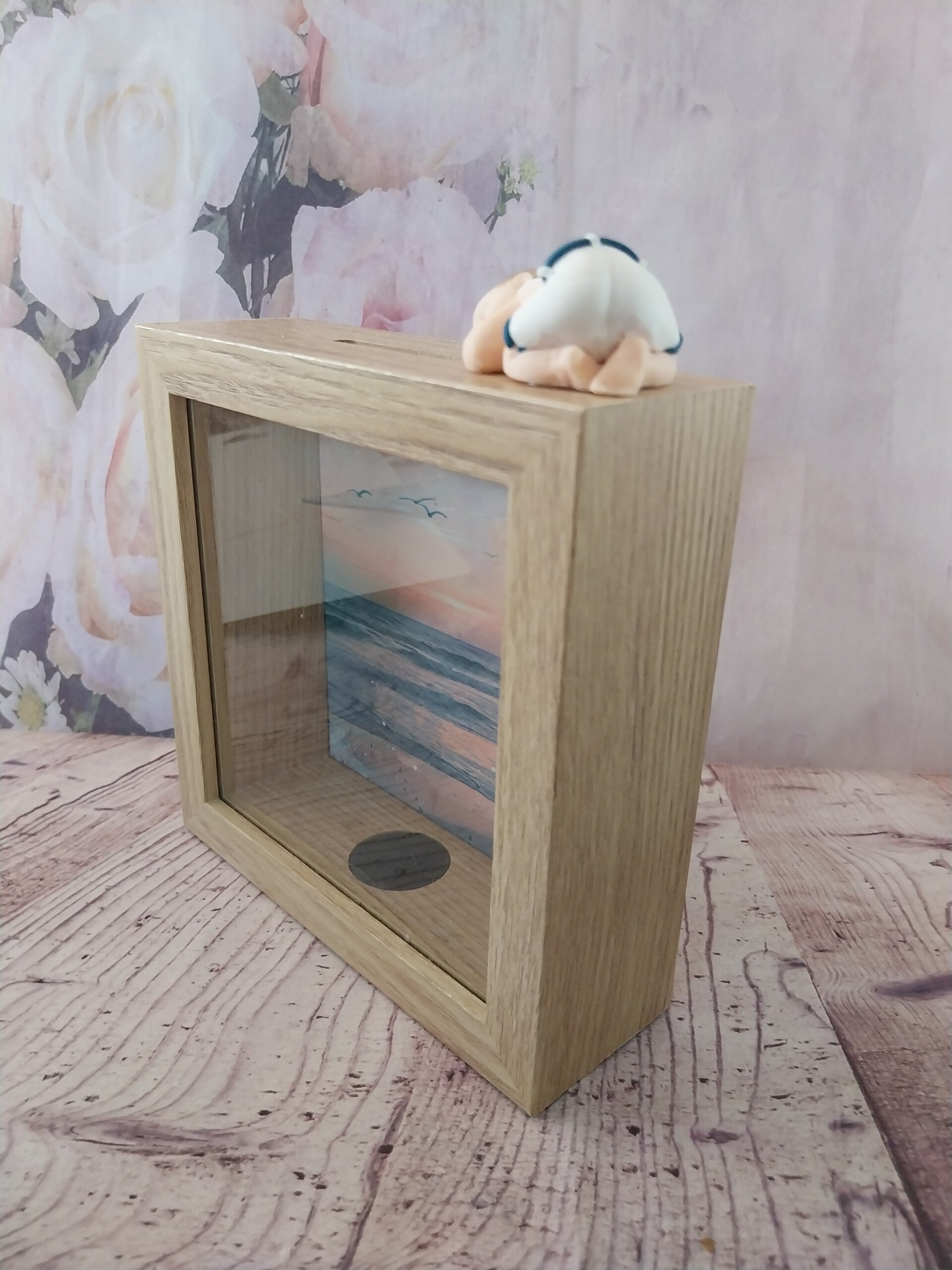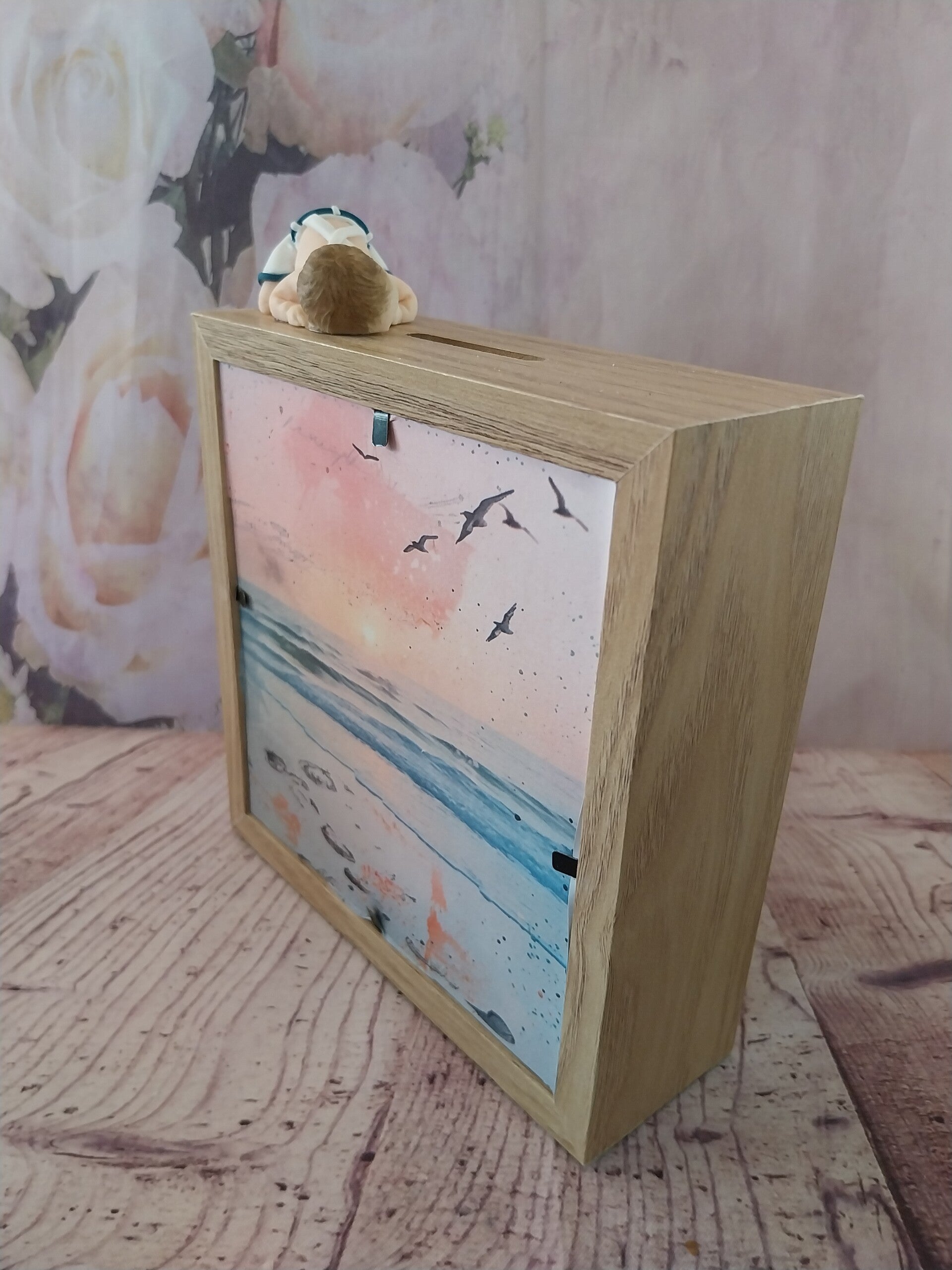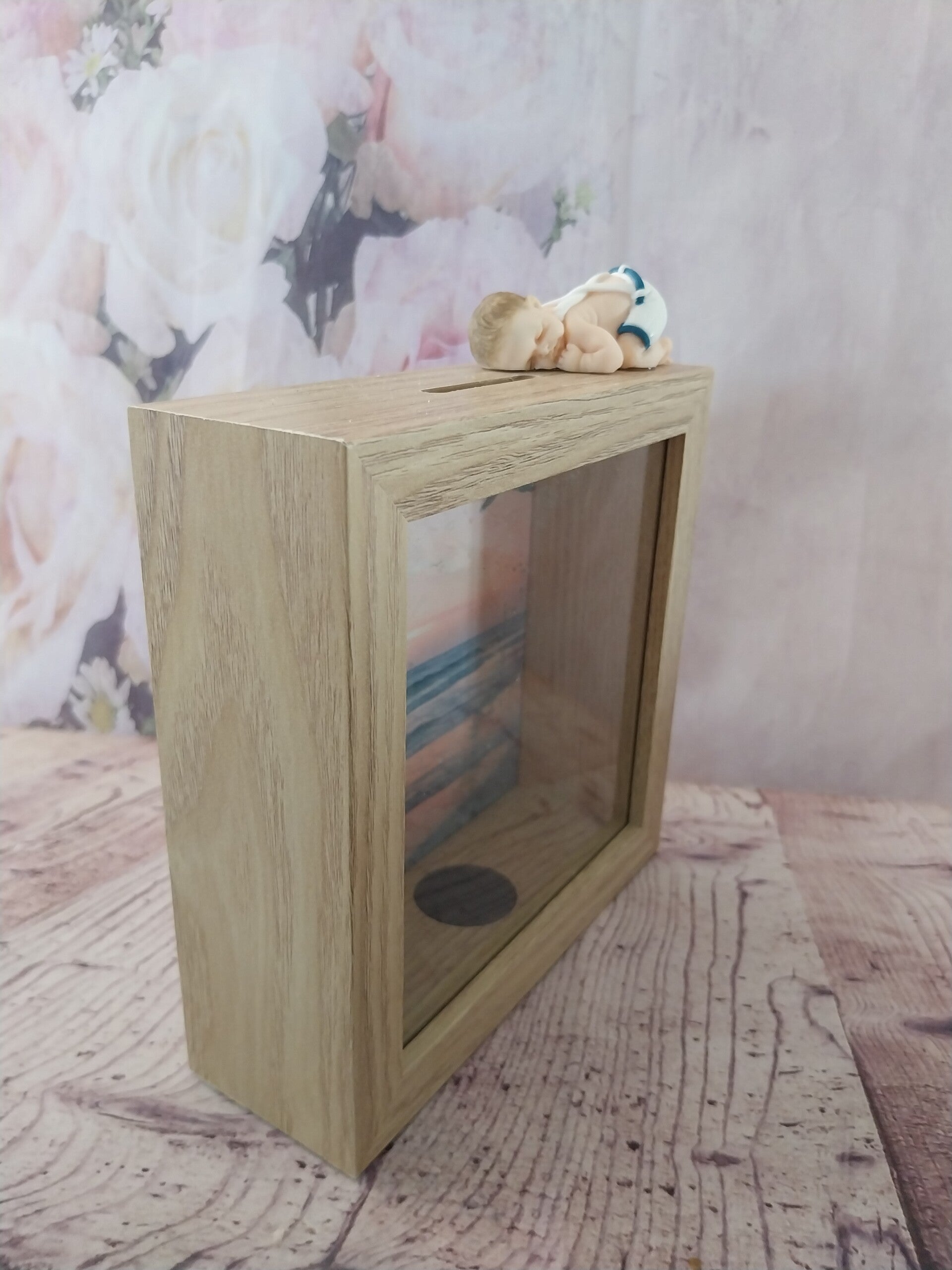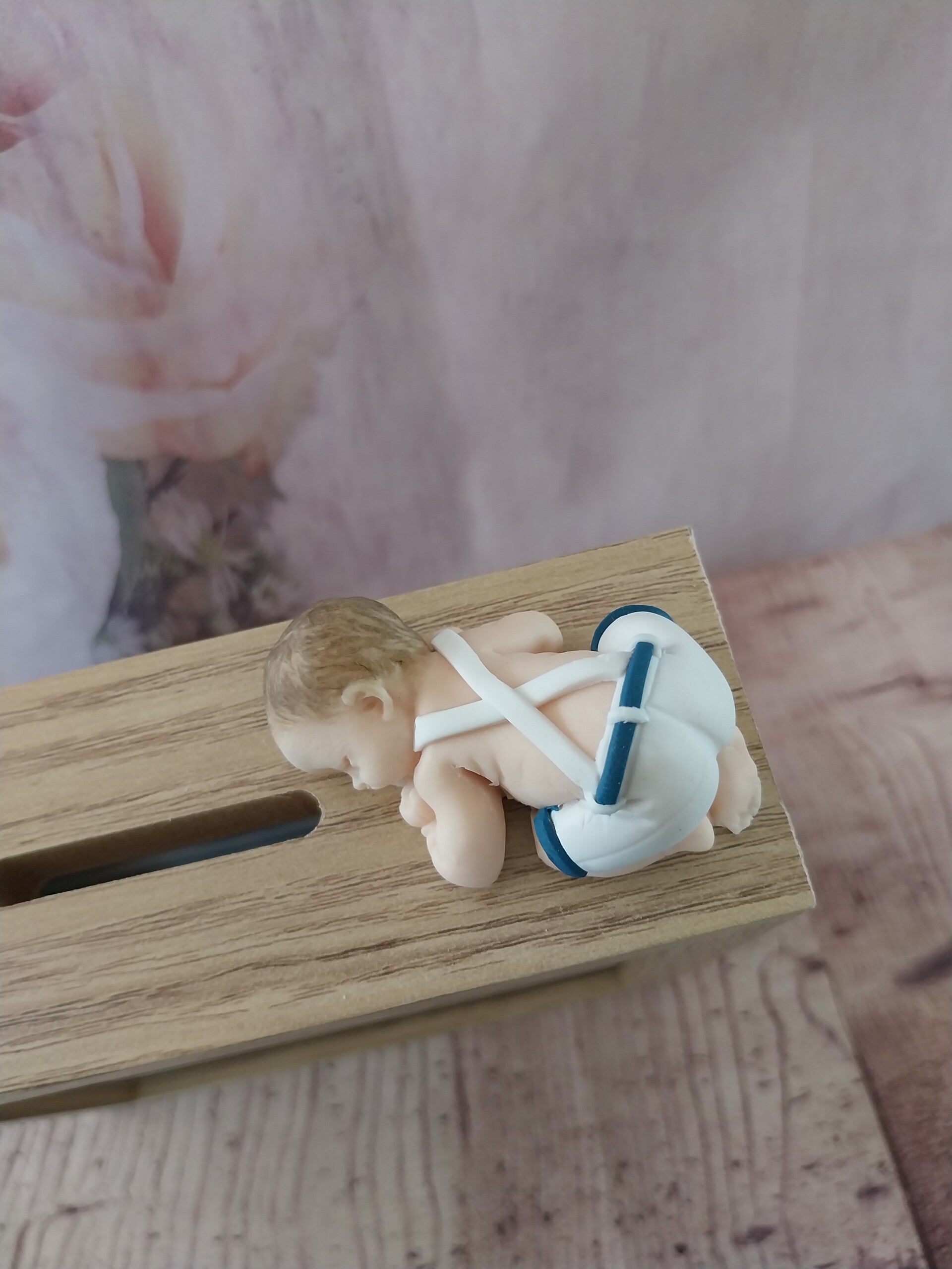 Tirelire en bois avec bébé fimo garçon en salopette blanc et bleu foncé