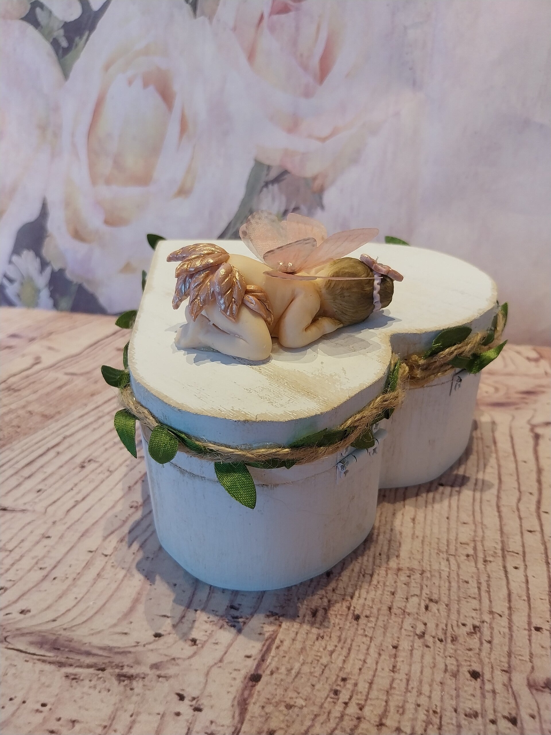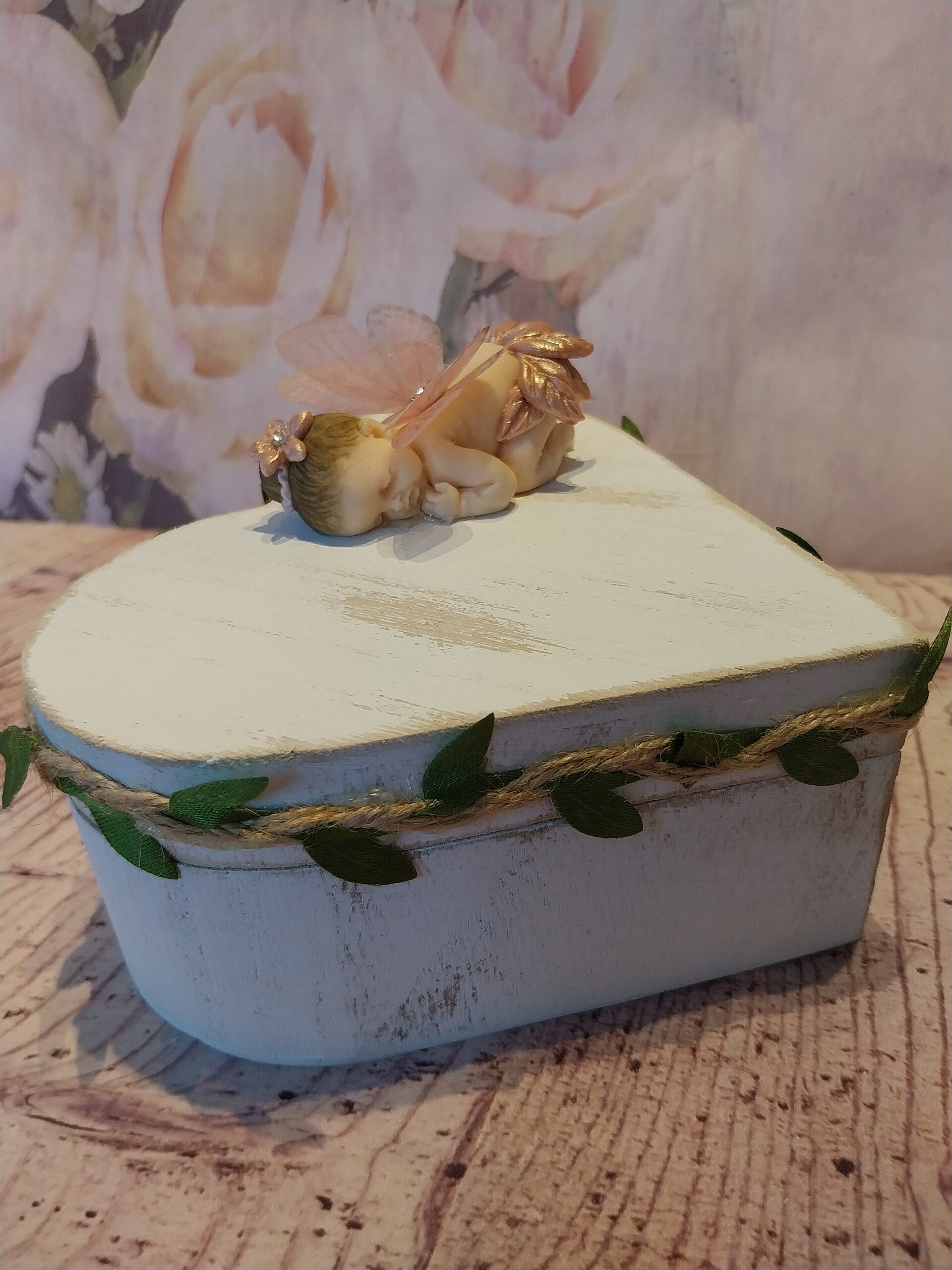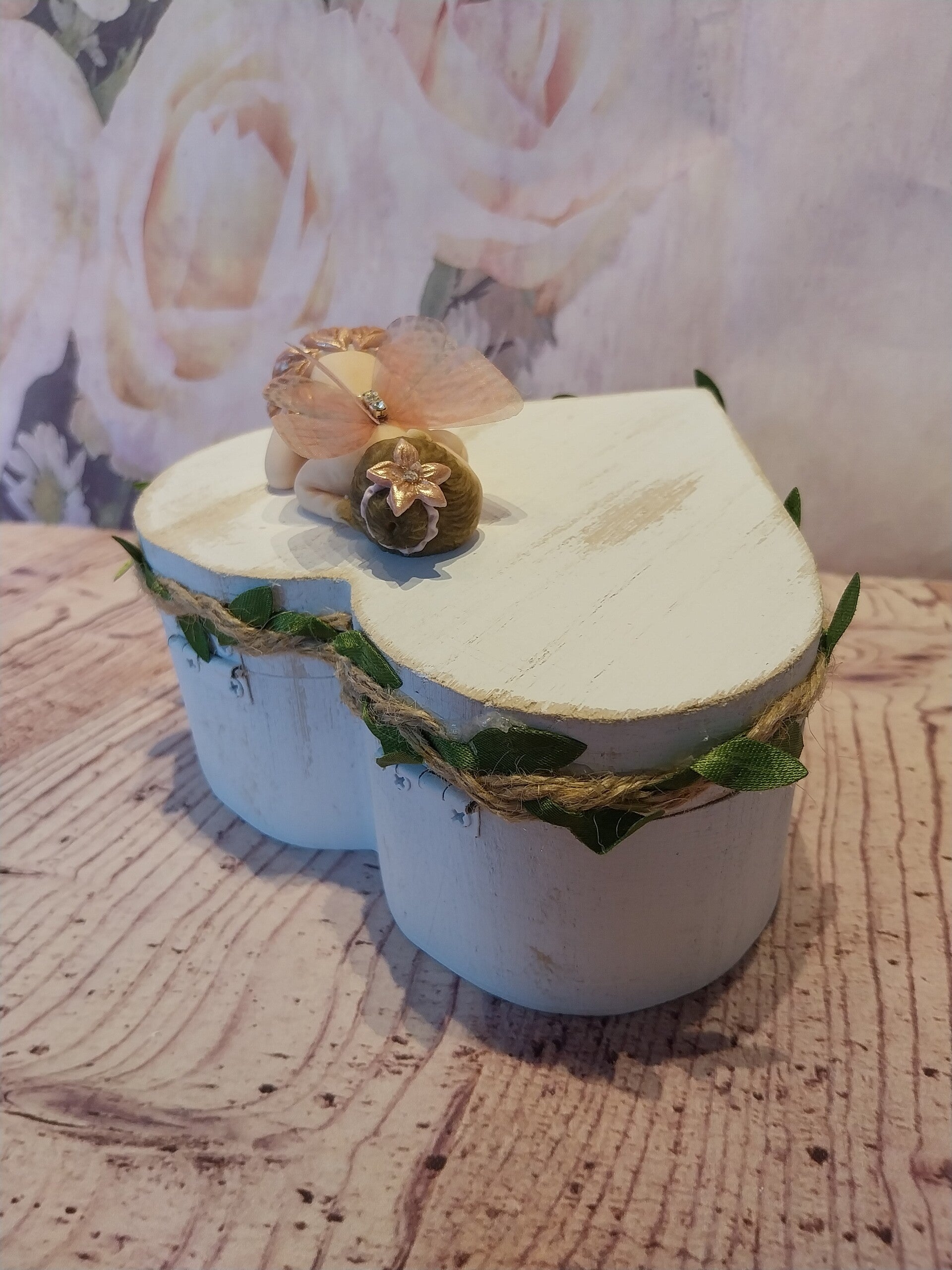 Boîte en forme d'un cœur en bois avec bébé fimo fille papillon