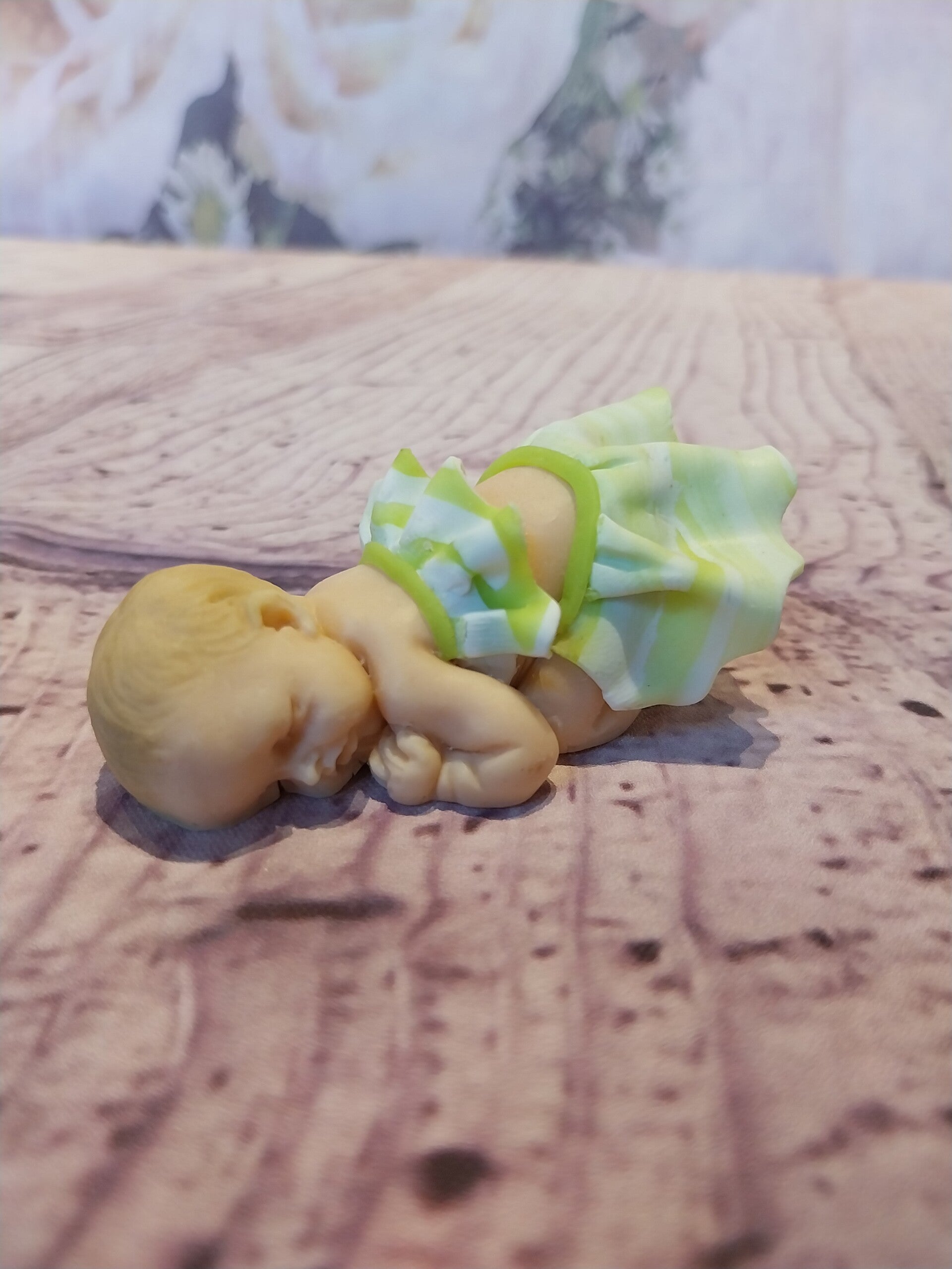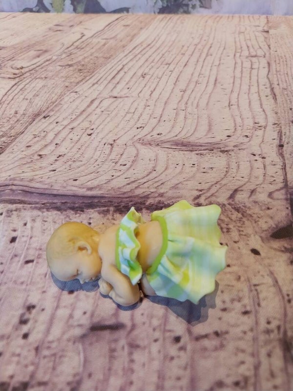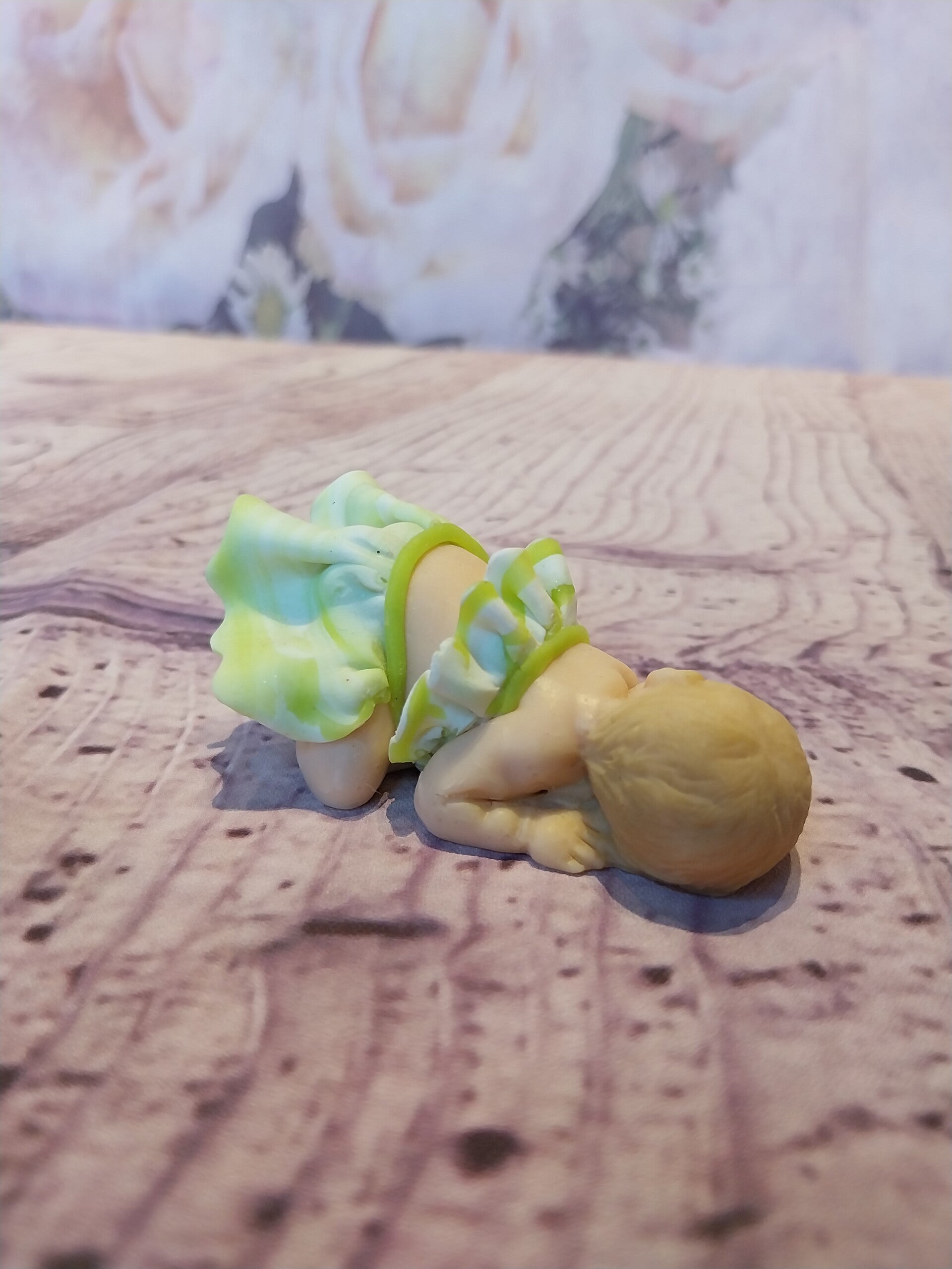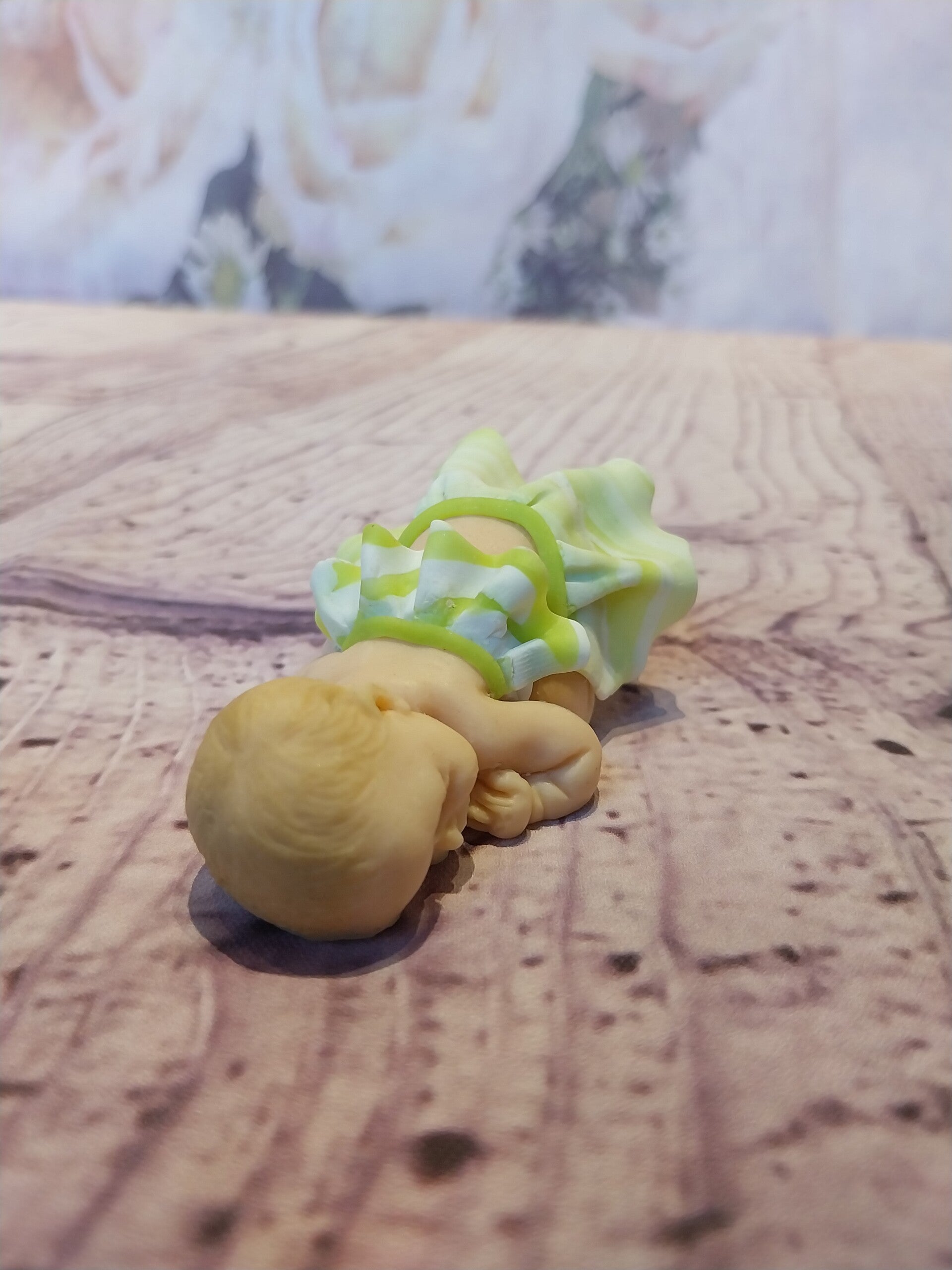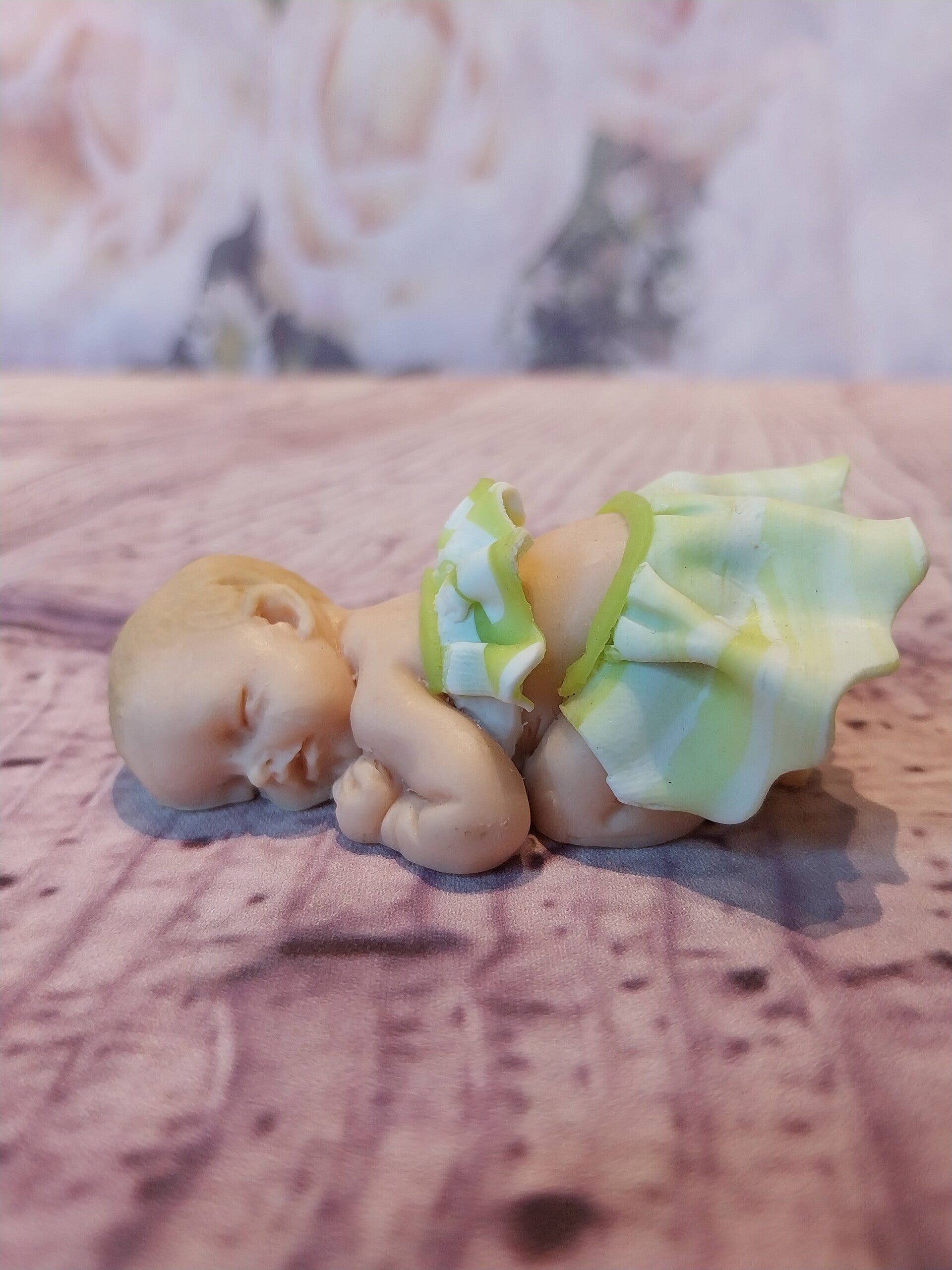 Bébé fimo avec cheveux blonde vêtements blanc et vert