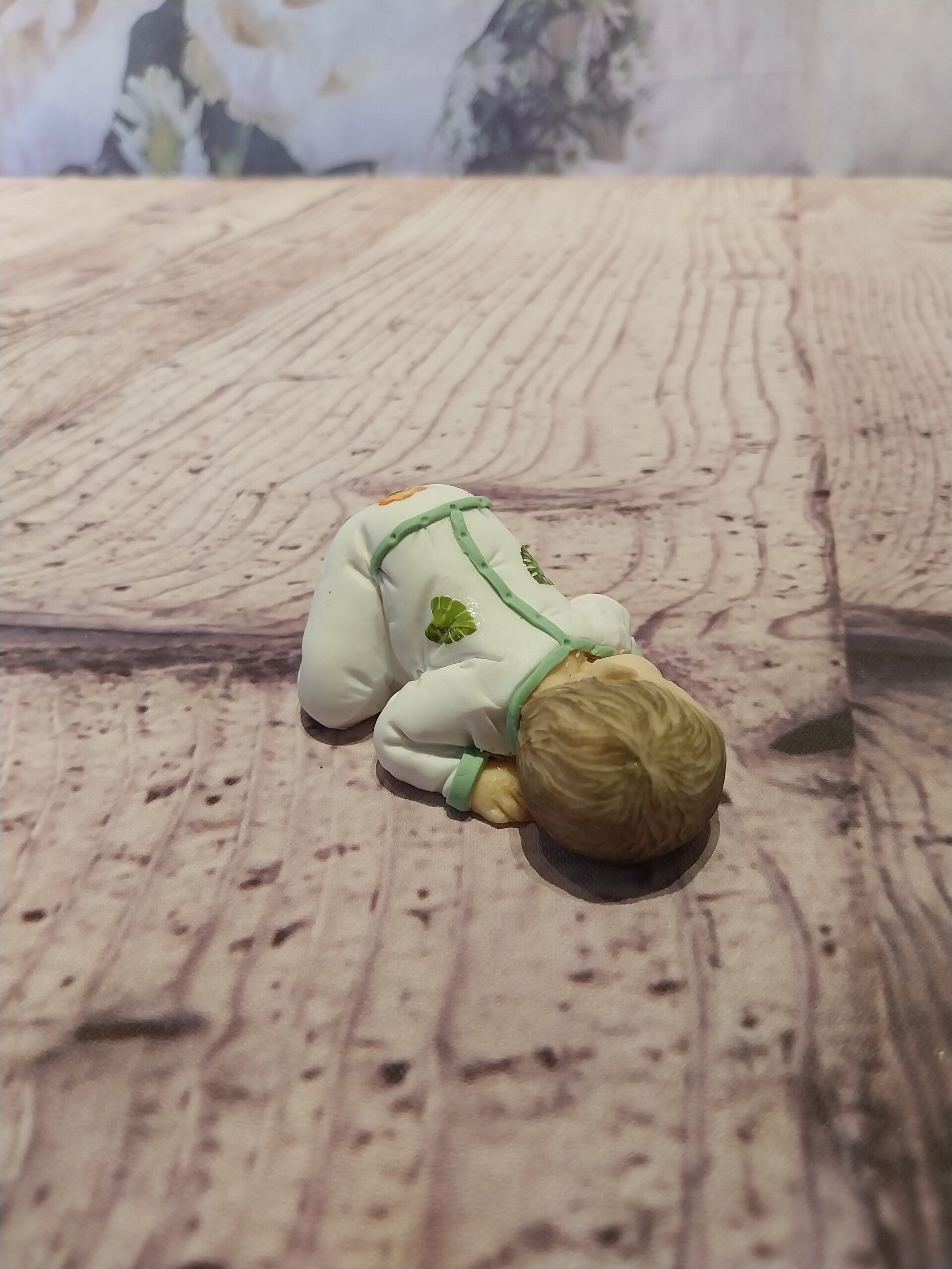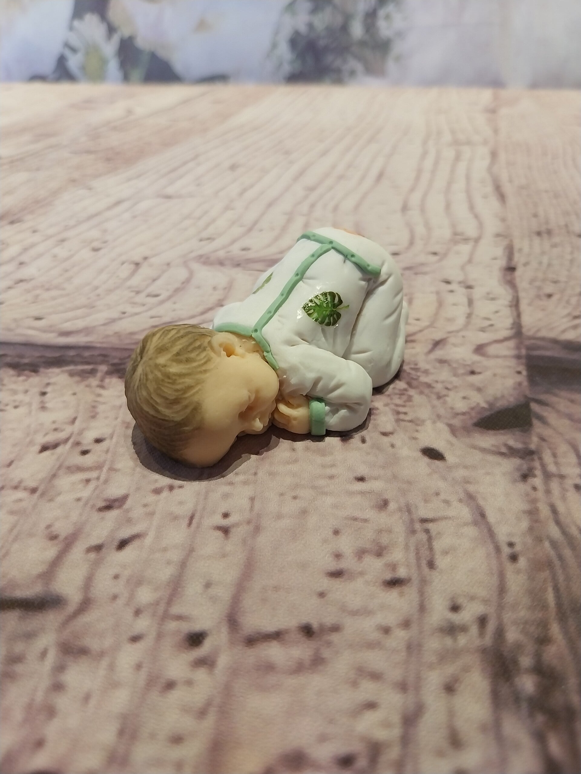 Bébé en fimo fille en pyjama 1 pièce blanc vert