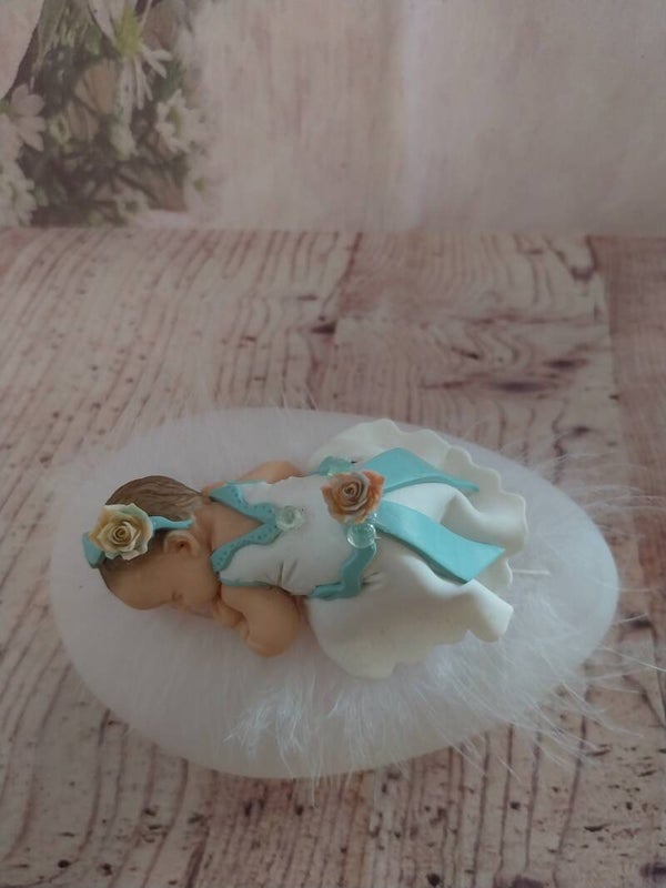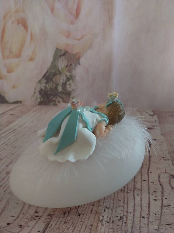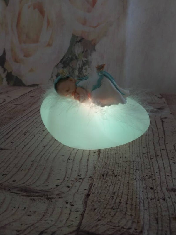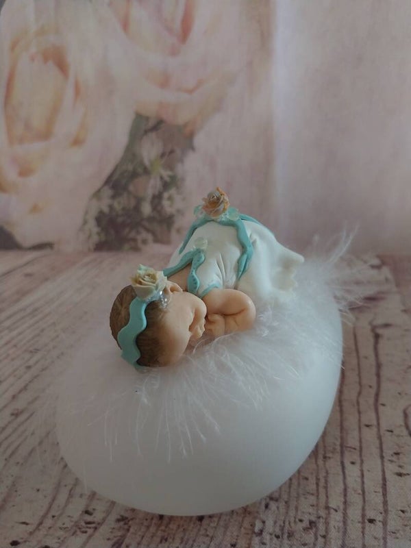 Veilleuse galet led avec bébé fimo fille en robe blanche et vert