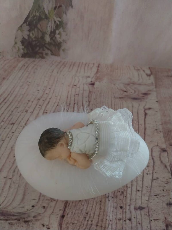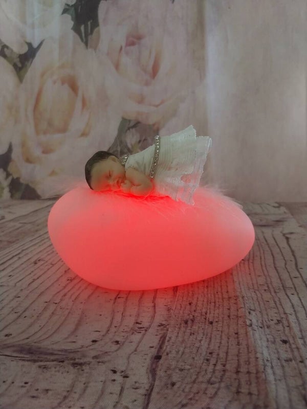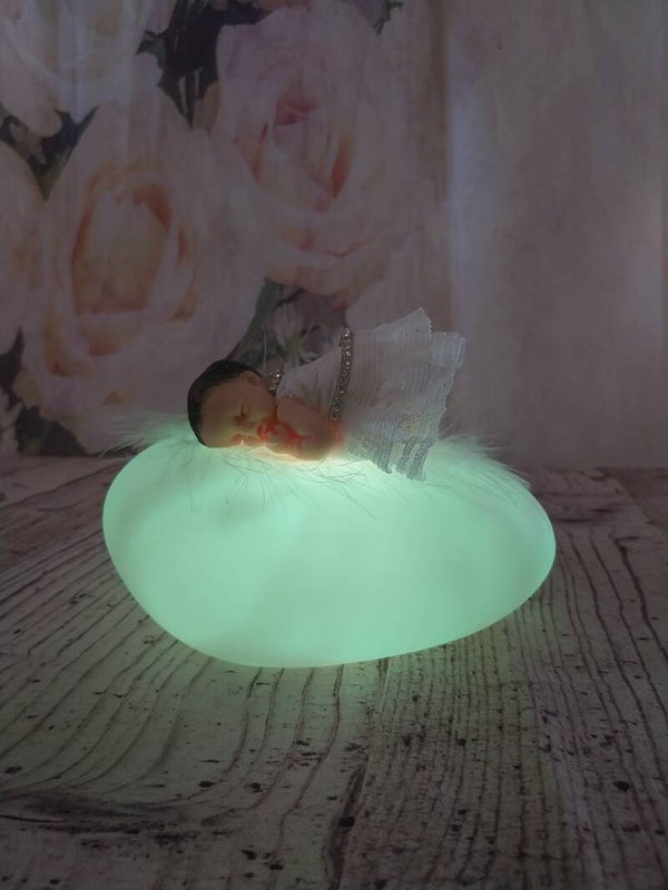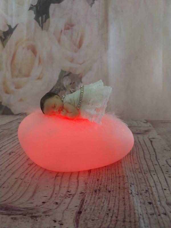 Veilleuse galet led avec bébé fimo fille avec robe blanche cheveux noir.