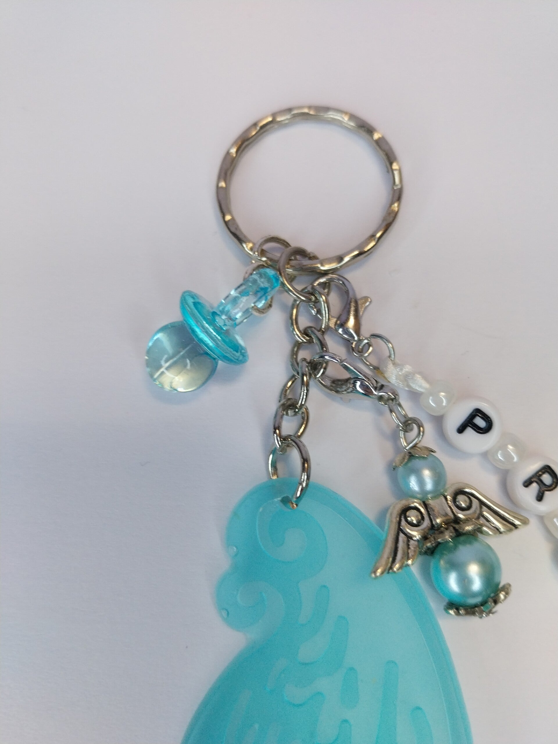 Porte clef avec aile en résine, breloque ange et tétine en plastique bleu.