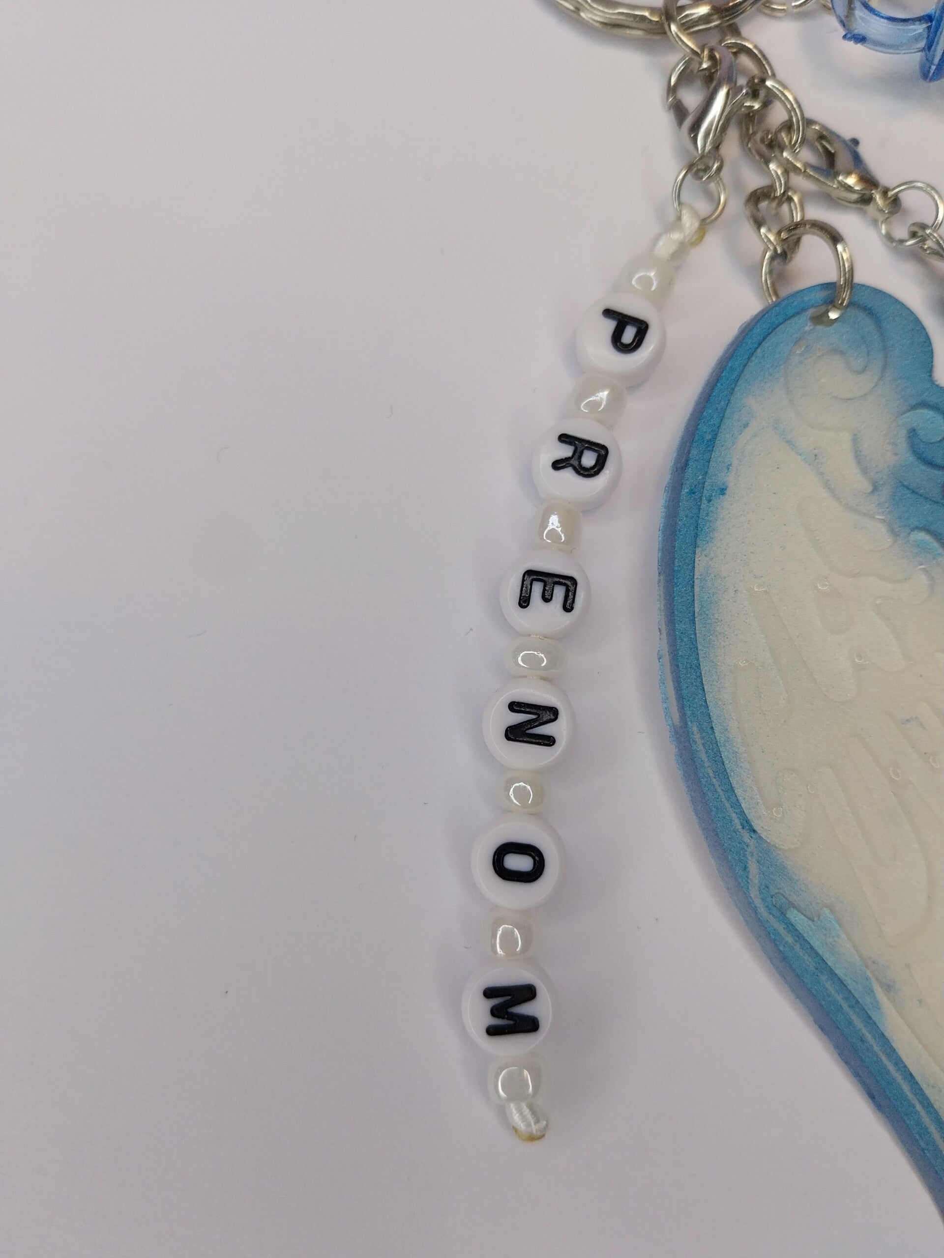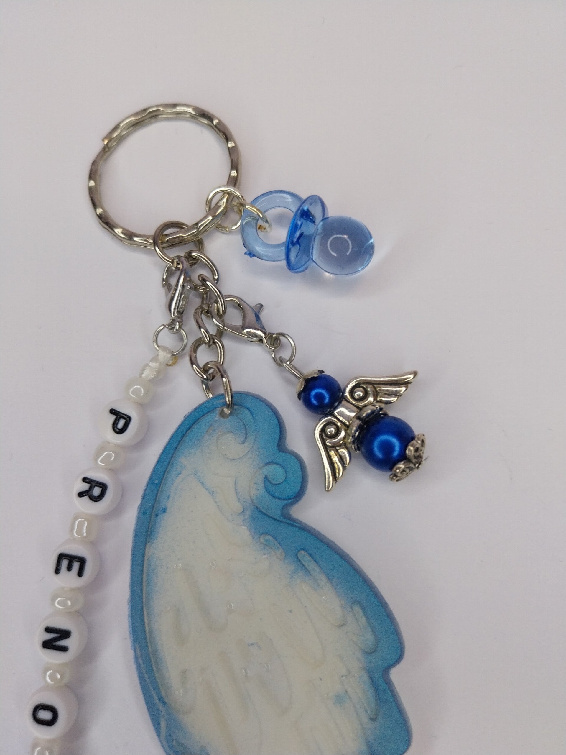 Porte clef avec aile en résine, breloque ange et tétine en plastique bleu.