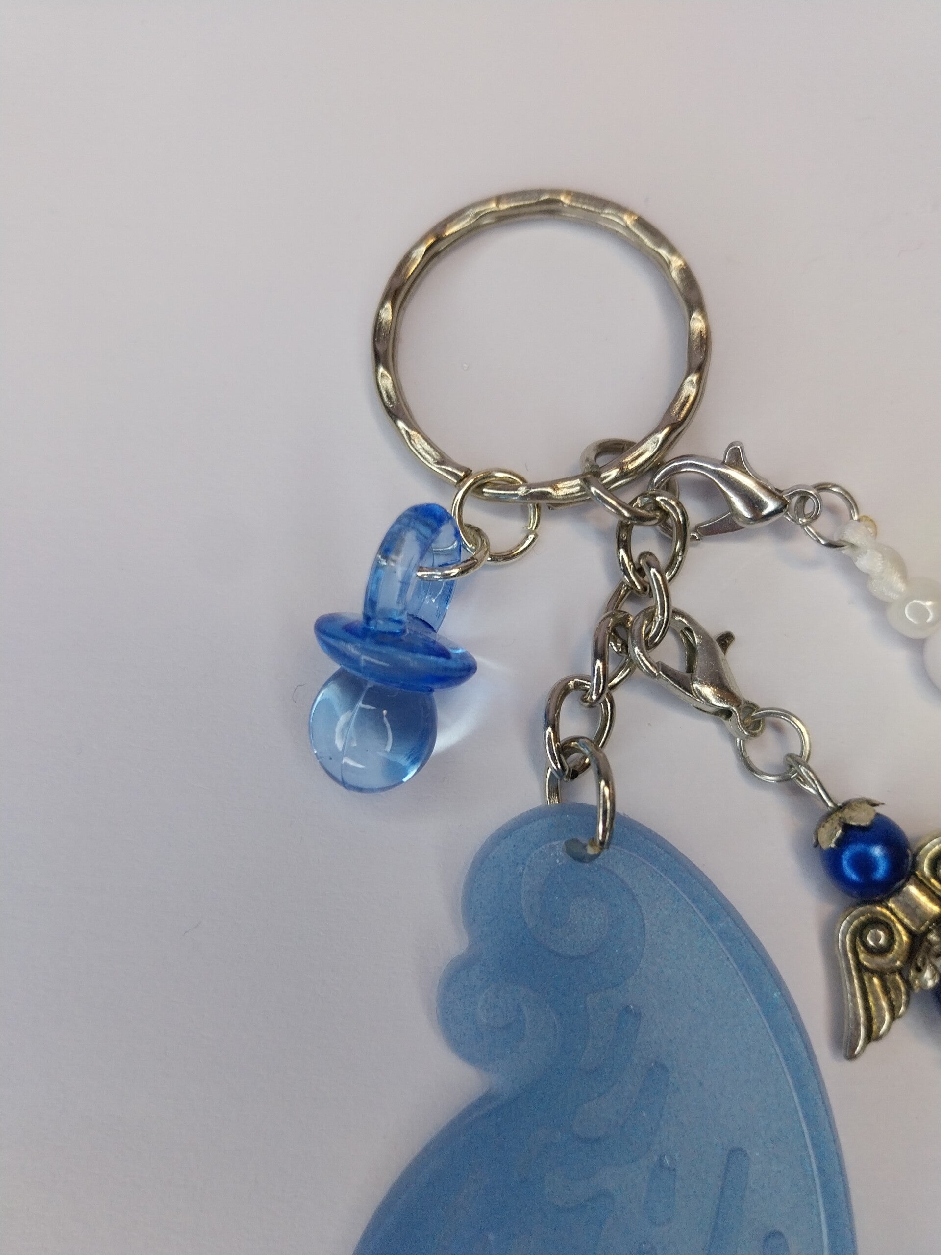 Porte clef avec aile en résine, breloque ange et tétine en plastique bleu.