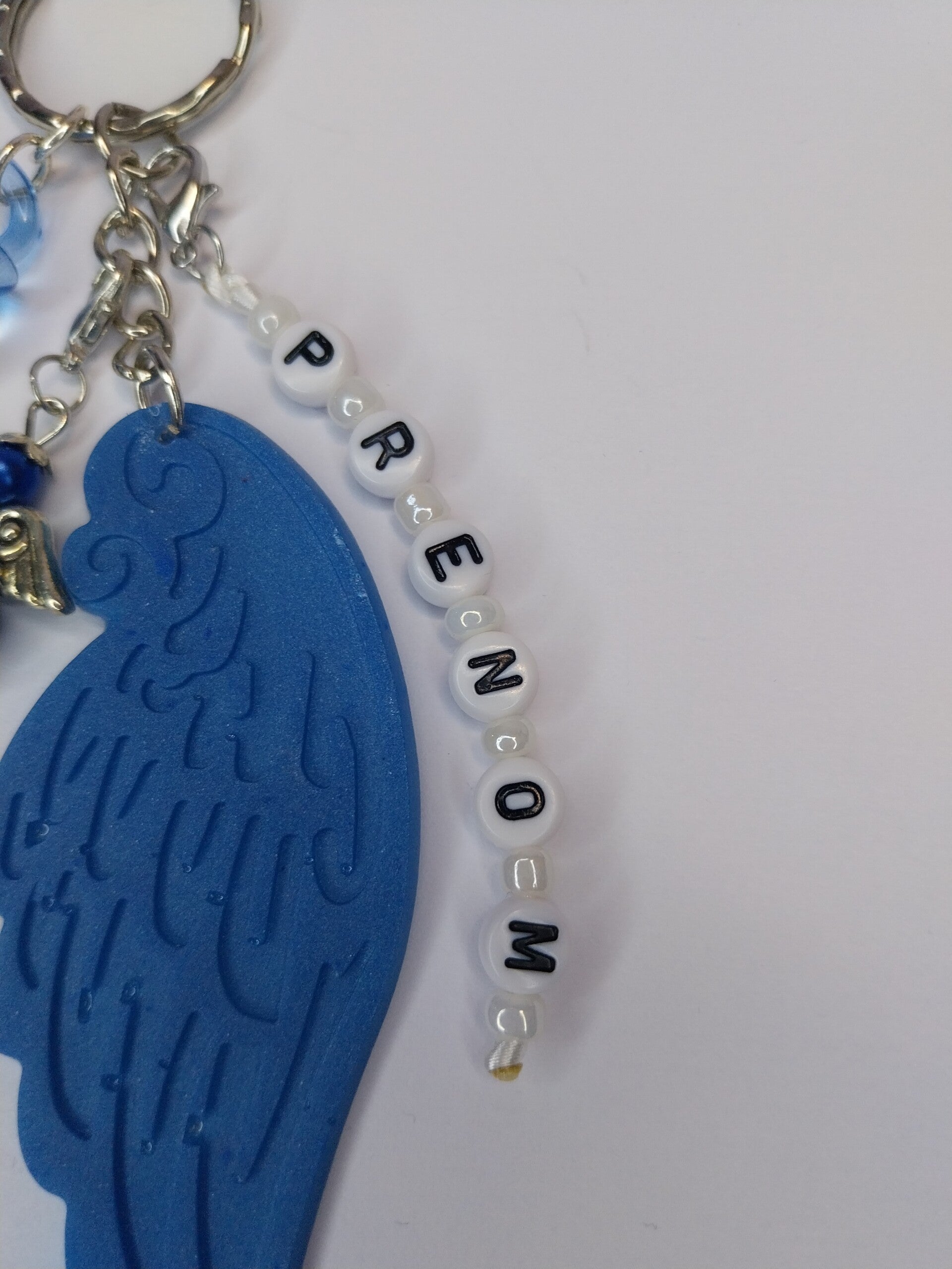 Porte clef avec aile en résine, breloque ange et tétine en plastique bleu.