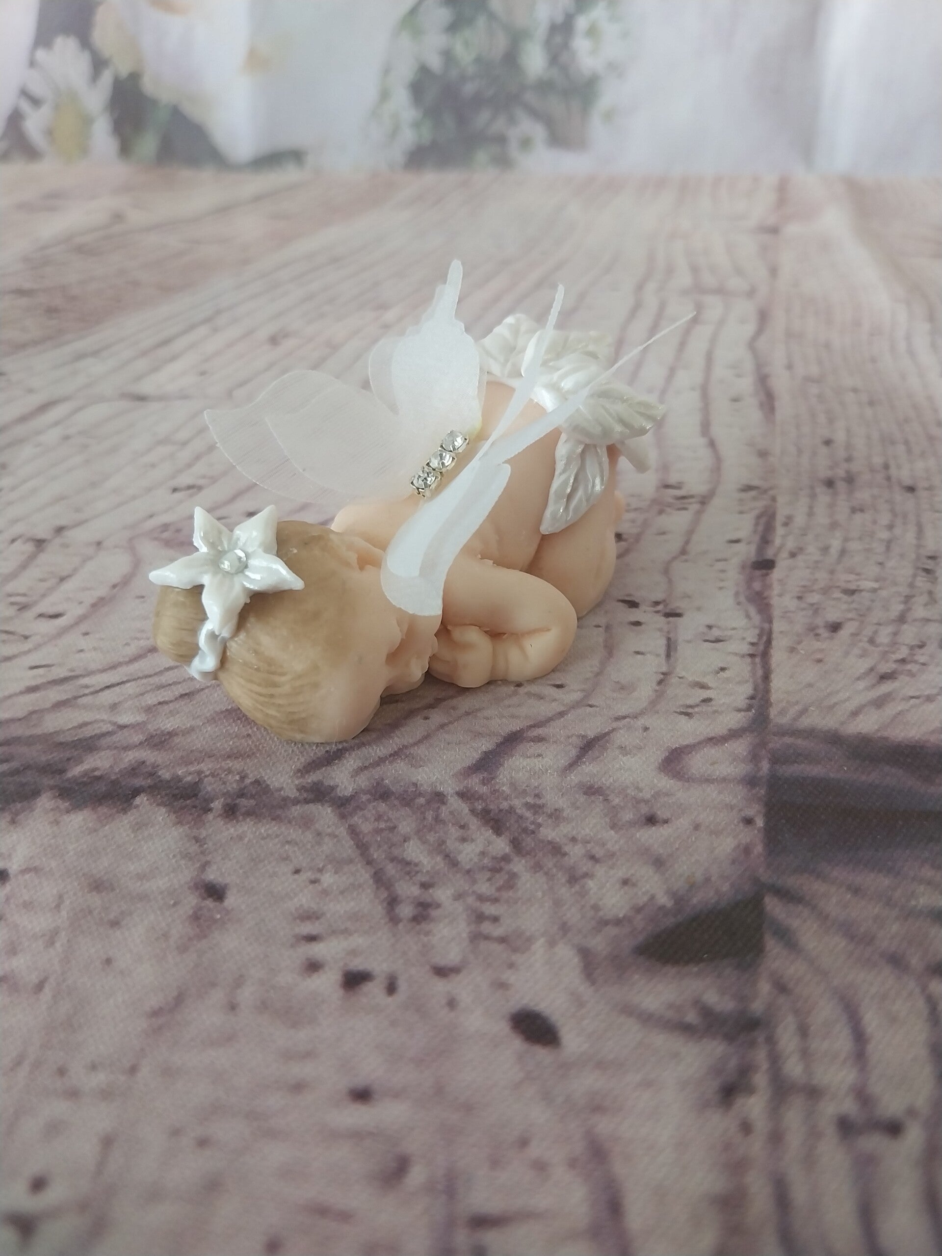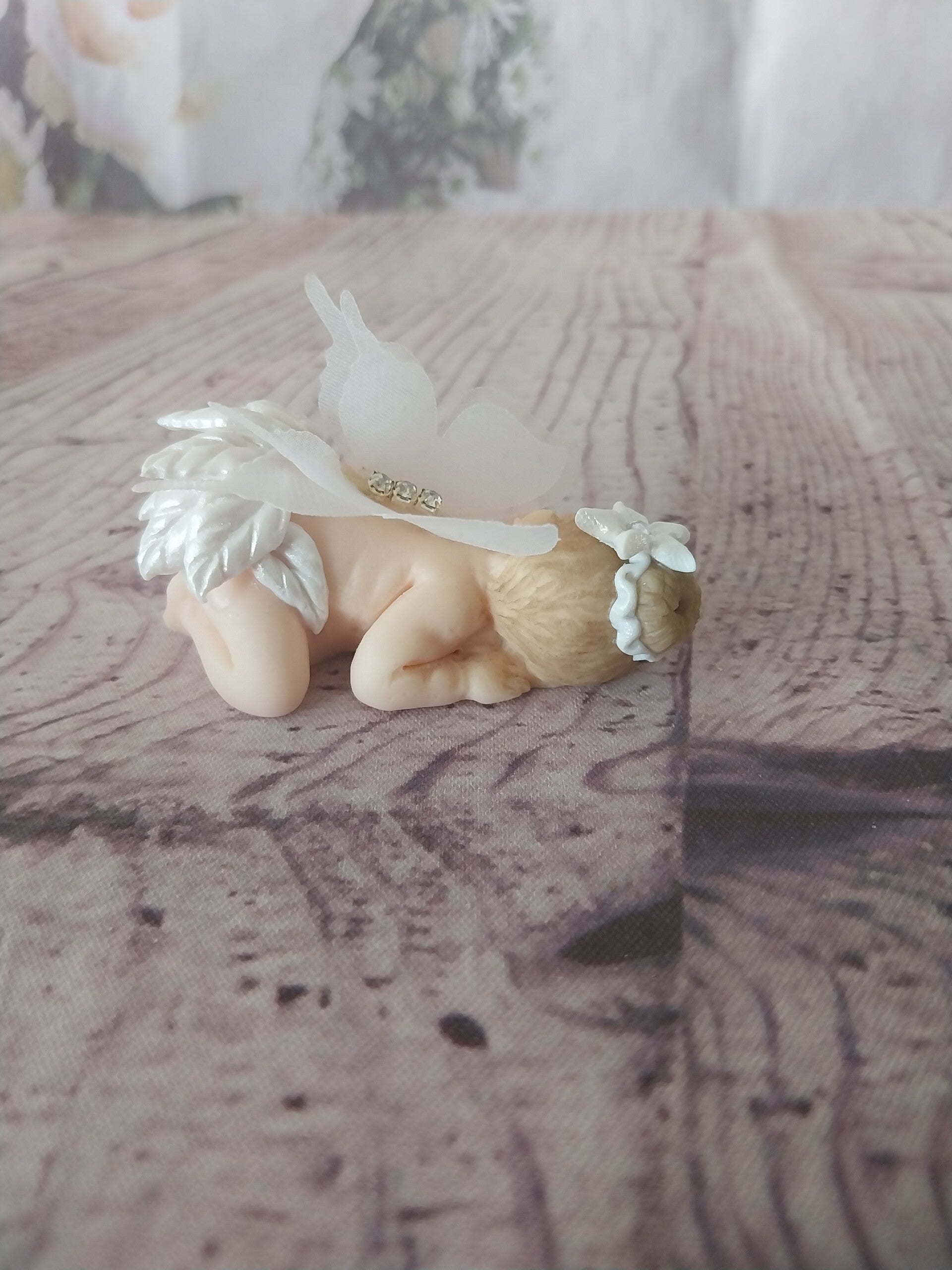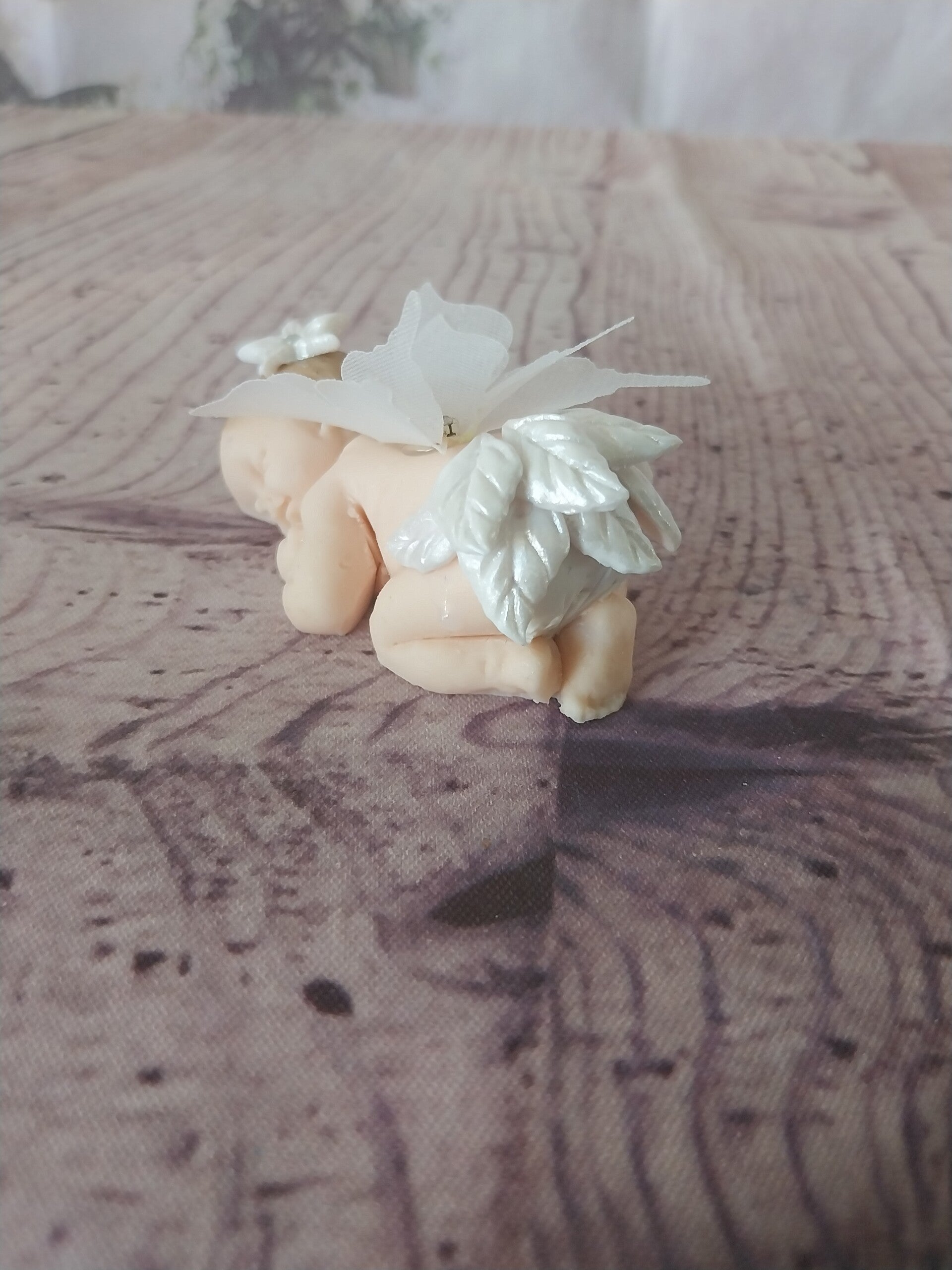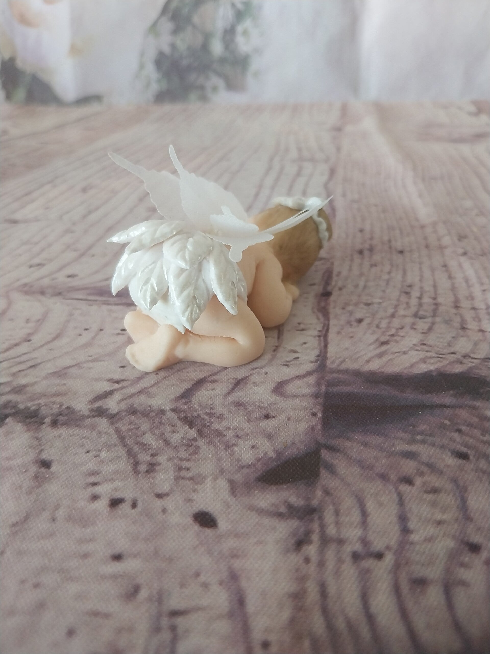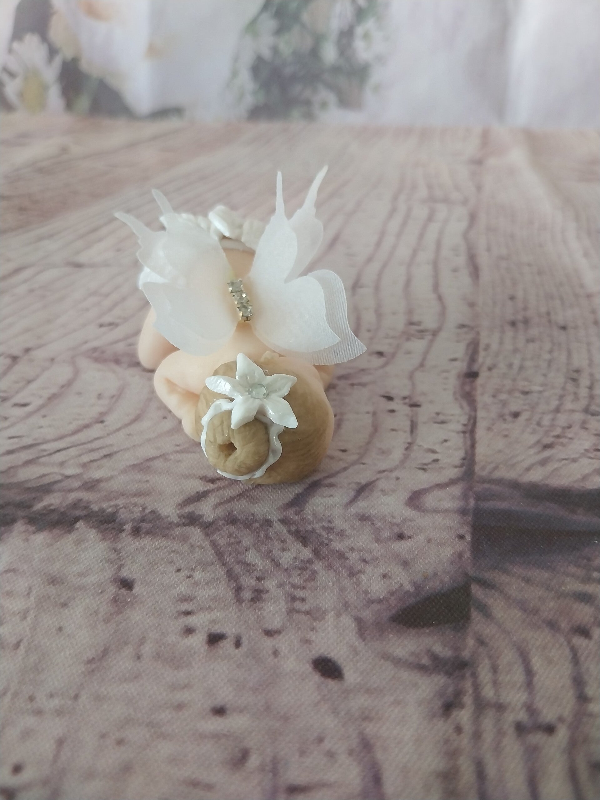 Figurine bébé fimo fille papillon en blanc avec chignon cheveux blonde