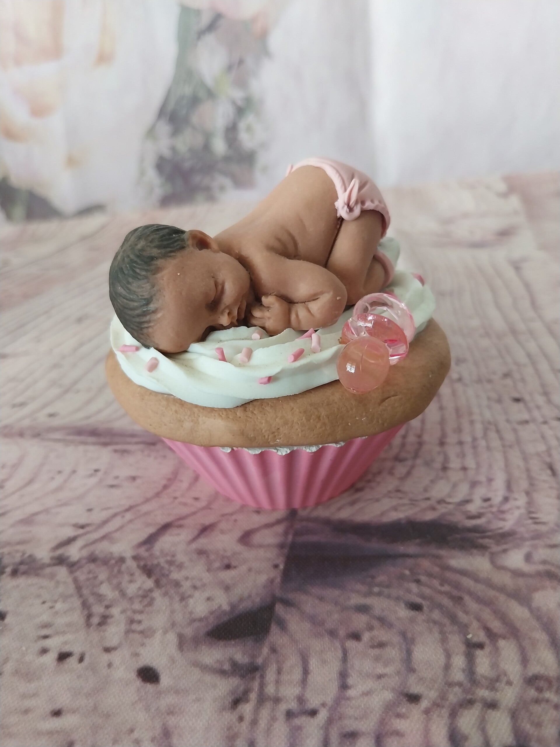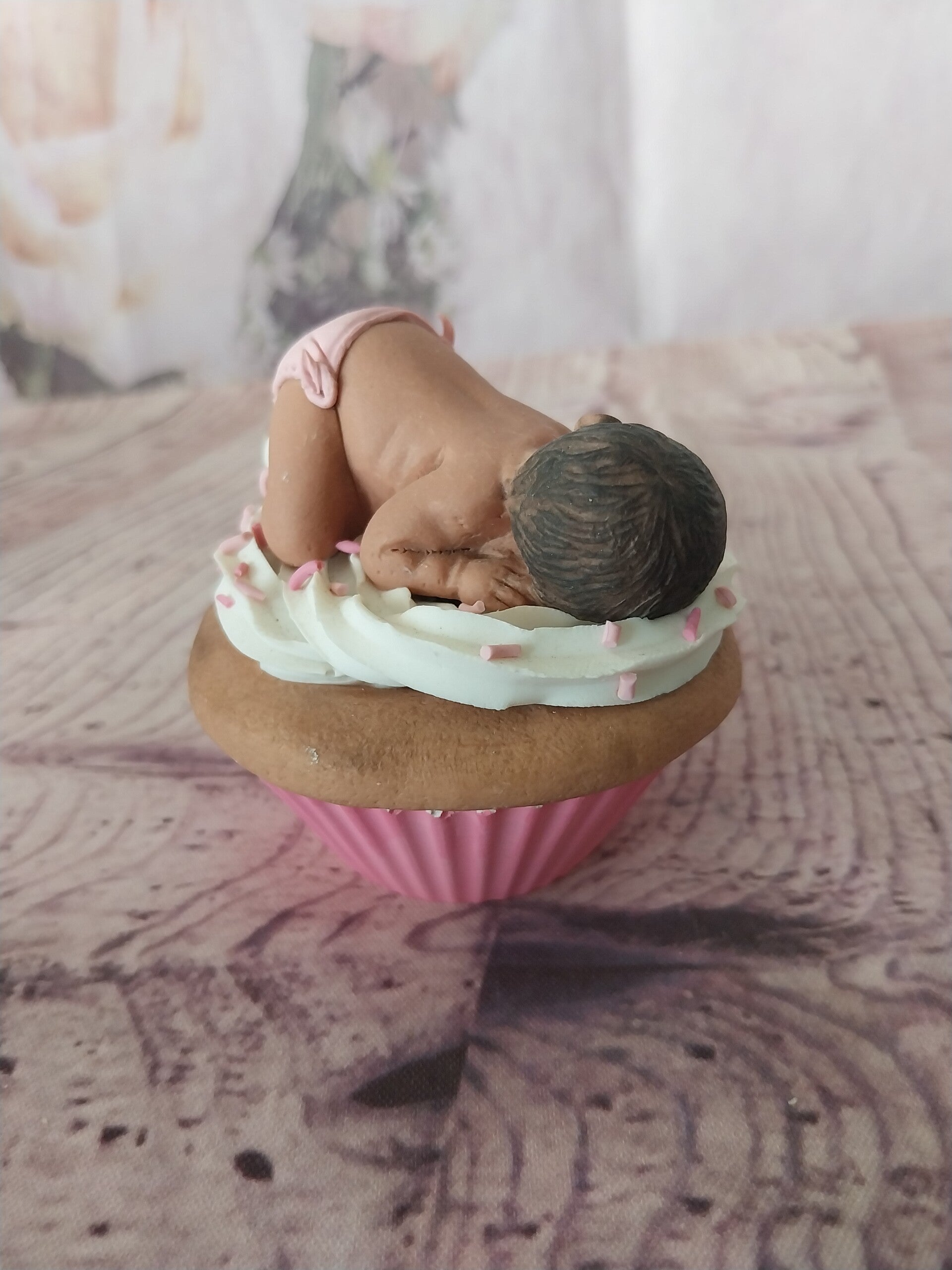 Bébé fimo fille peau foncé cheveux noir sur un cupcake en plâtre céramique et fimo