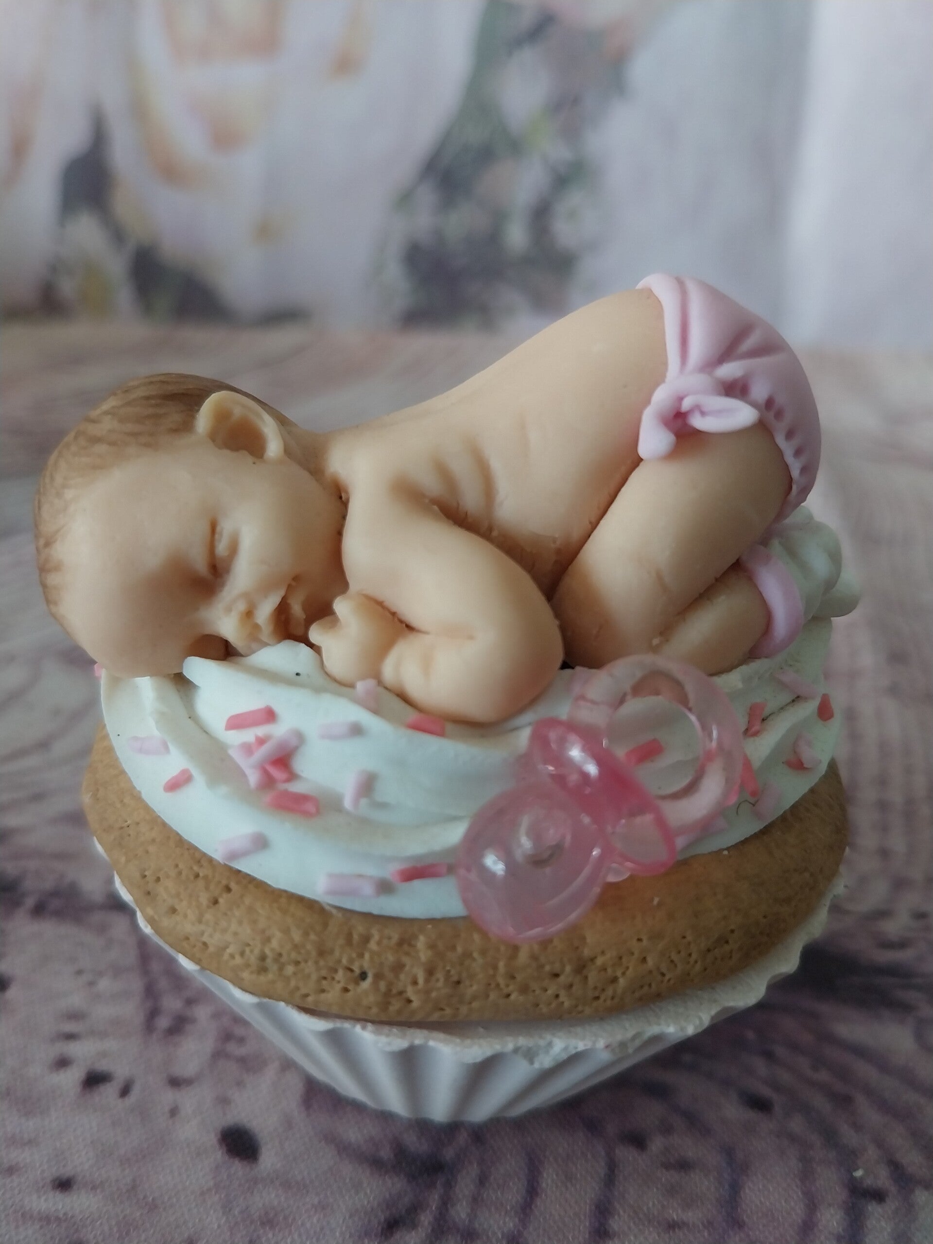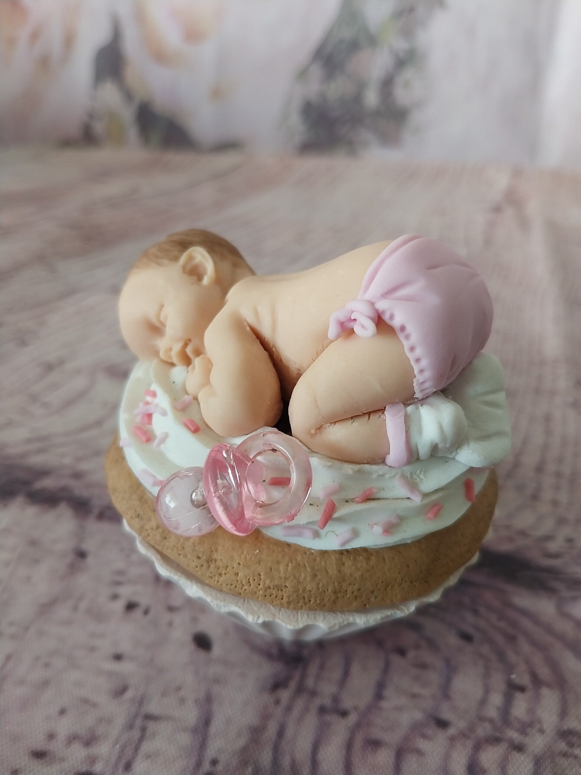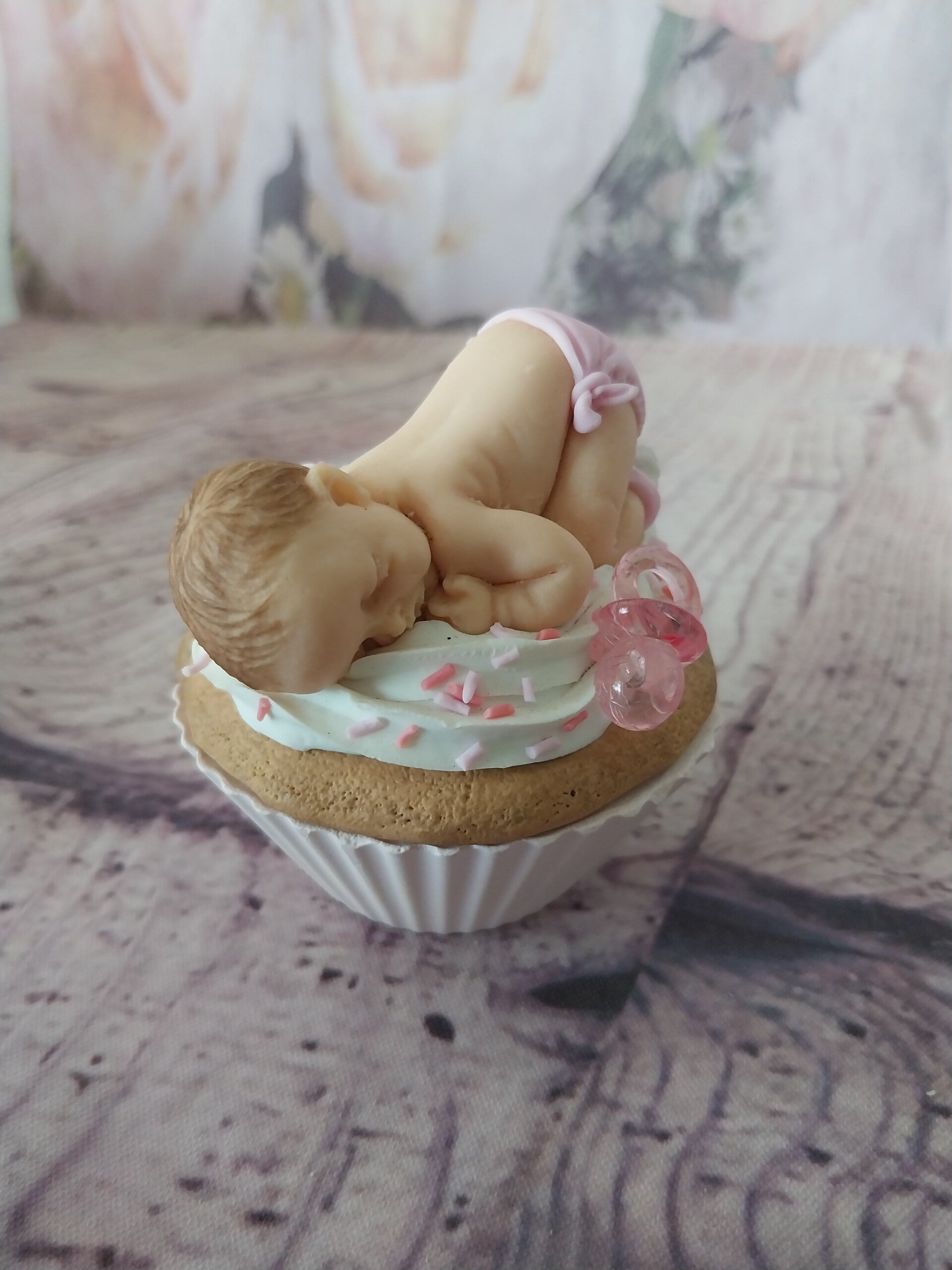 Figurine bébé fimo fille sur un cupcake en plâtre céramique et fimo.