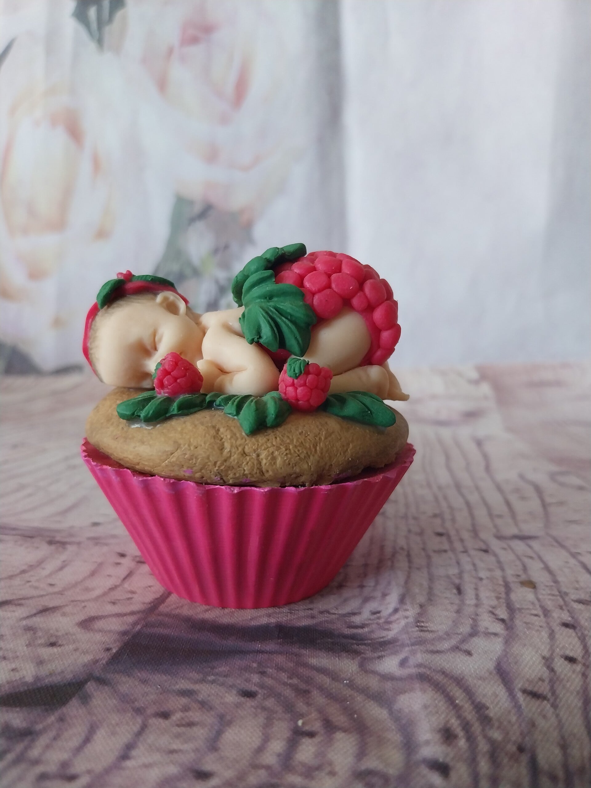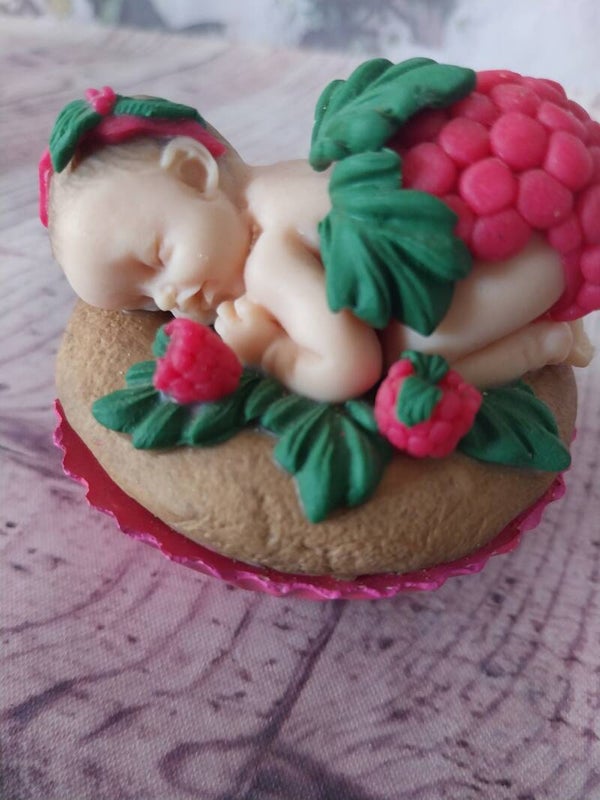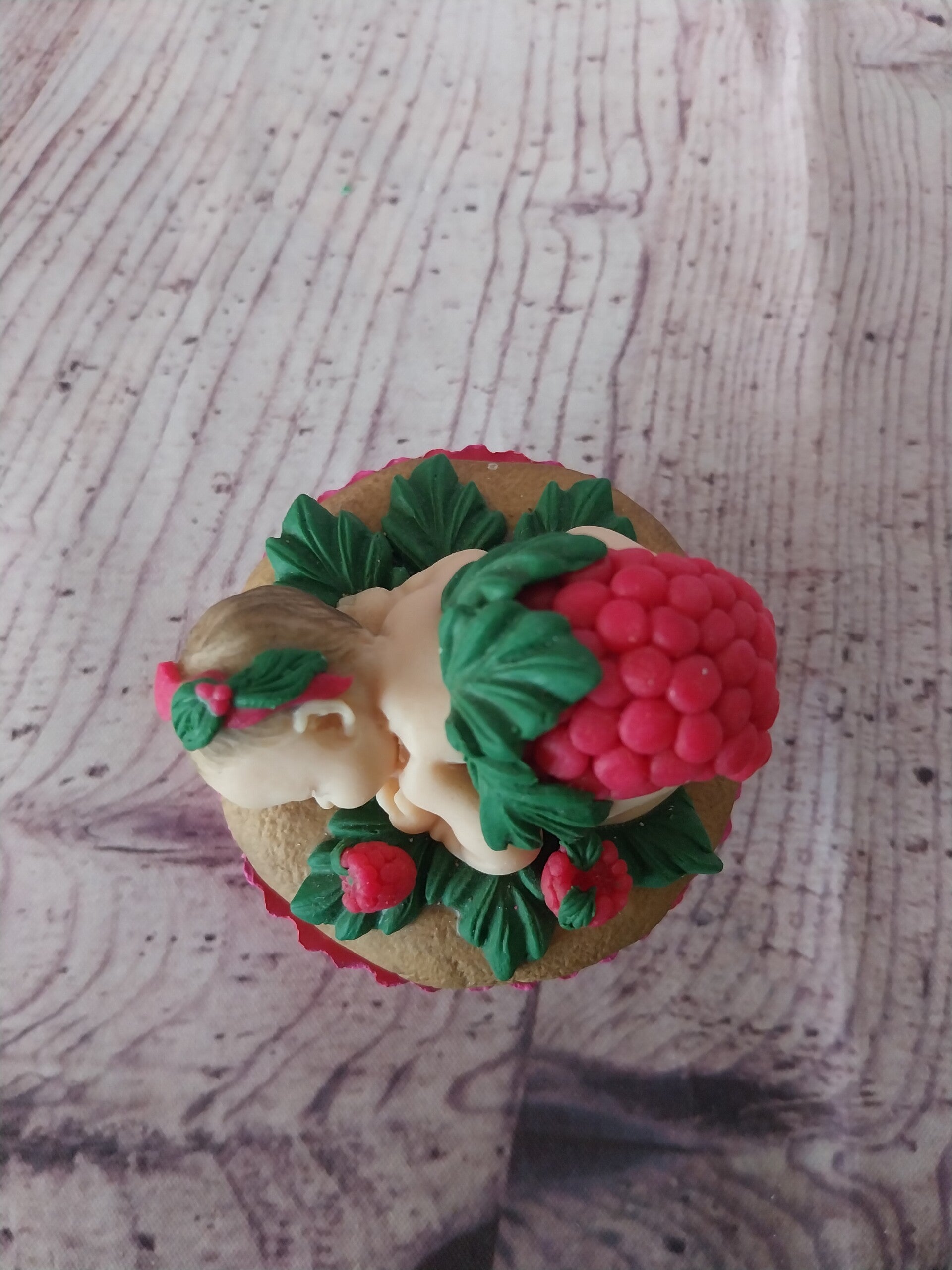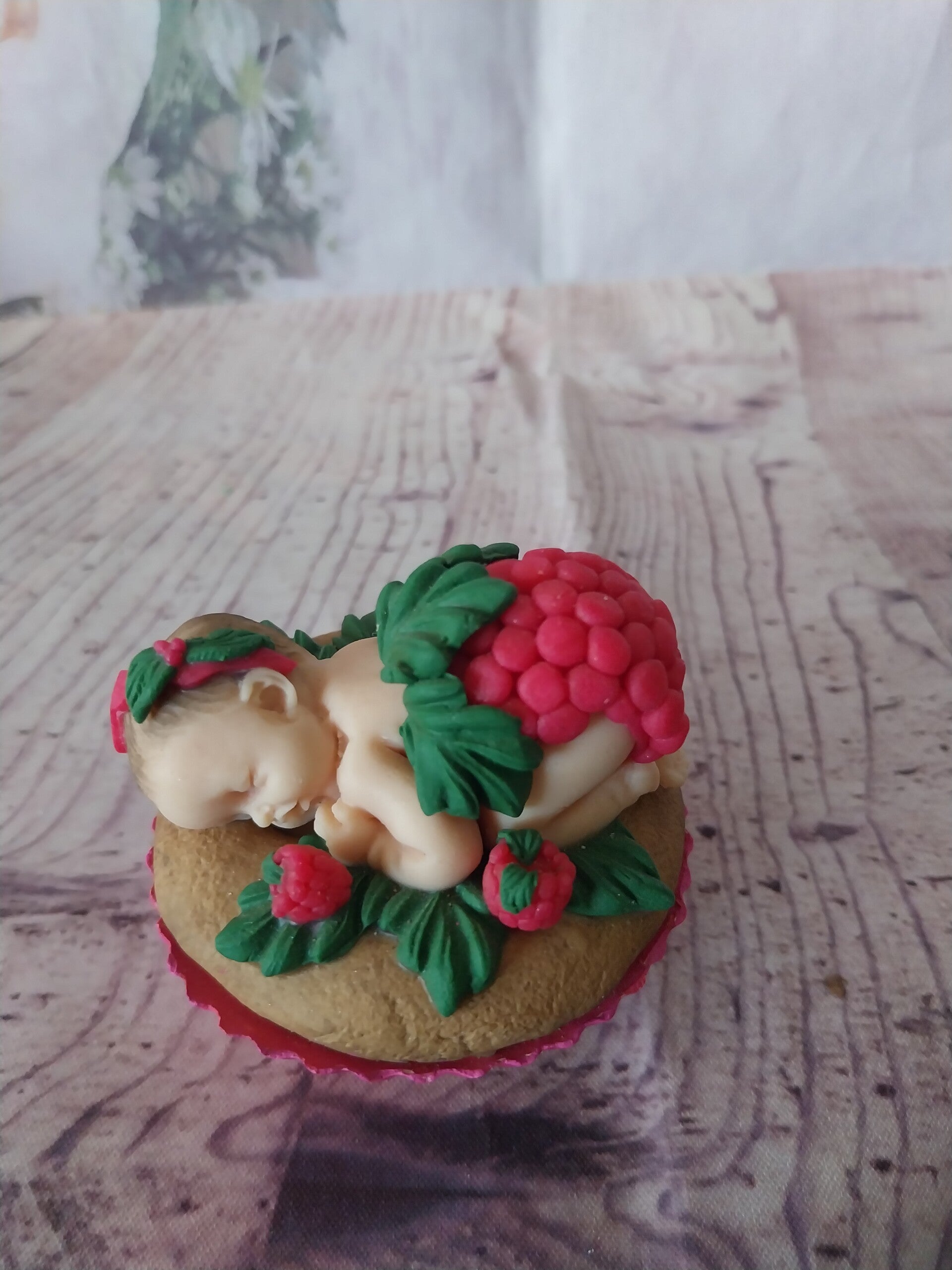 Figurine bébé fimo fille framboise sur cupcake en plâtre céramique et fimo.