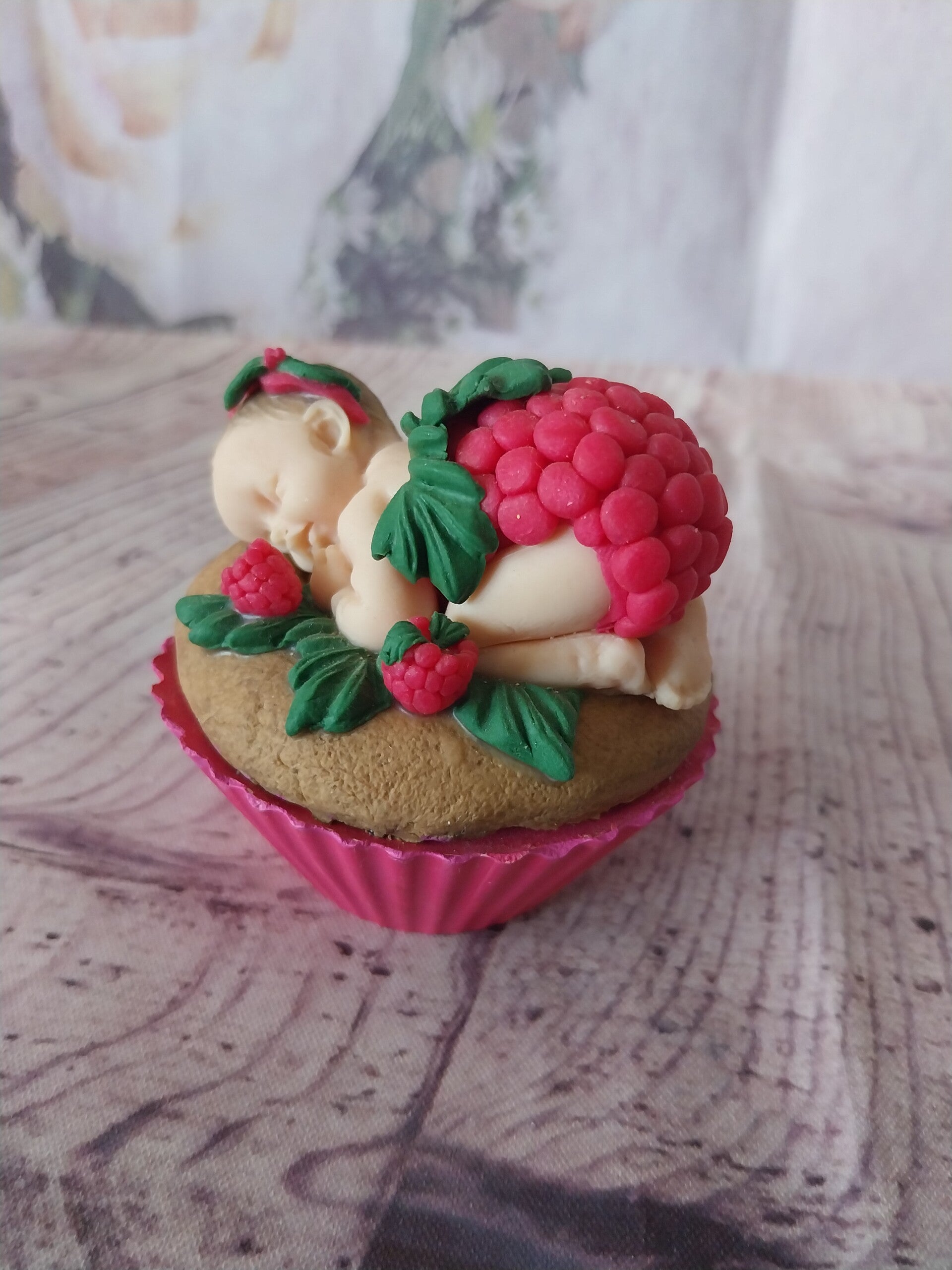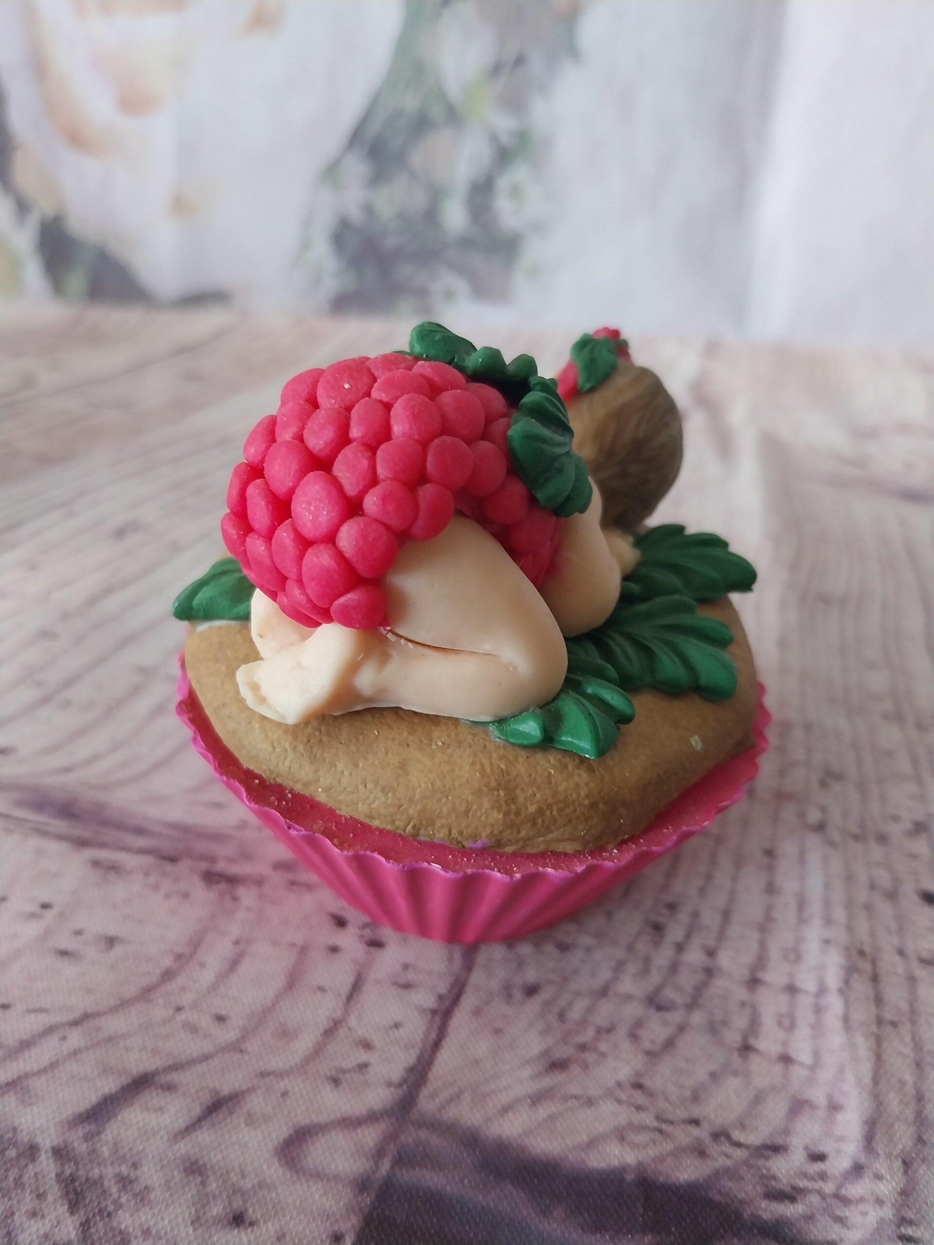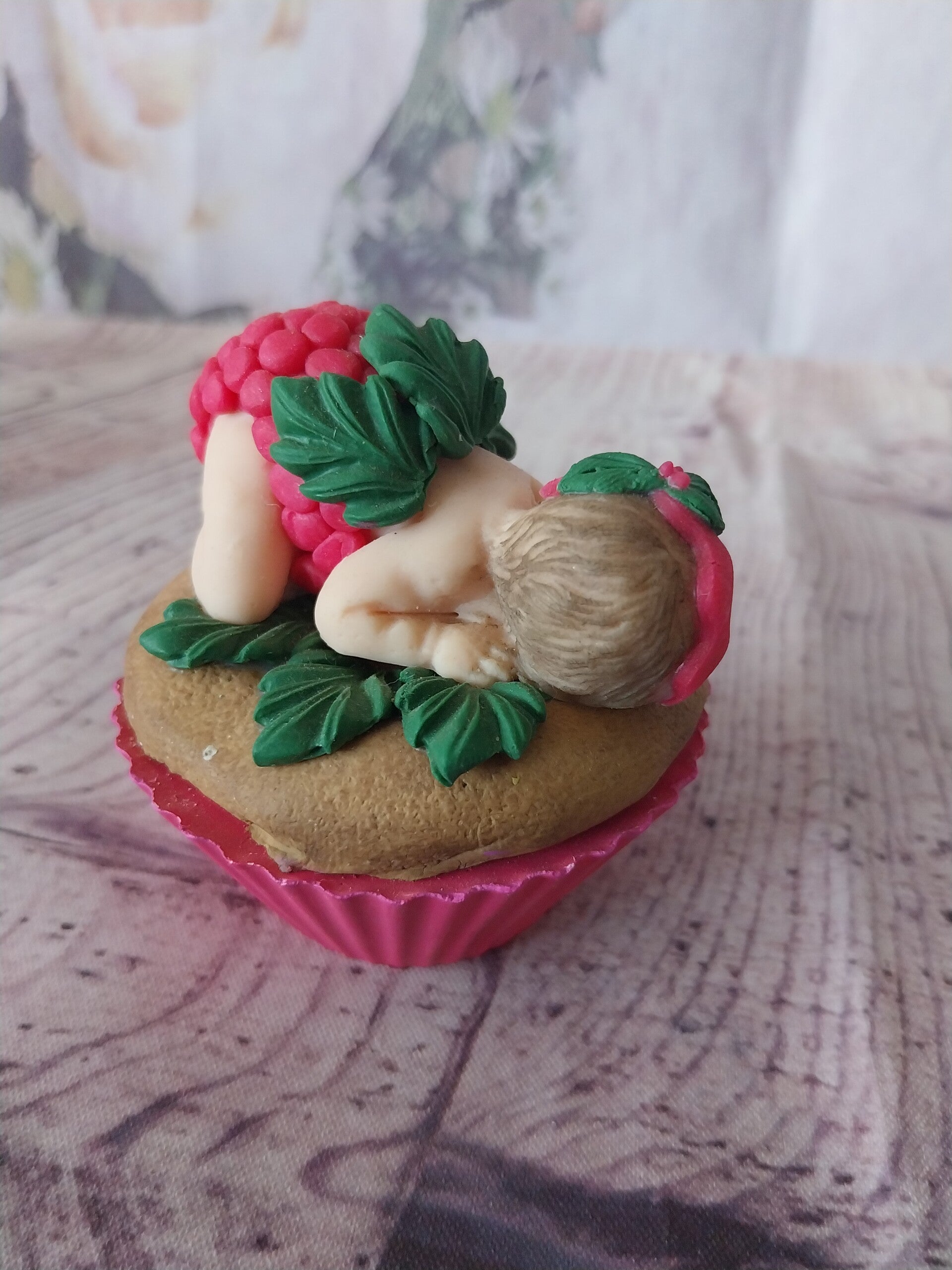 Figurine bébé fimo fille framboise sur cupcake en plâtre céramique et fimo.