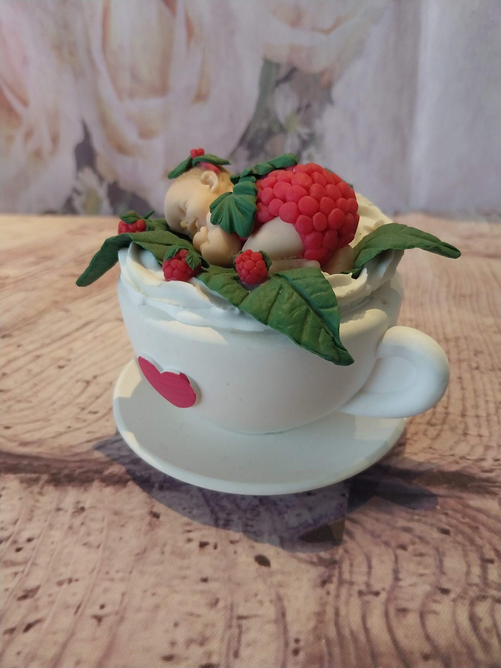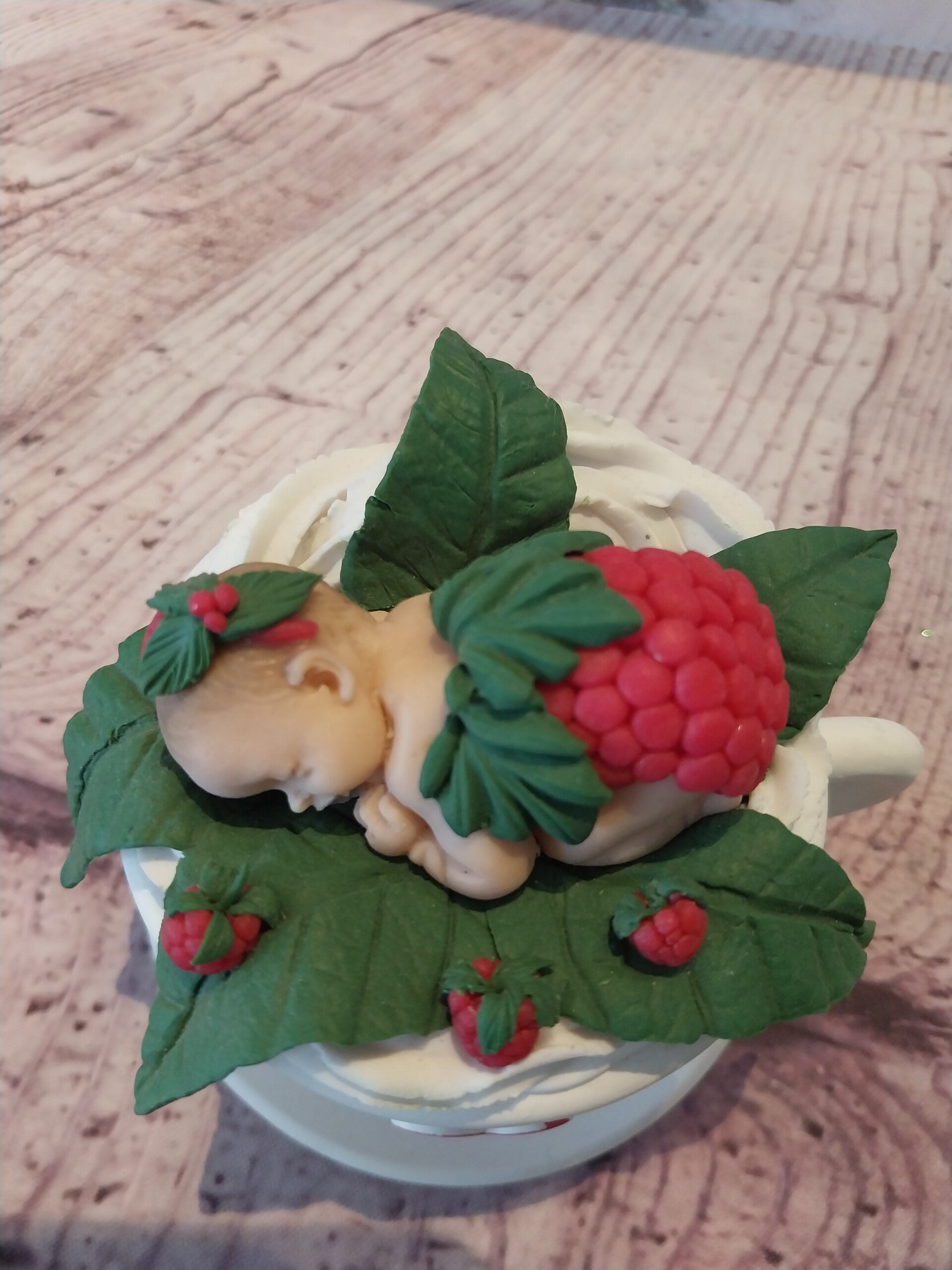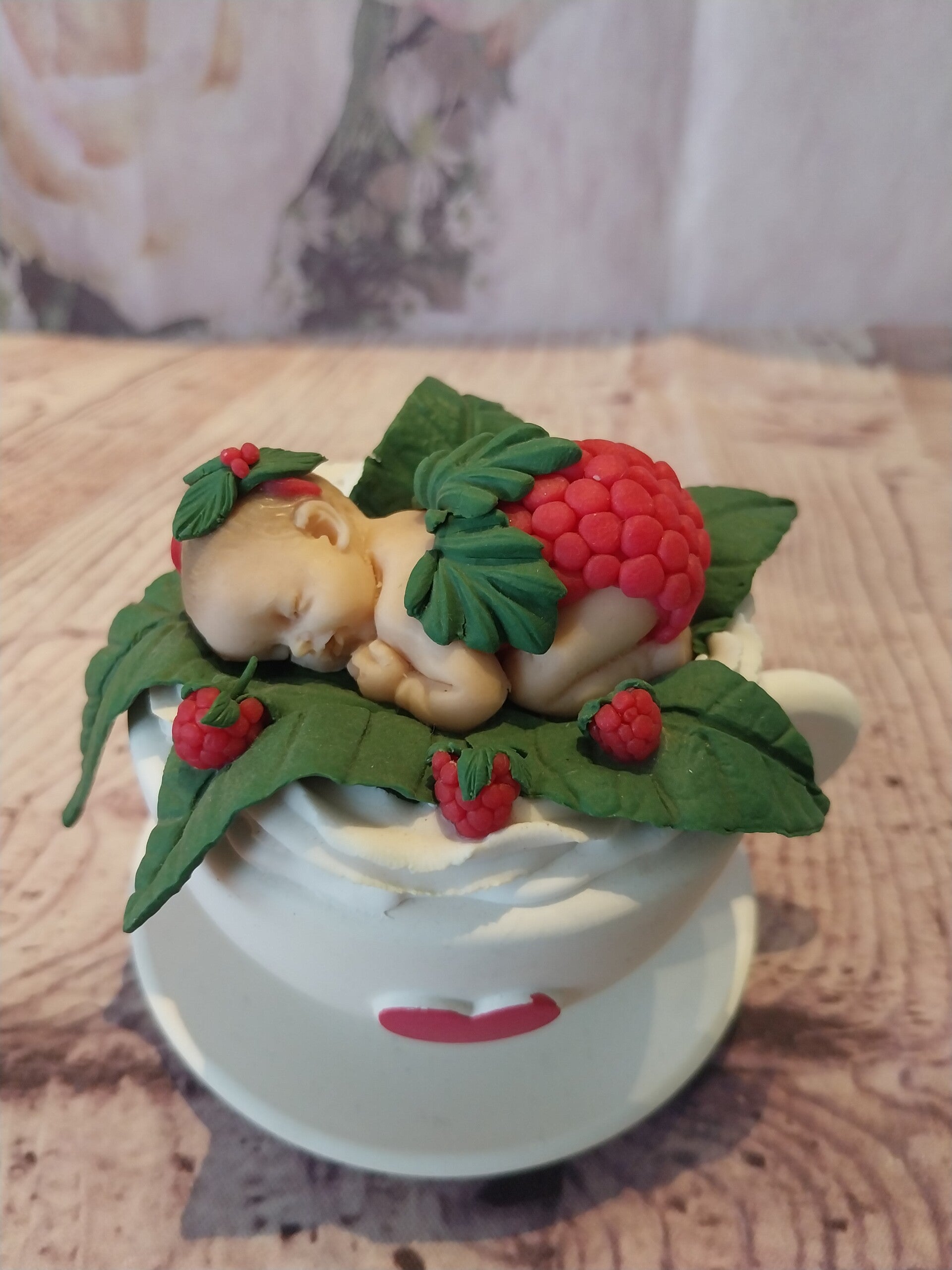 Figurine bébé fimo fille framboise sur tasse en plâtre céramique et fimo