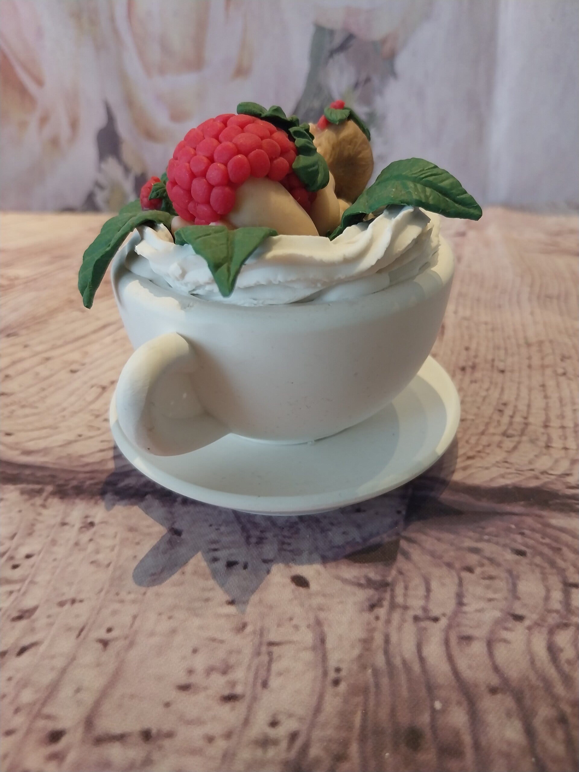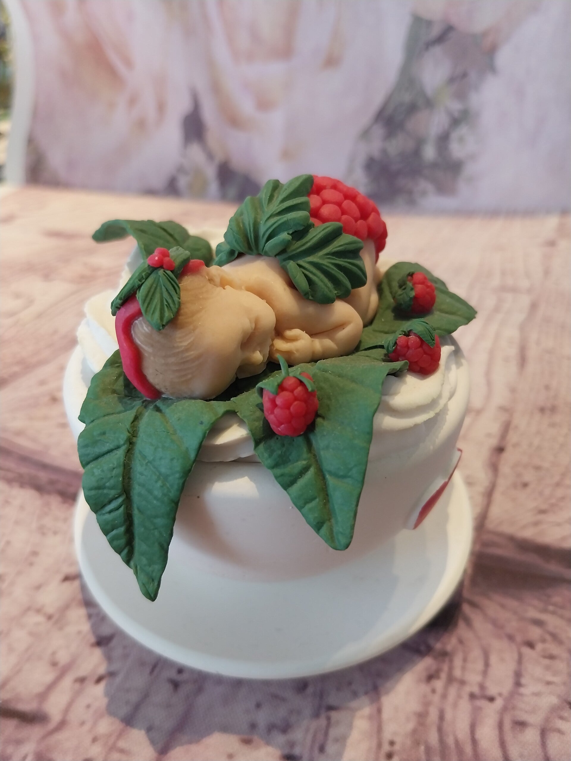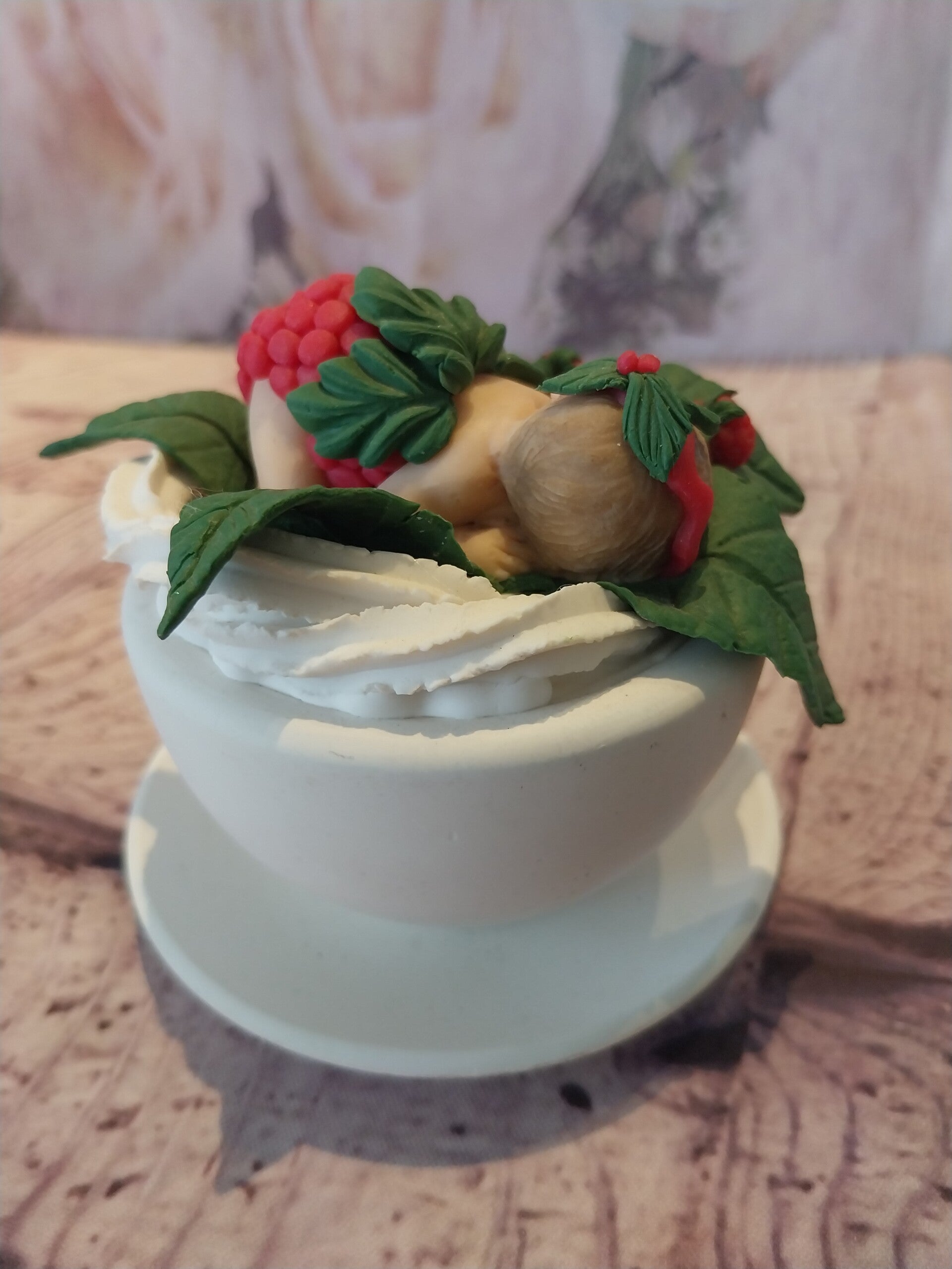Figurine bébé fimo fille framboise sur tasse en plâtre céramique et fimo