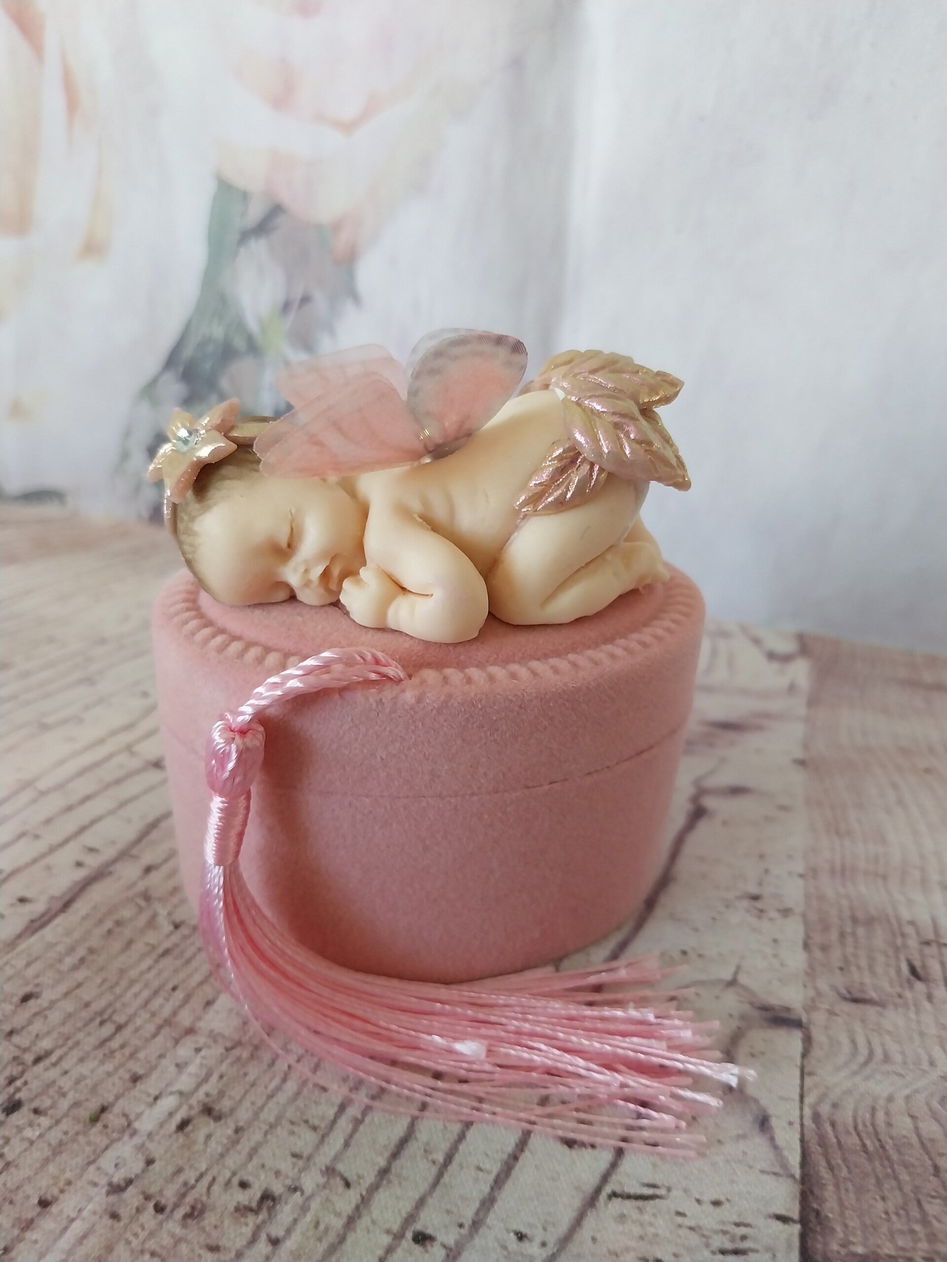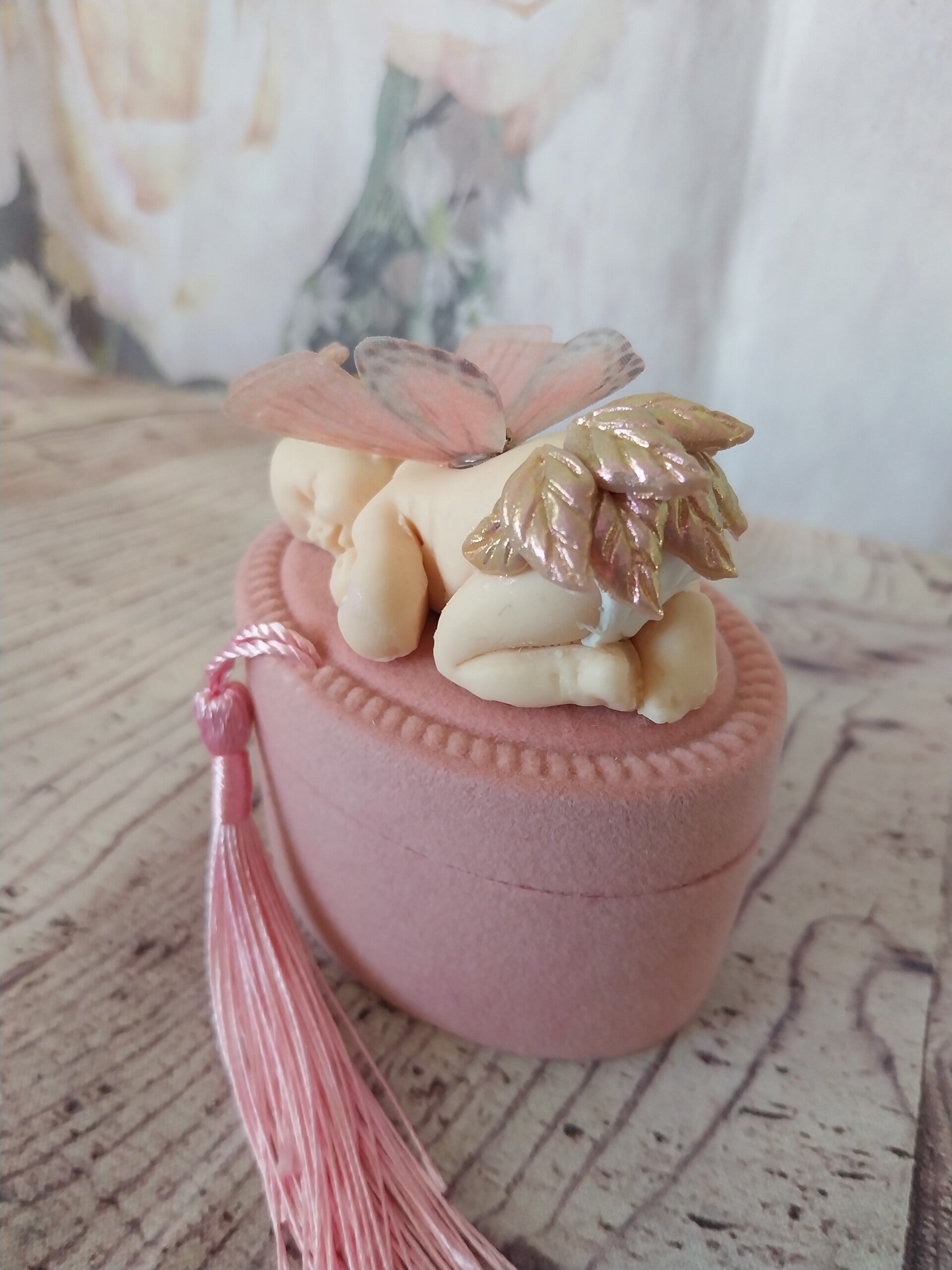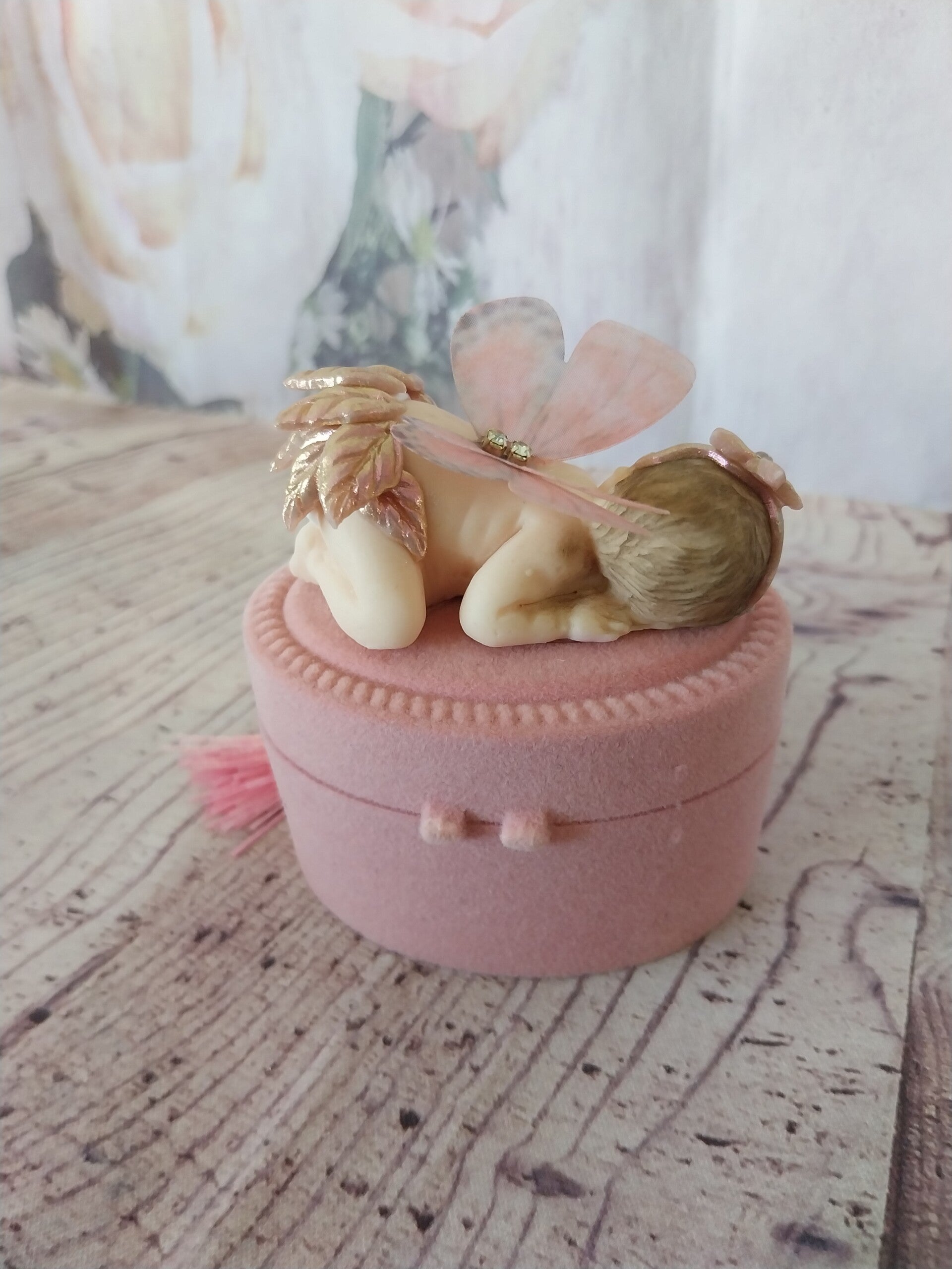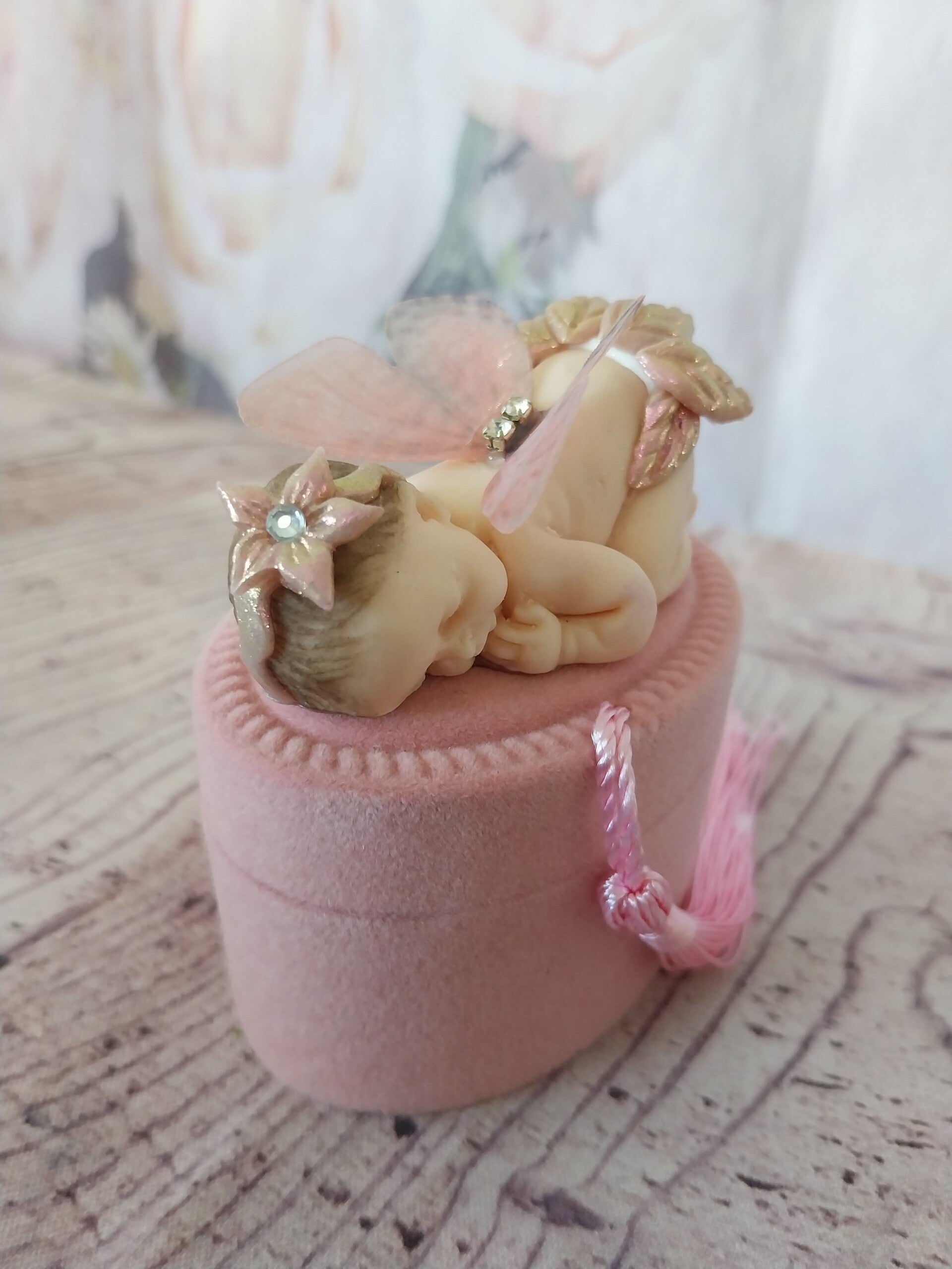 Figurine bébé fimo fille papillon sur une boîte en plastique rose velours.
