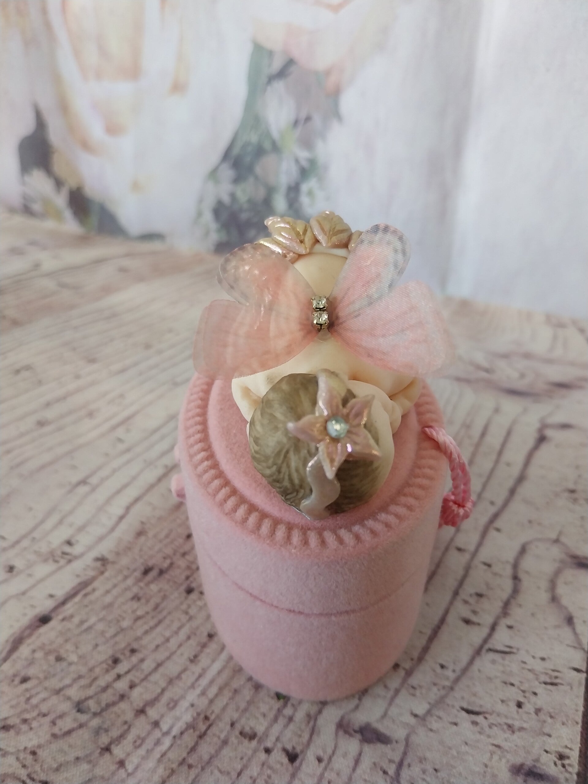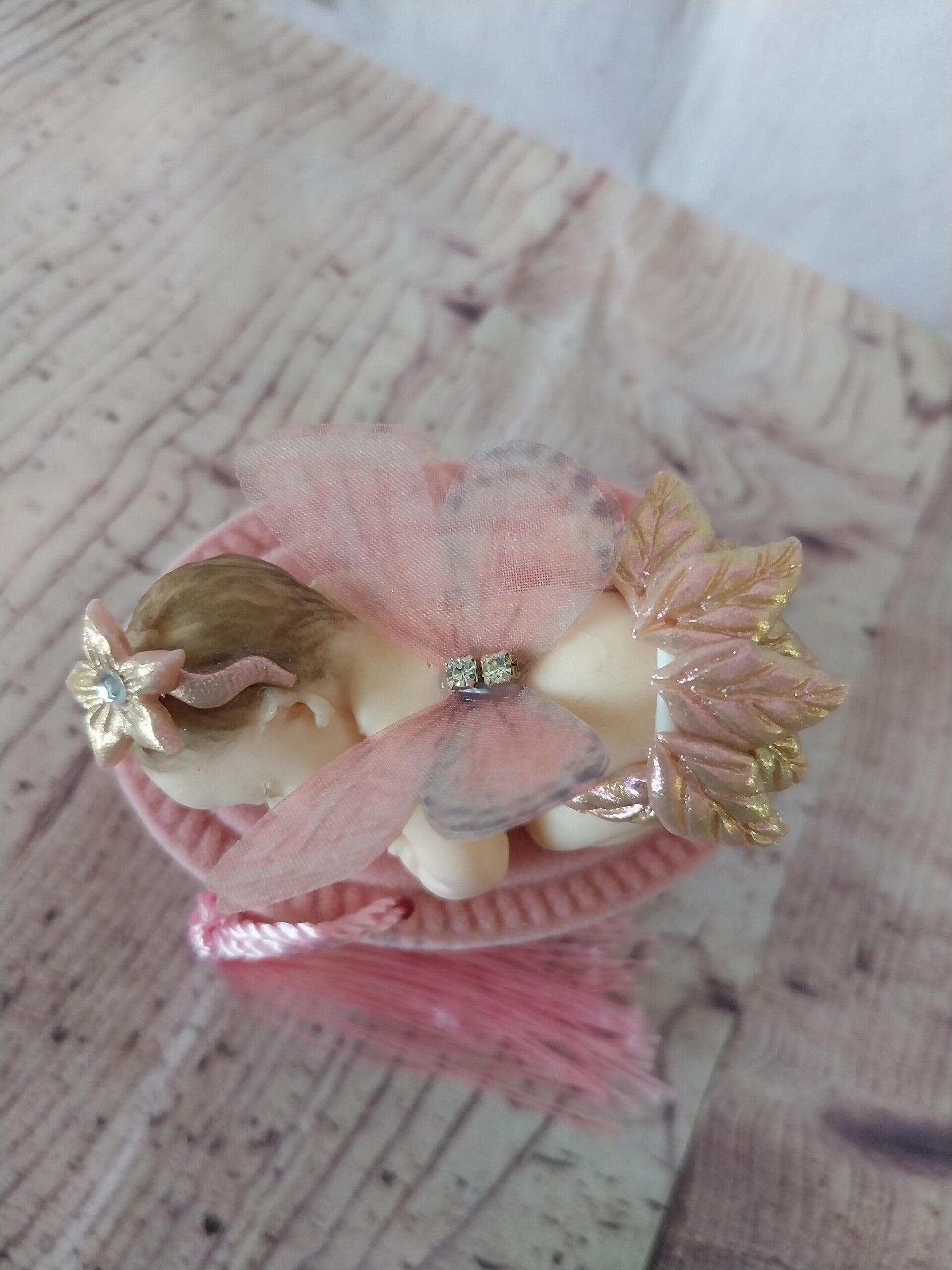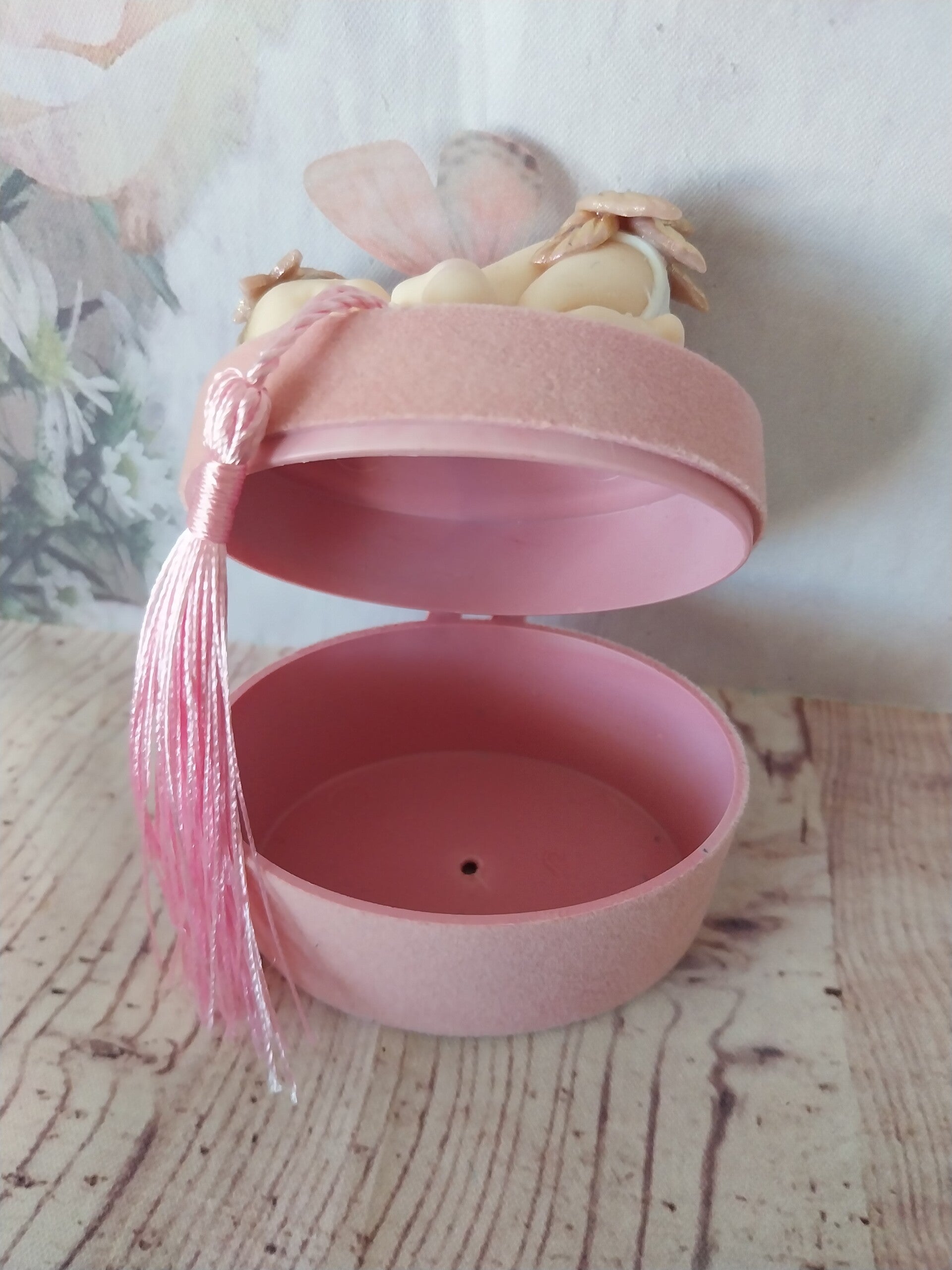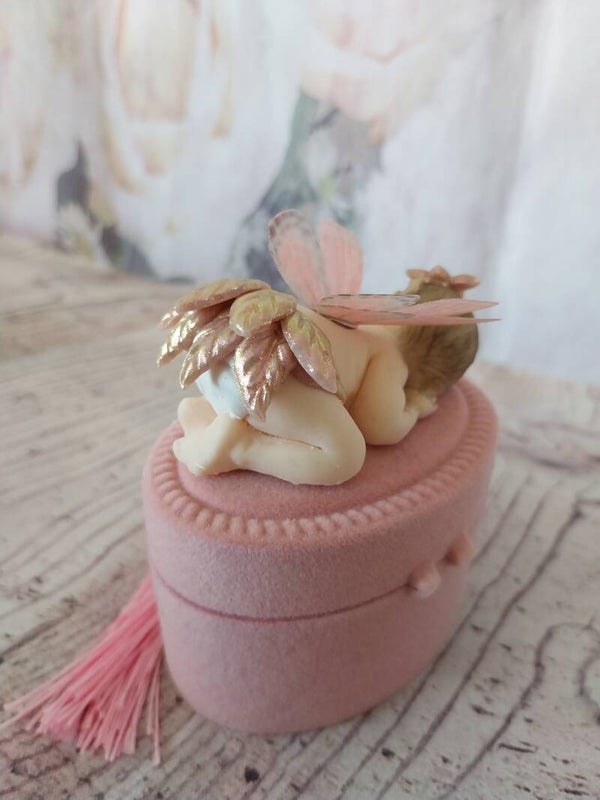 Figurine bébé fimo fille papillon sur une boîte en plastique rose velours.