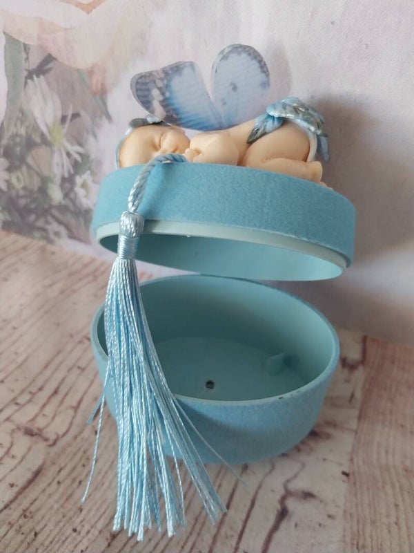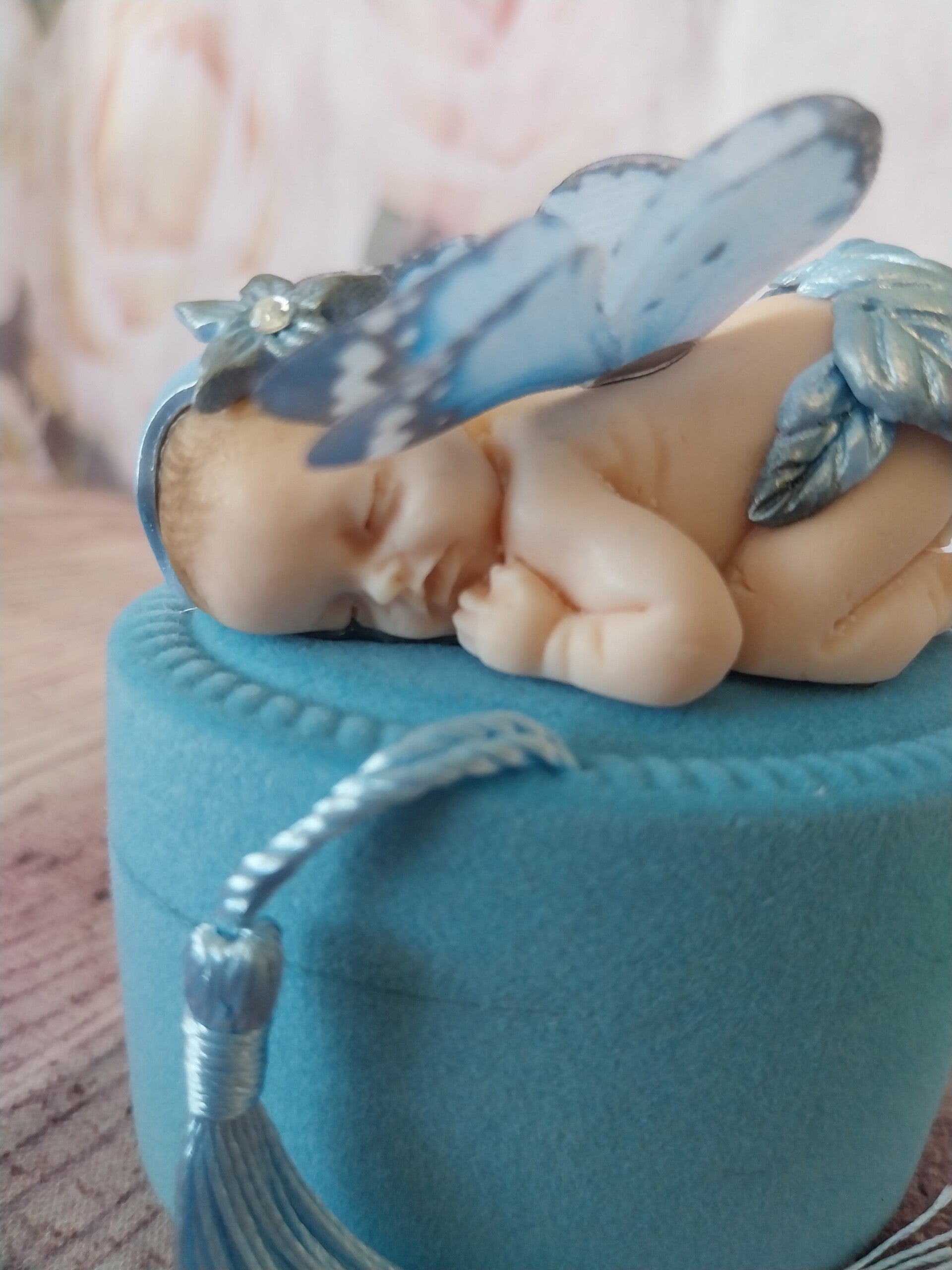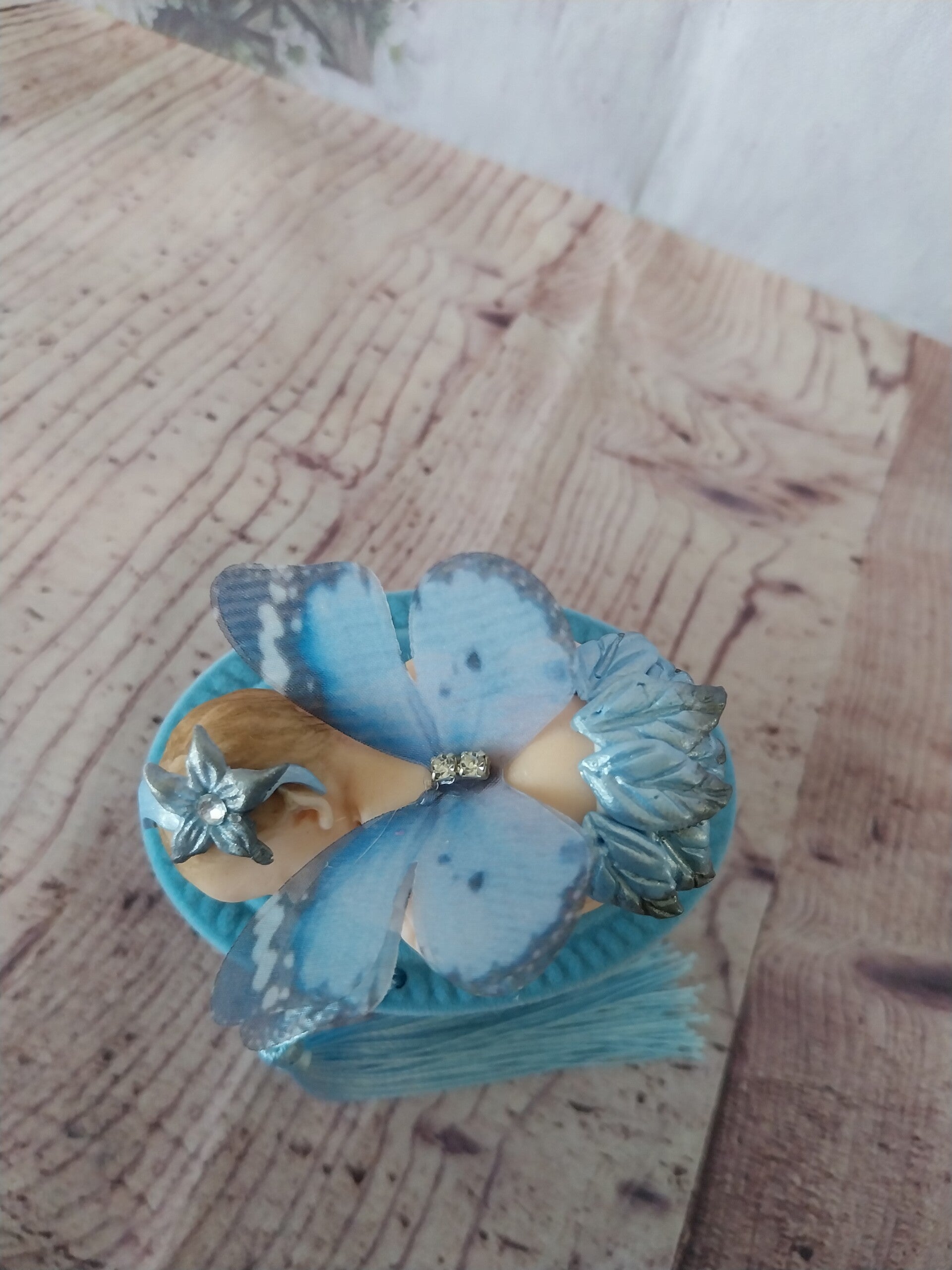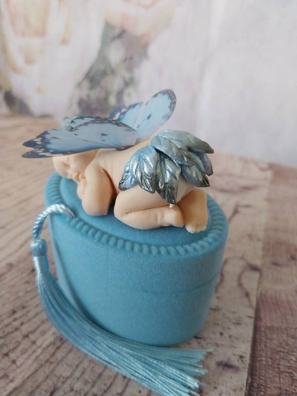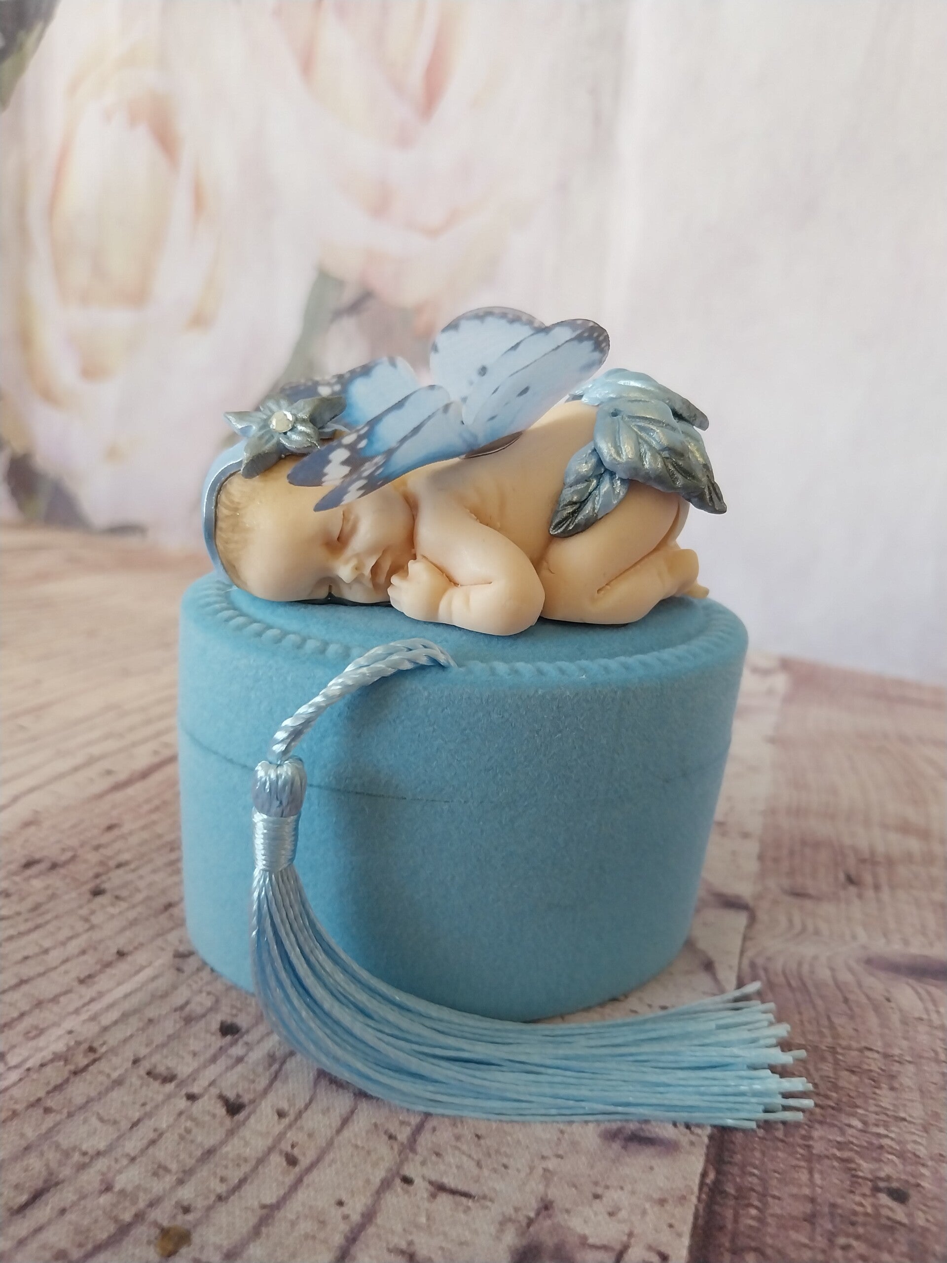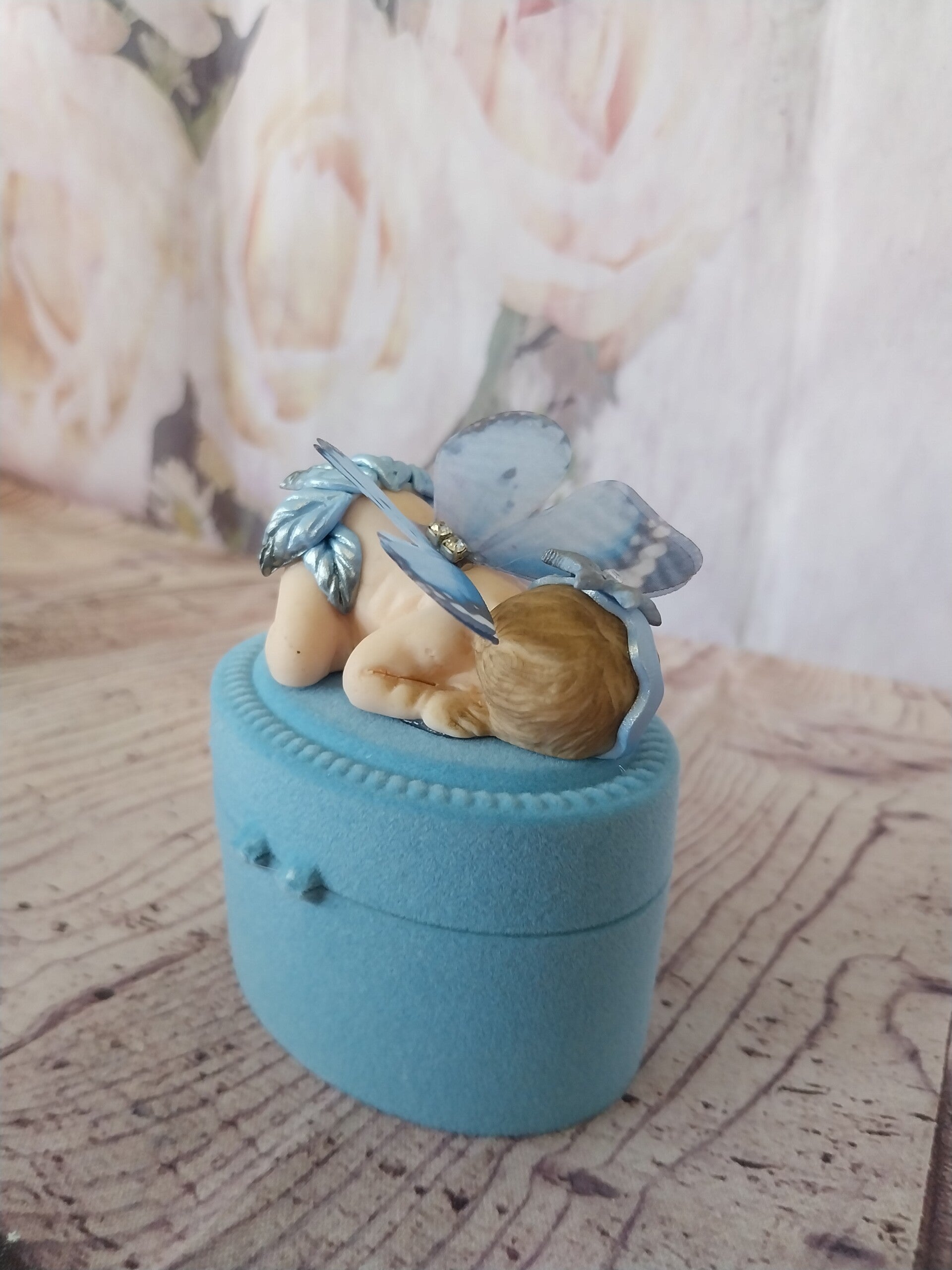 Figurine bébé fimo fille papillon sur une boîte en plastique bleu velours.