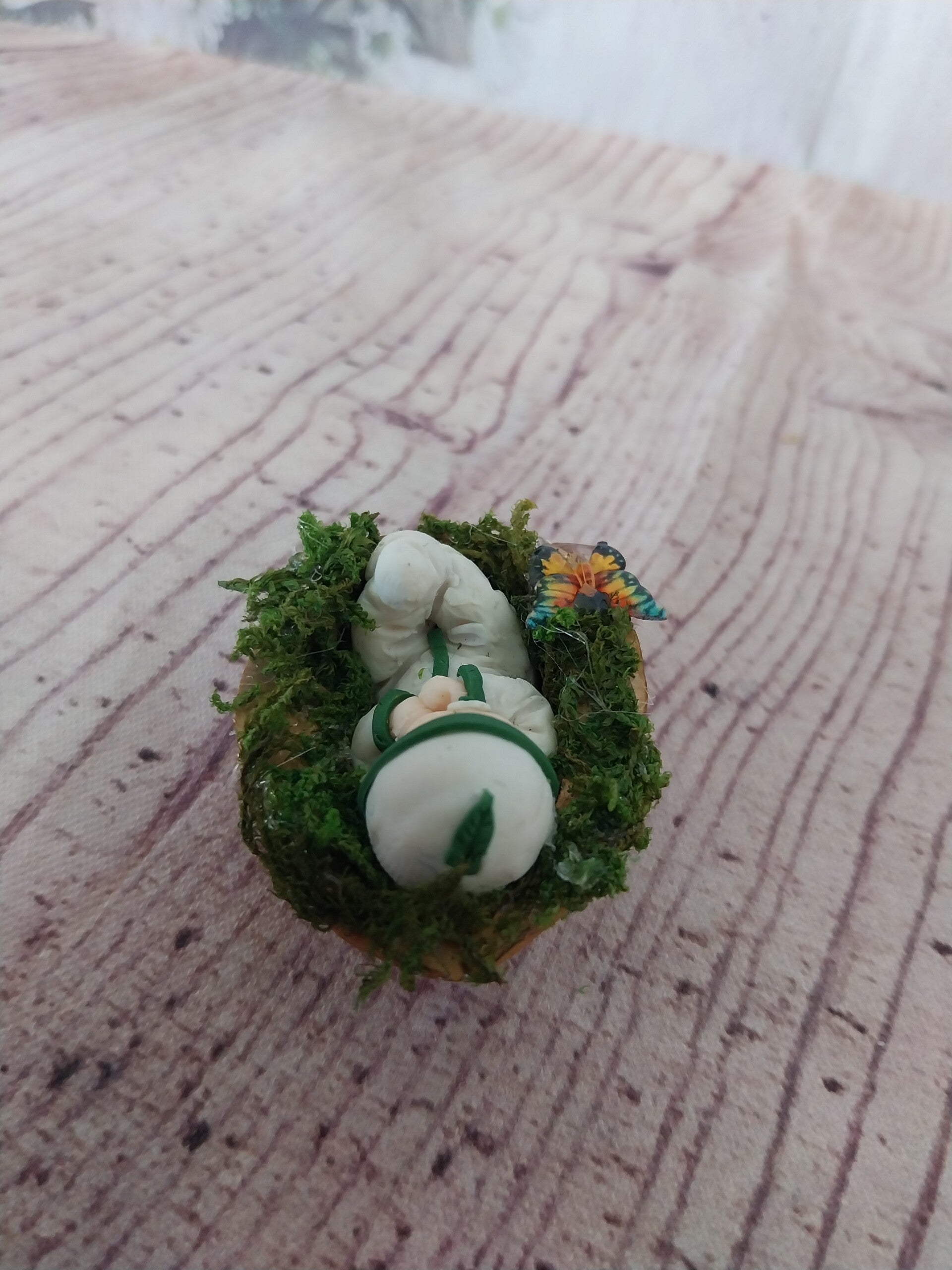 Miniature bébé fimo dans une noix.