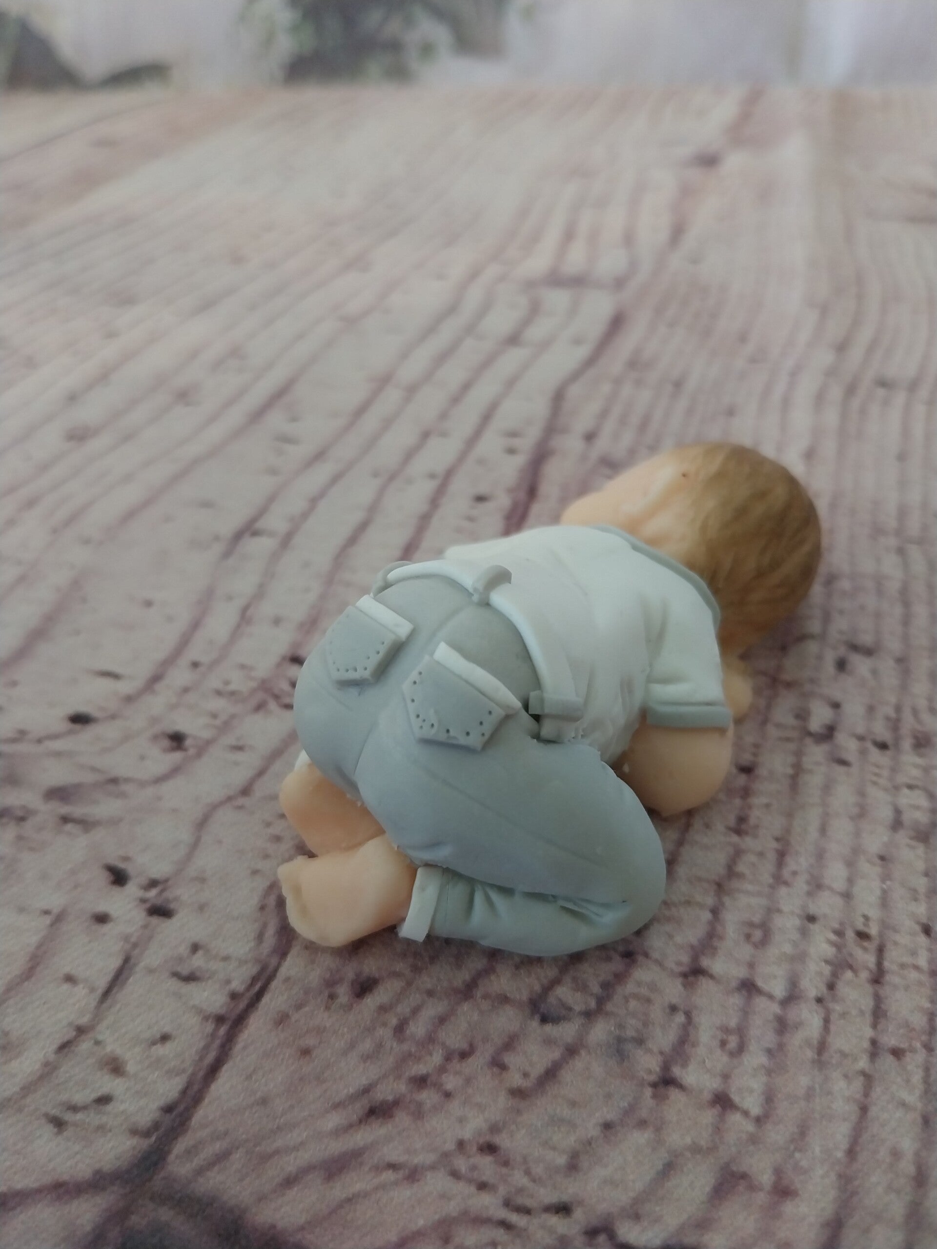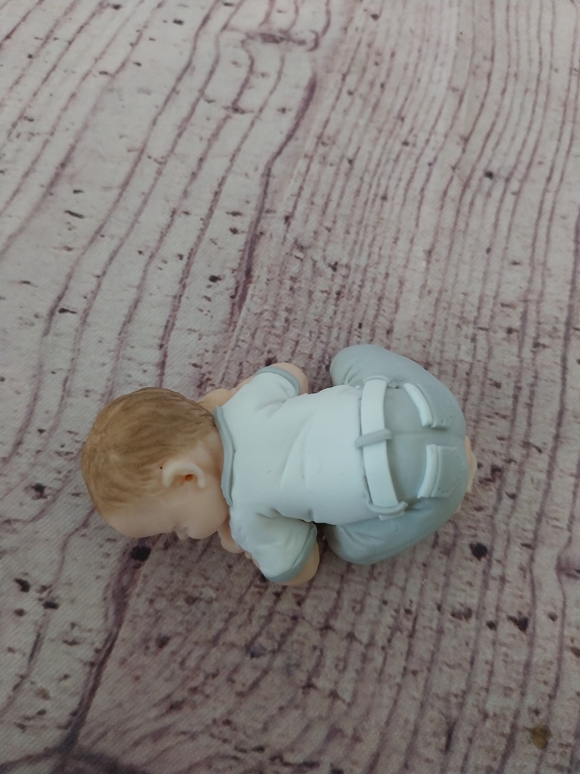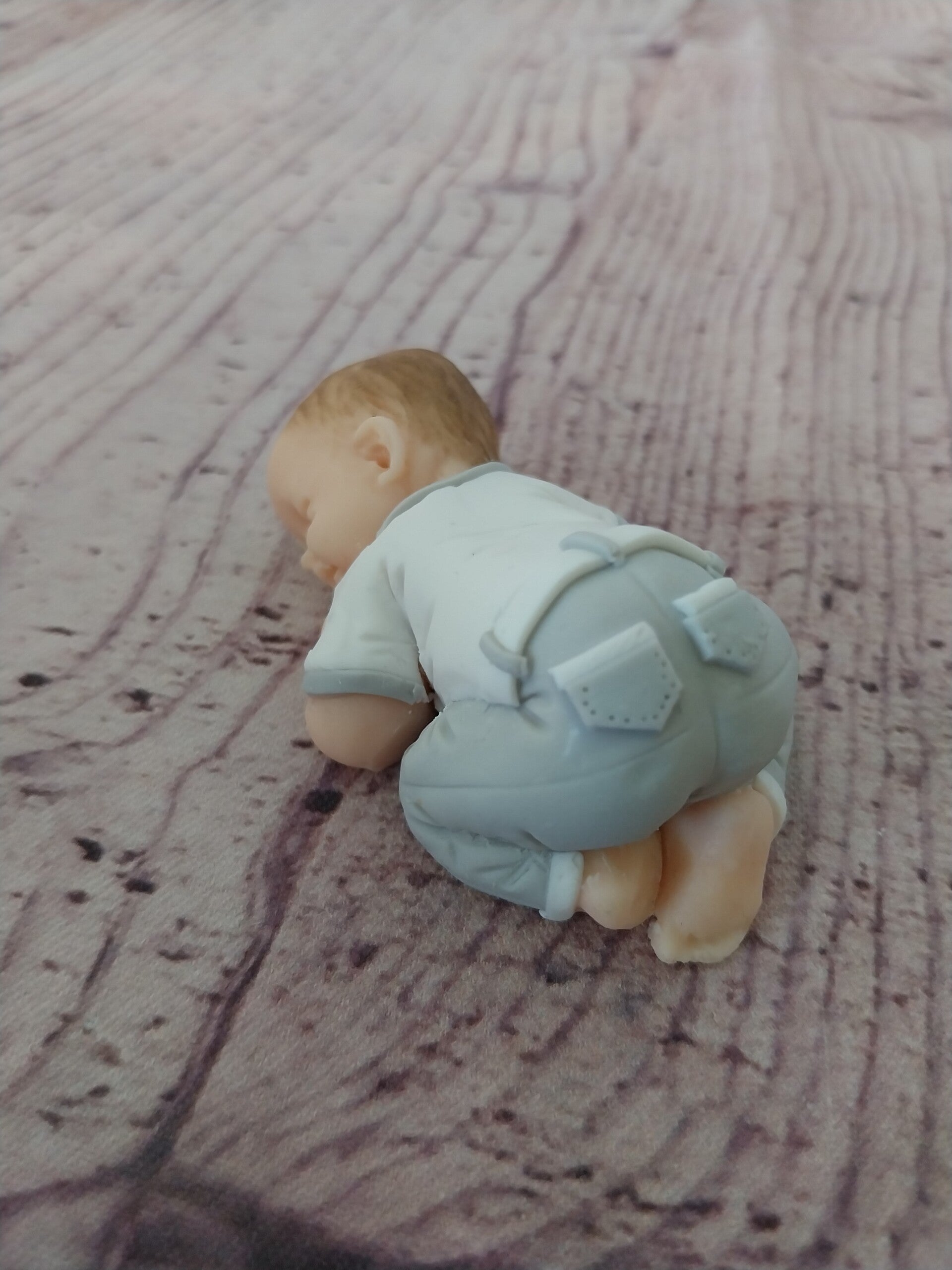 Figurine bébé fimo garçon ( baptême)en pantalon long gris et blanc et haut blanc et gris