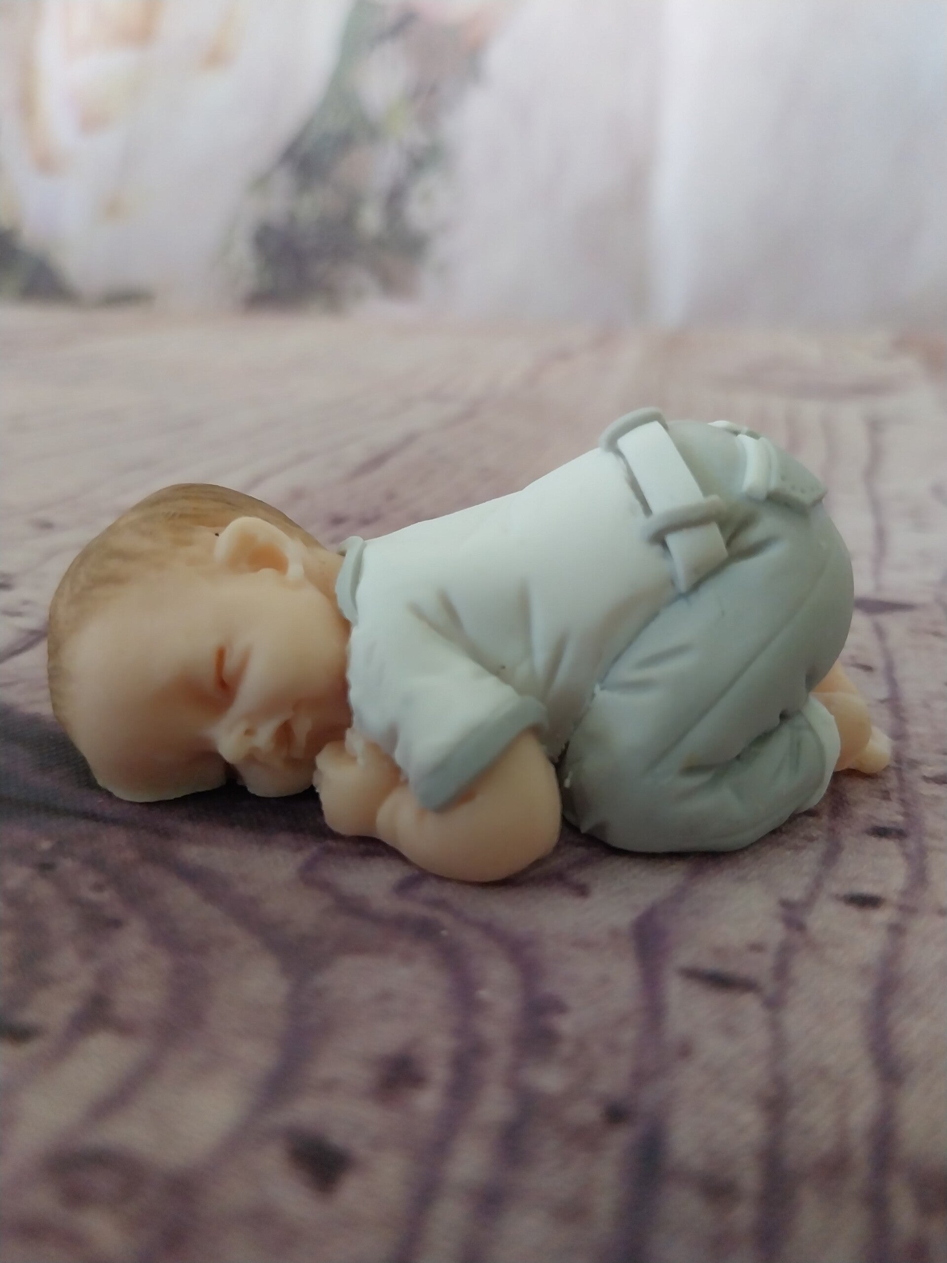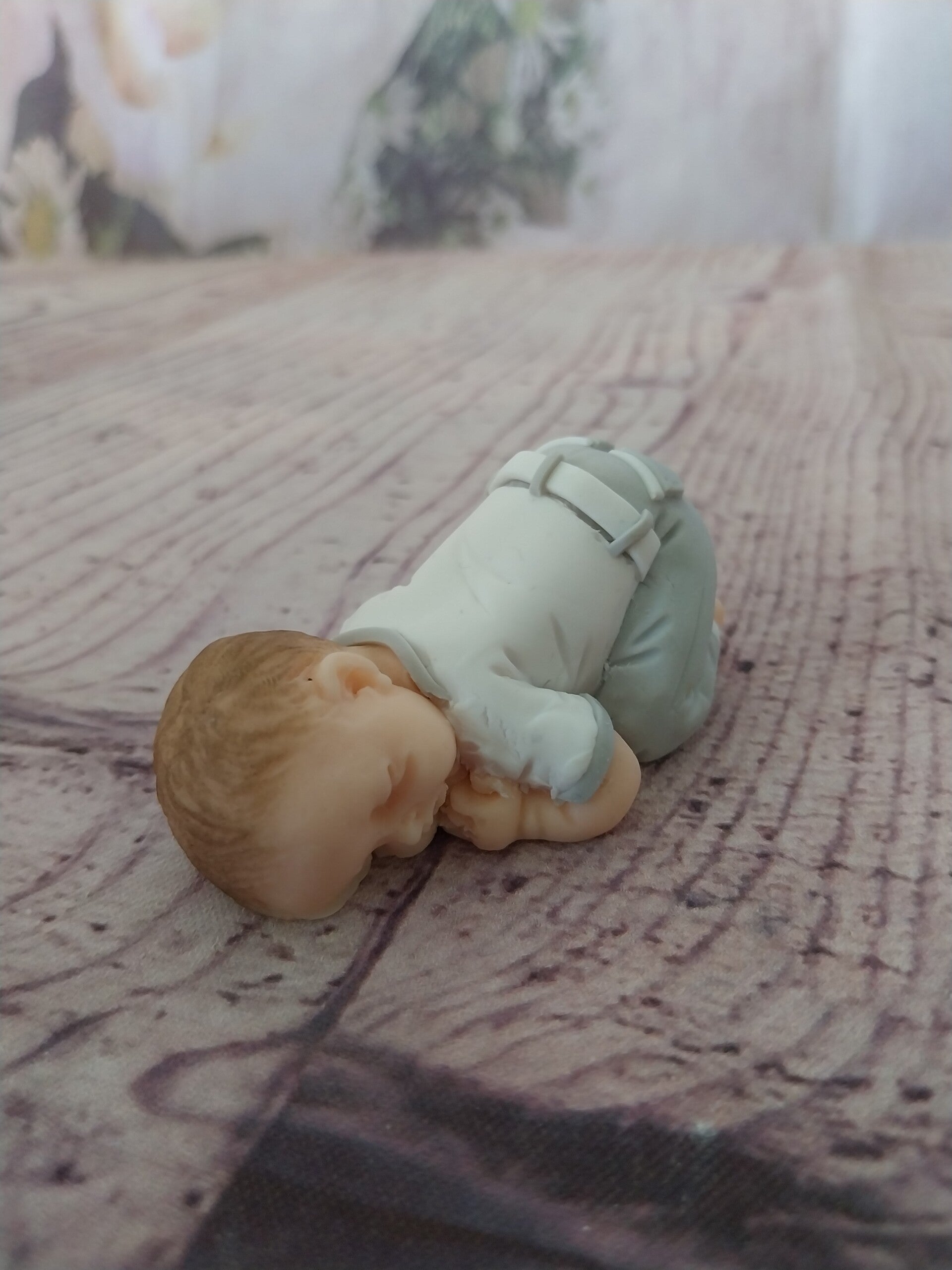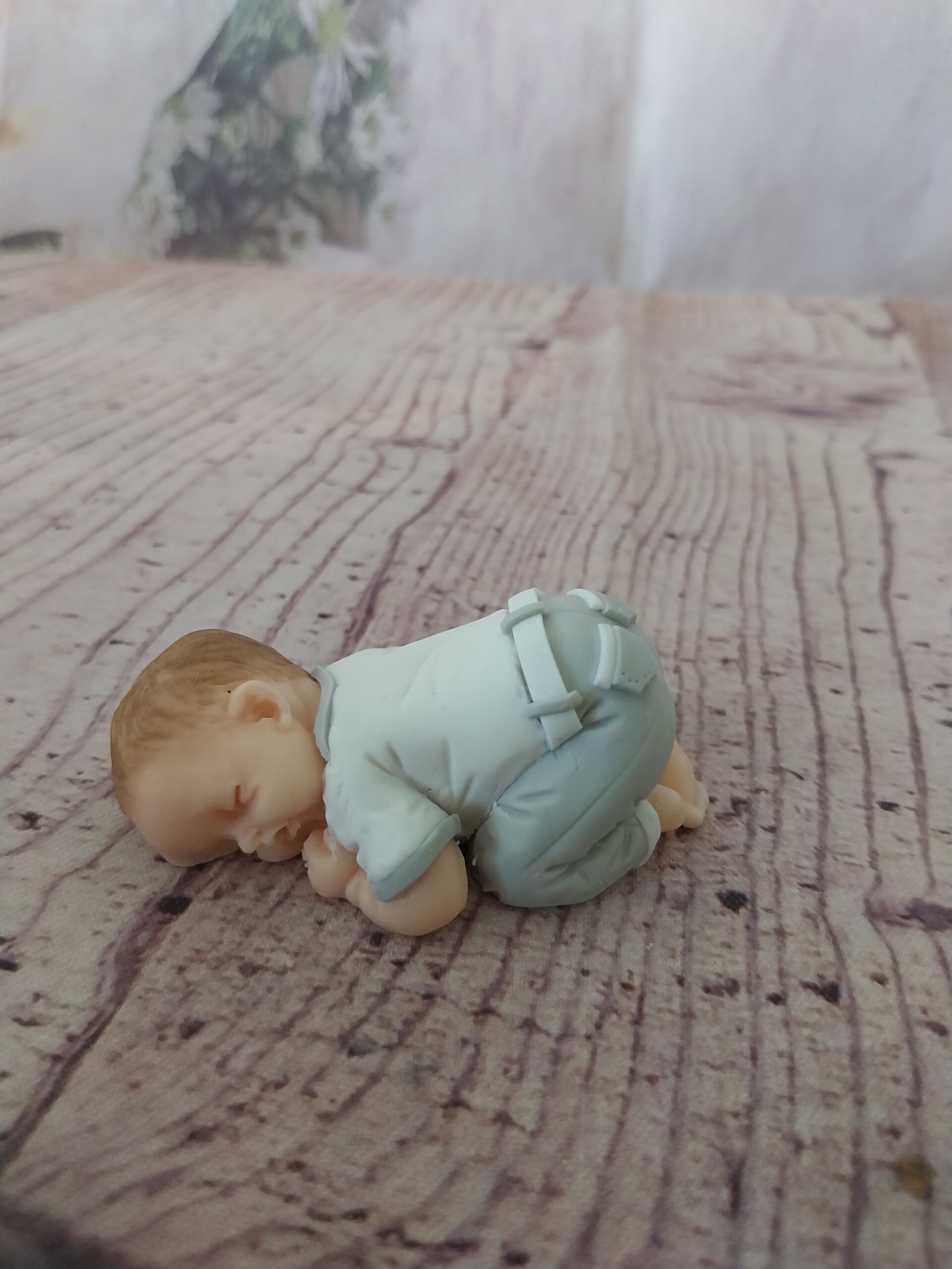 Figurine bébé fimo garçon ( baptême)en pantalon long gris et blanc et haut blanc et gris