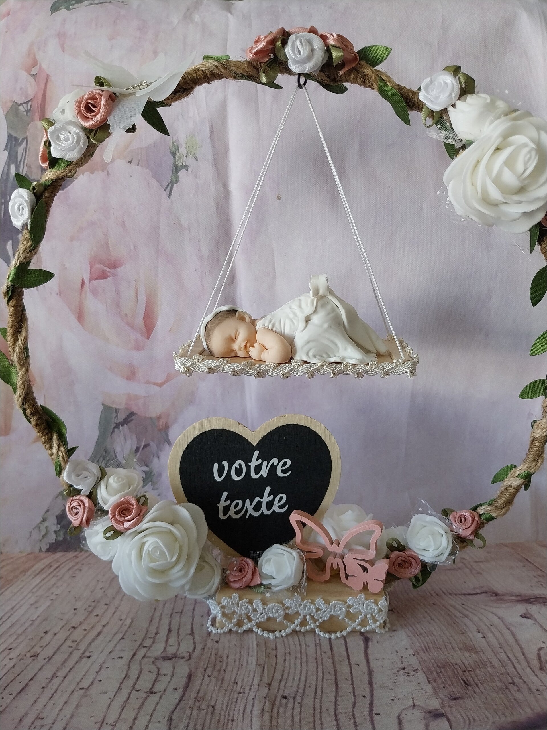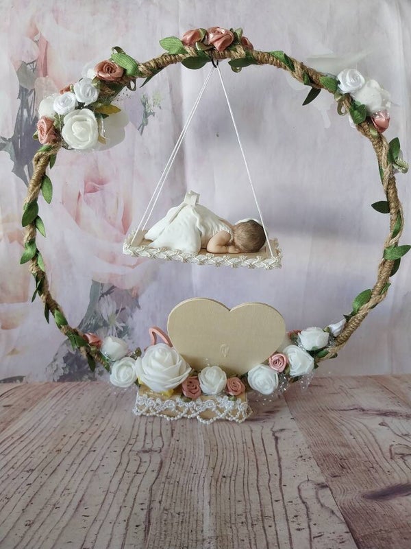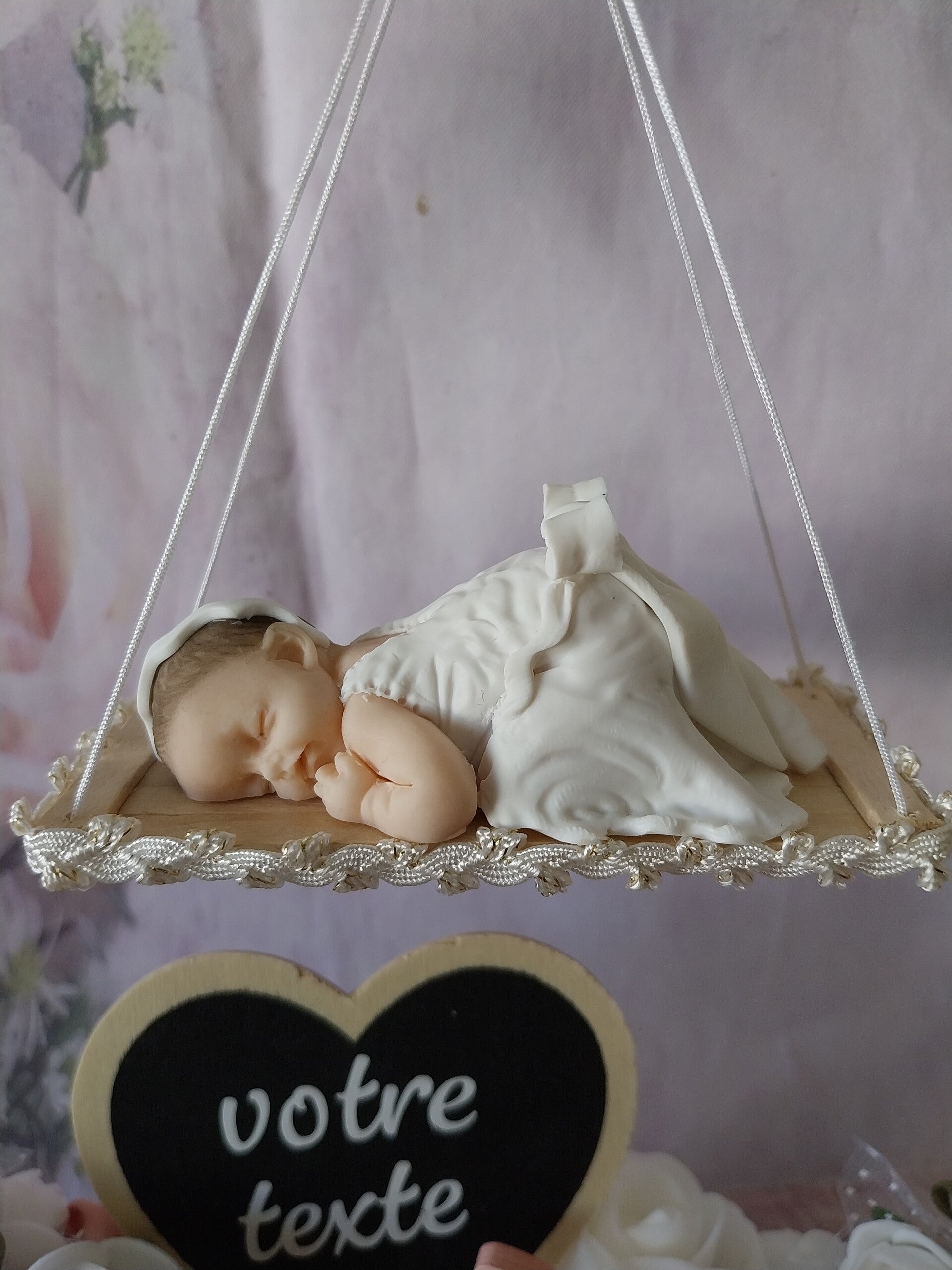 Centre de table avec figurine bébé fimo fille.