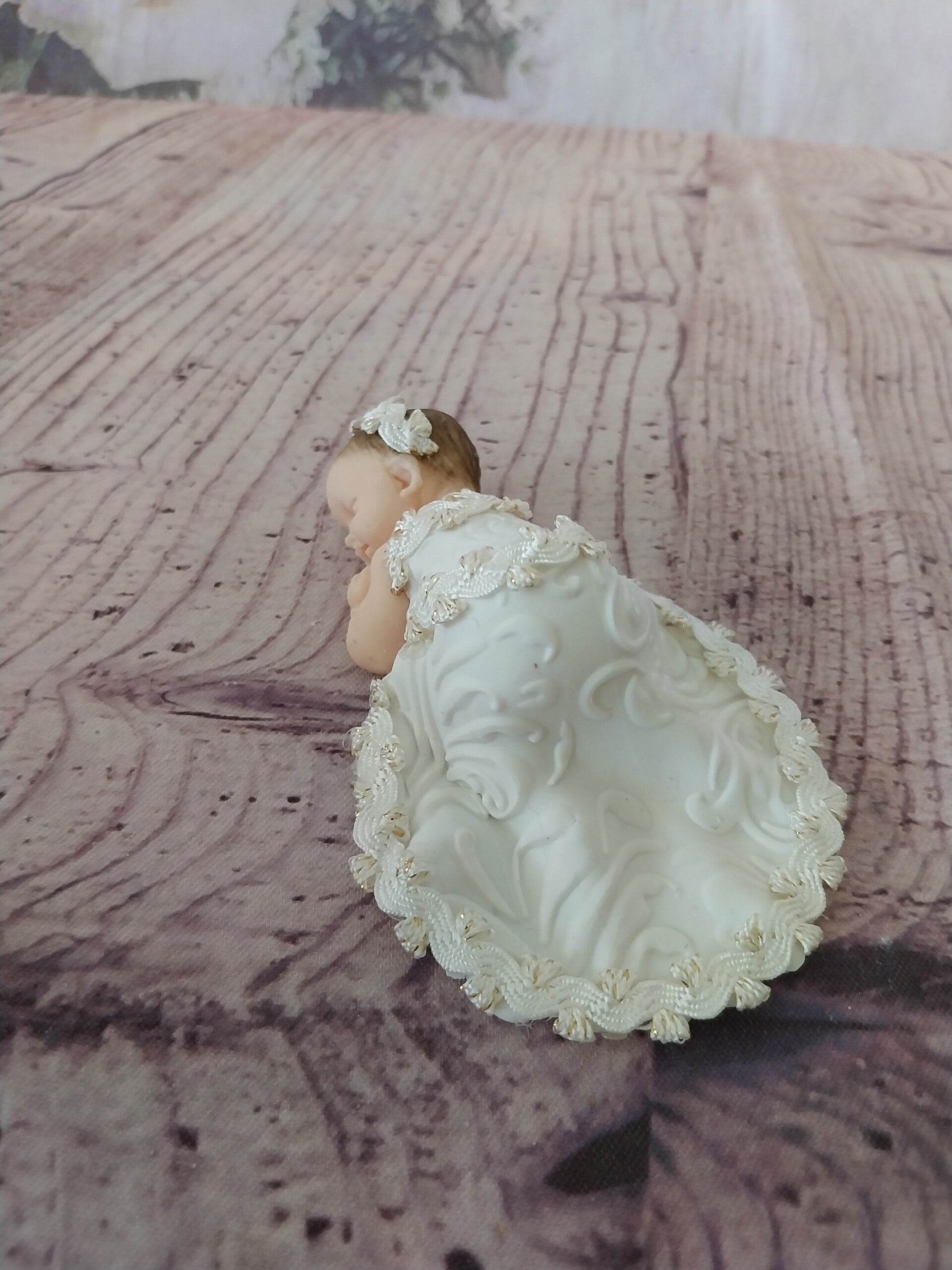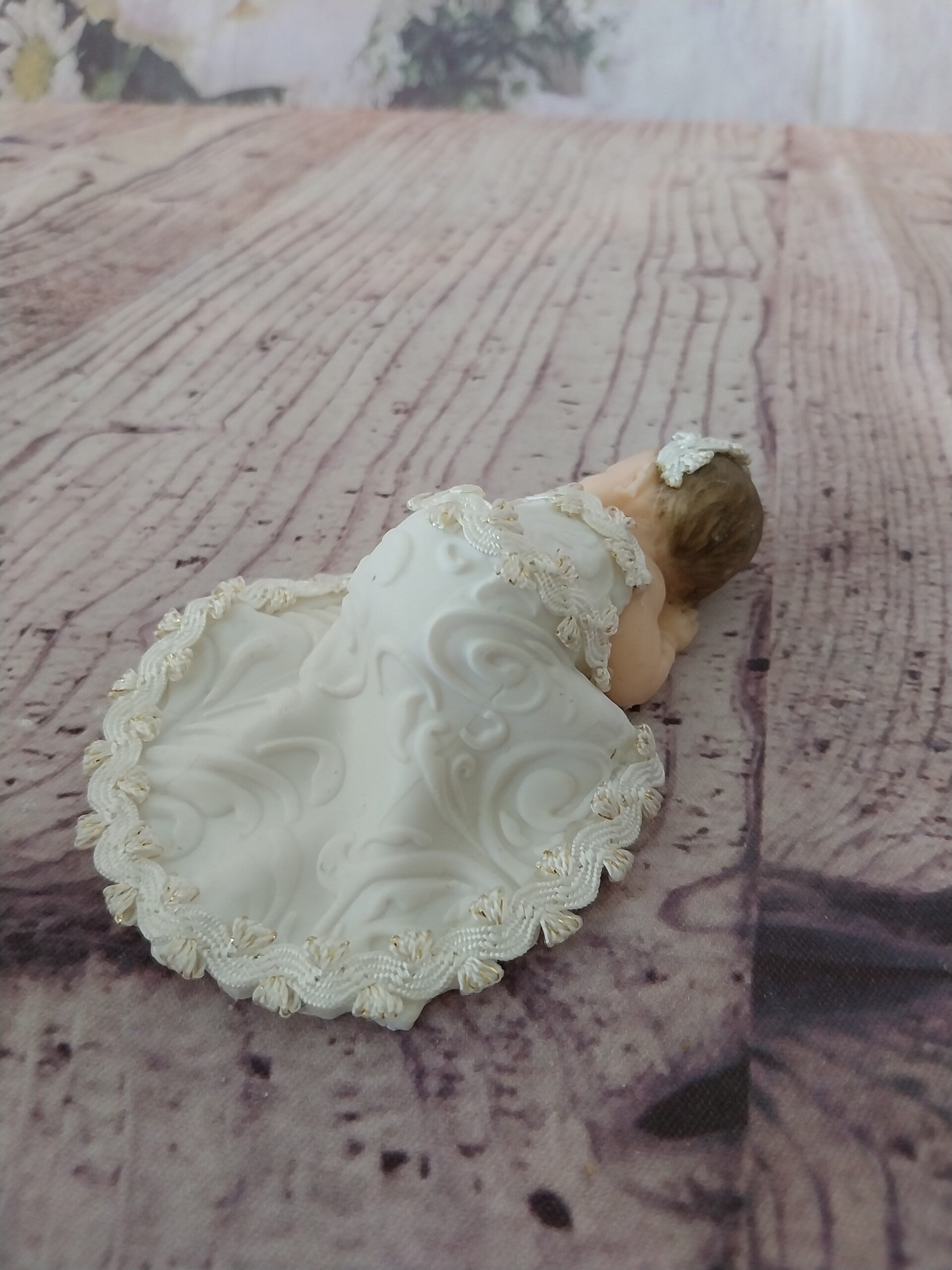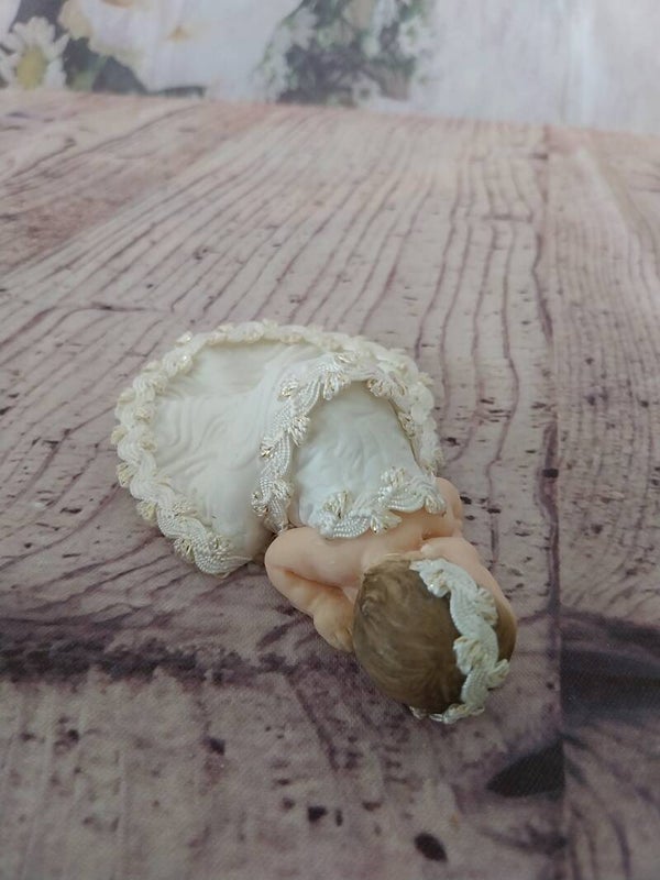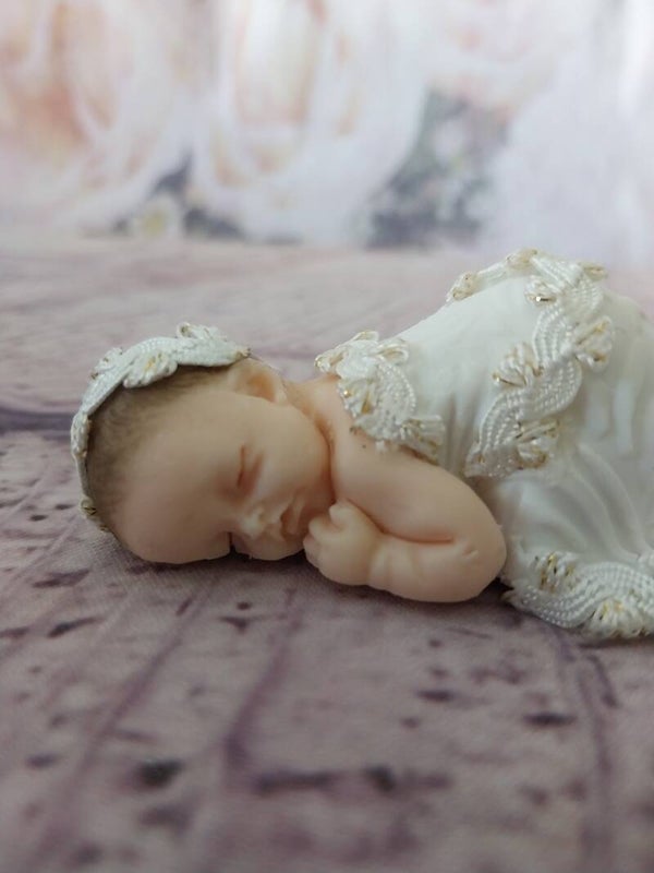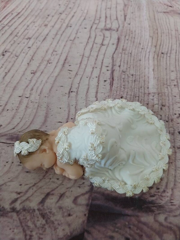 Figurine bébé fimo fille avec robe longue blanche.